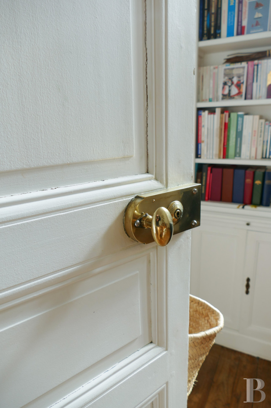 This level can be reached by a wooden staircase. The bright landing, with time-weathered wood stripped flooring, opens onto a corridor leading to three bedrooms, a bathroom and a lavatory. The first bedroom, which faces south, still boasts period wood stripped flooring, mouldings and wood panelling, as well as a black marble fireplace with discrete veining. A modern office space with shelves has been discretely incorporated into this room. The second, north-facing bedroom has painted wood panelling as well as period wood stripped flooring and opens into a shower room. A third bedroom, also facing north, boasts a fireplace with a grey marble mantelpiece. A functional bathroom that is bathed in light and decorated in white and sand-coloured tones, faces south.