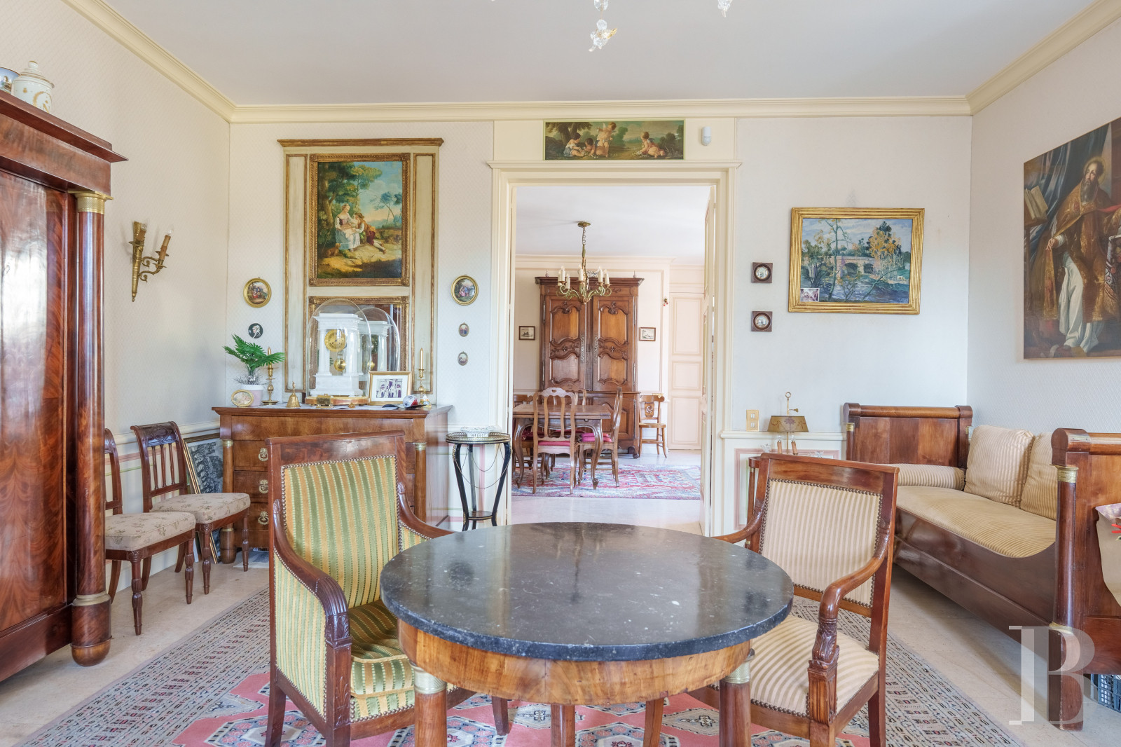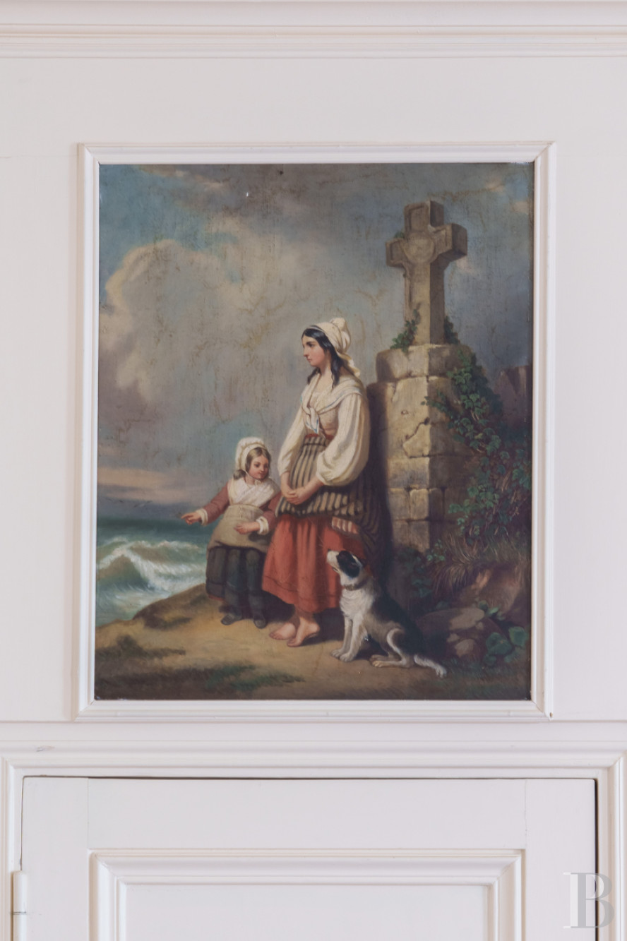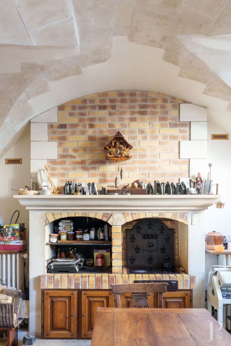 The door leads into a small hallway with a floor of Burgundy stone slabs patterned with polished slate square inserts. On the left, this hall connects to a dining room, which also has a floor of Burgundy stone slabs, as well as a fireplace with jambs sculpted with busts, and then to a lounge with similar flooring and garden-facing windows. On the right, there is a large kitchen with a cross-vault ceiling and a rustic fireplace of stone and brick that reminds us of the time of construction of this house, which was built in 1750. A small pantry at the back serves as a linen and utility room. At the end of the entrance hall, there is a staircase of solid oak with large balusters. It takes you up to the two upper floors of this pavilion.