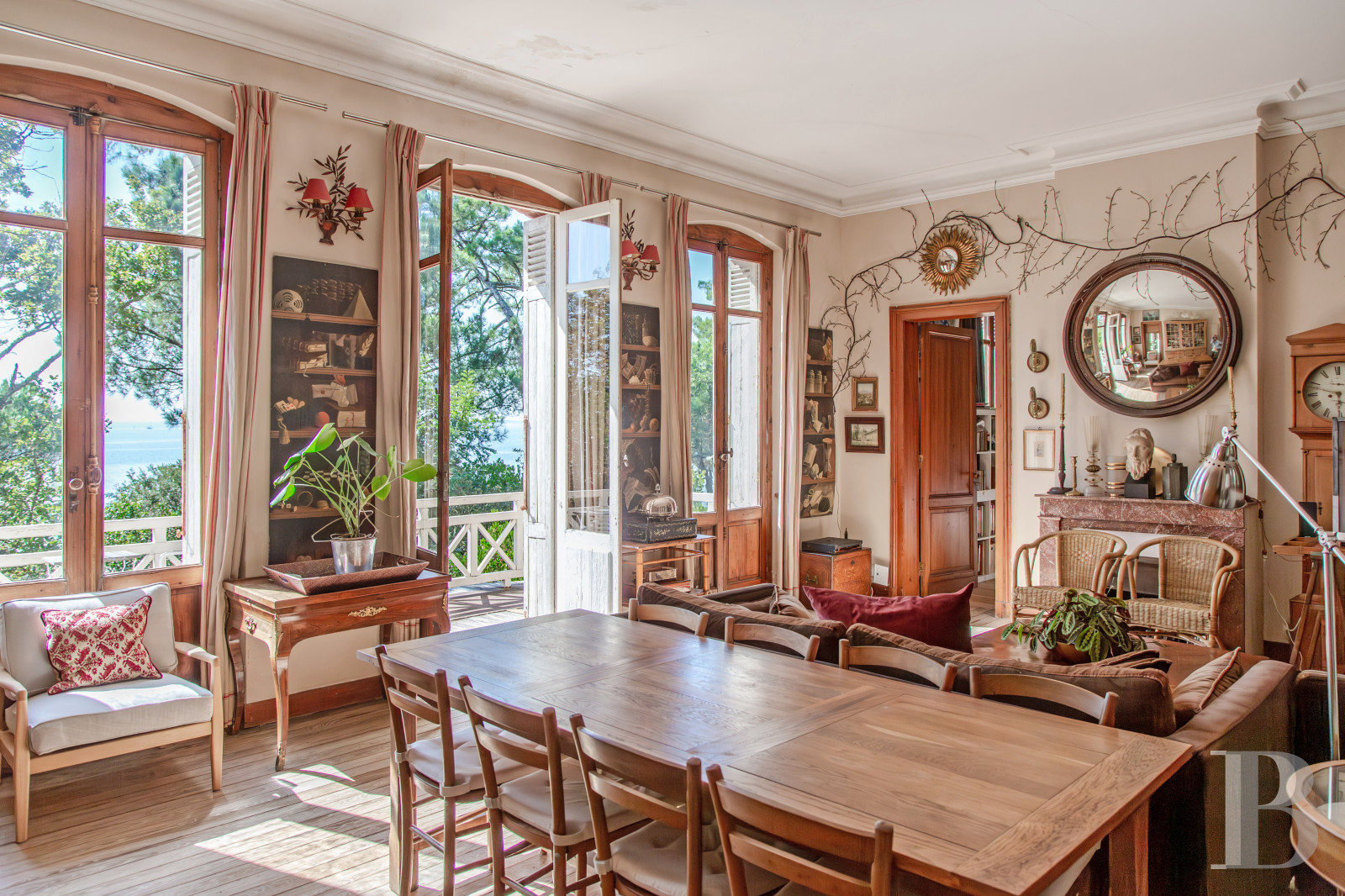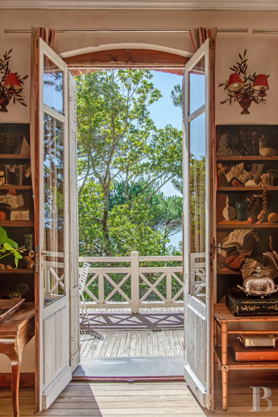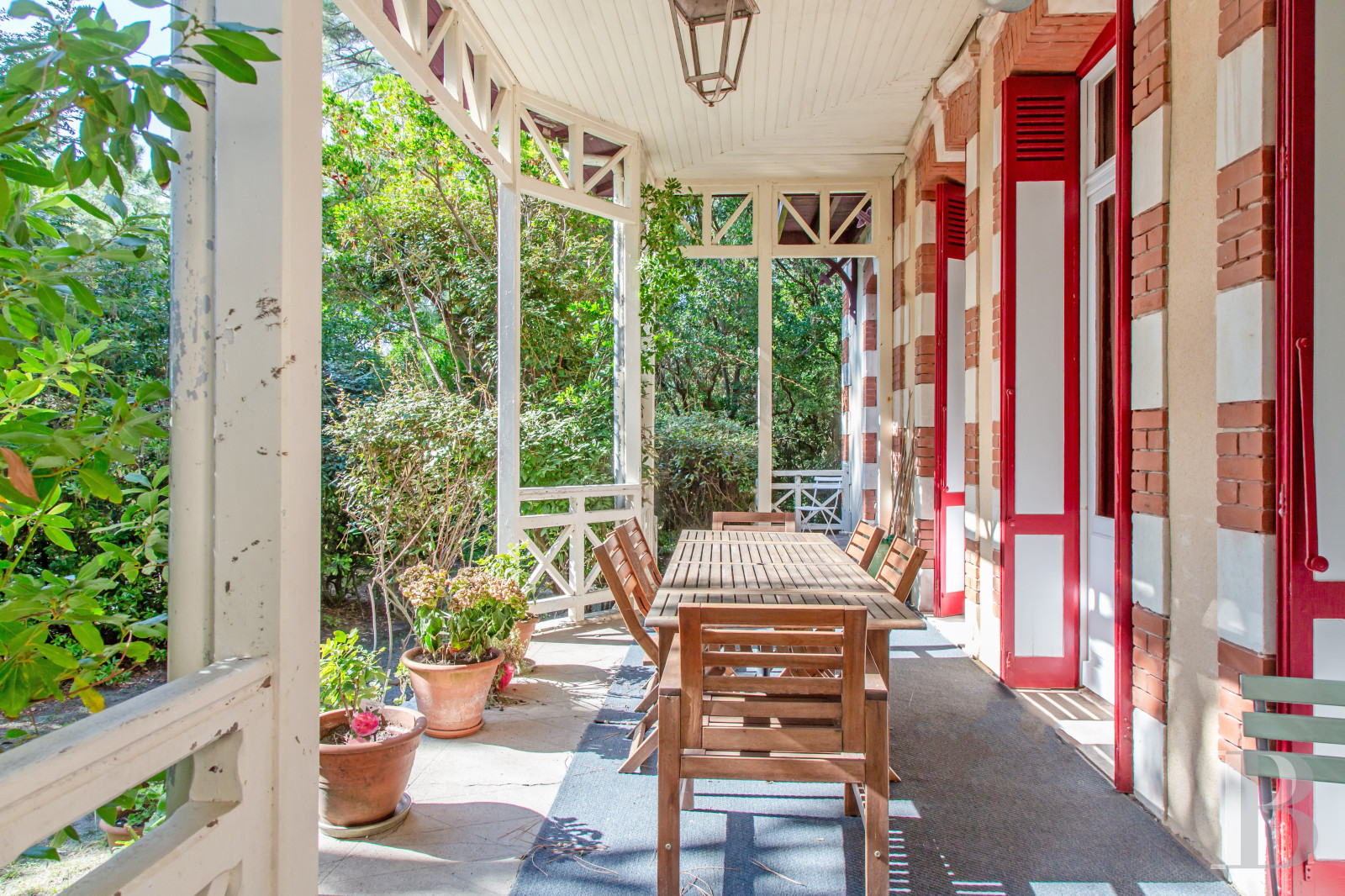 As for the first floor, completely independent, it is laid out around a wide hallway with pitch pine hardwood floors. To the east, a large kitchen is separated from the living room/dining room with an atelier window, the latter of which enjoys plunging views of the beach and the ocean's horizon, while, further on, two bedrooms, facing the sea, are each extended by a wooden balcony typical of Arcachon villas and two more bedrooms look out over the grounds.