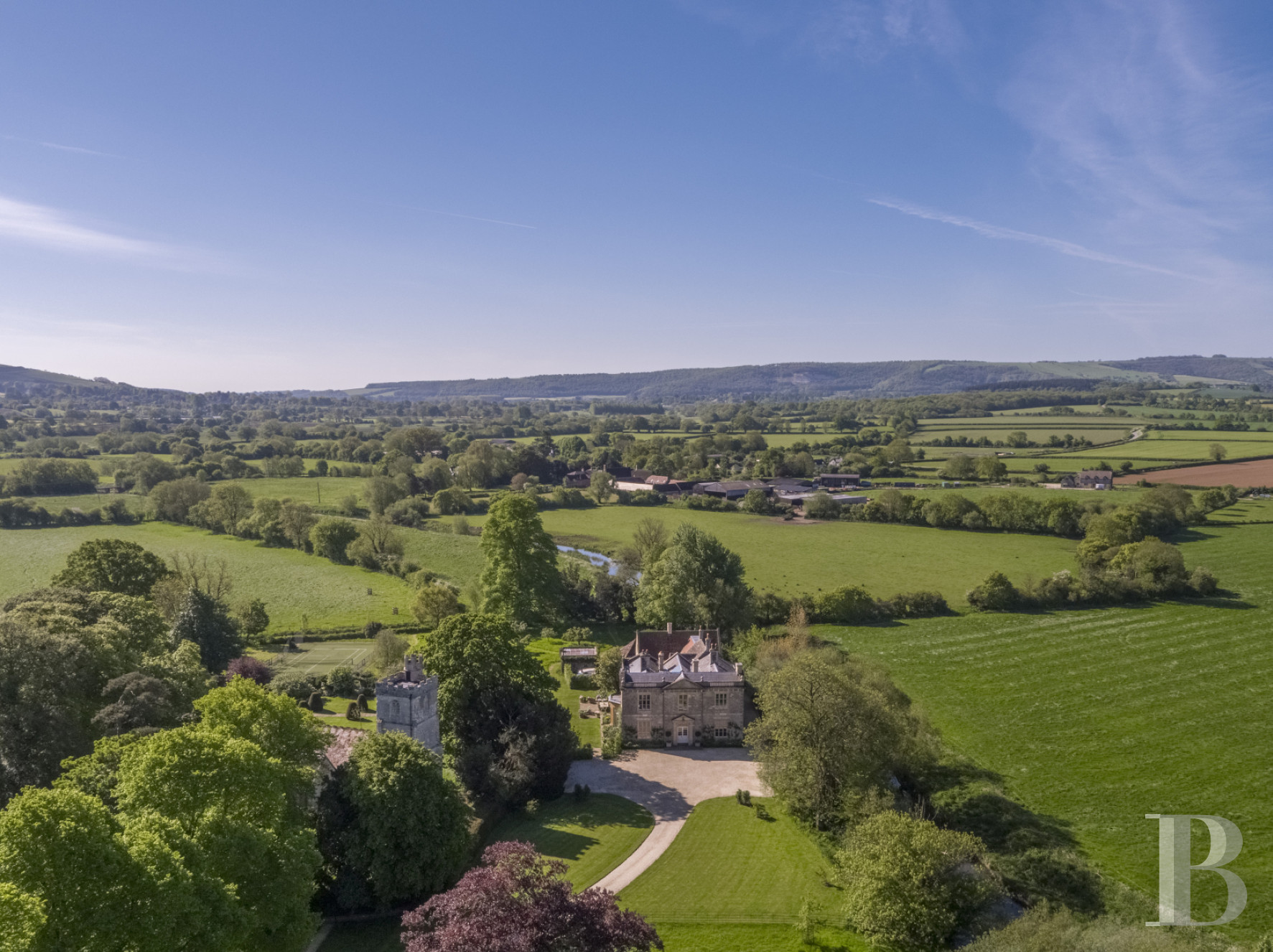 There are some residences that cannot be visited: they call out silently, like a preserved testimony to the past. Nestled amid landscaped gardens and centuries-old woods, Manston House stands in the Dorset countryside, a discreet guardian of Georgian elegance. Listed as a Grade II building, it displays the harmonious proportions of its era and shares its history with a twenty-hectare estate bordered by the River Stour. Every original feature bears the mark of time: antique fireplaces, interior shutters, mouldings, restored by the craftsmen of R. Moulding & Co. The interior layout reflects a preserved balance: spacious living rooms, library, study, family dining room and bedrooms spread over two floors. The place invites you to live in a home that precedes and extends those who choose it. The gardens unfold without ostentation, accompanied by gravel paths, tennis courts and stables. The separate lodge, with its own access, offers accommodation possibilities. The size and location allow for a variety of projects, while taking advantage of the proximity to amenities and direct access to London.