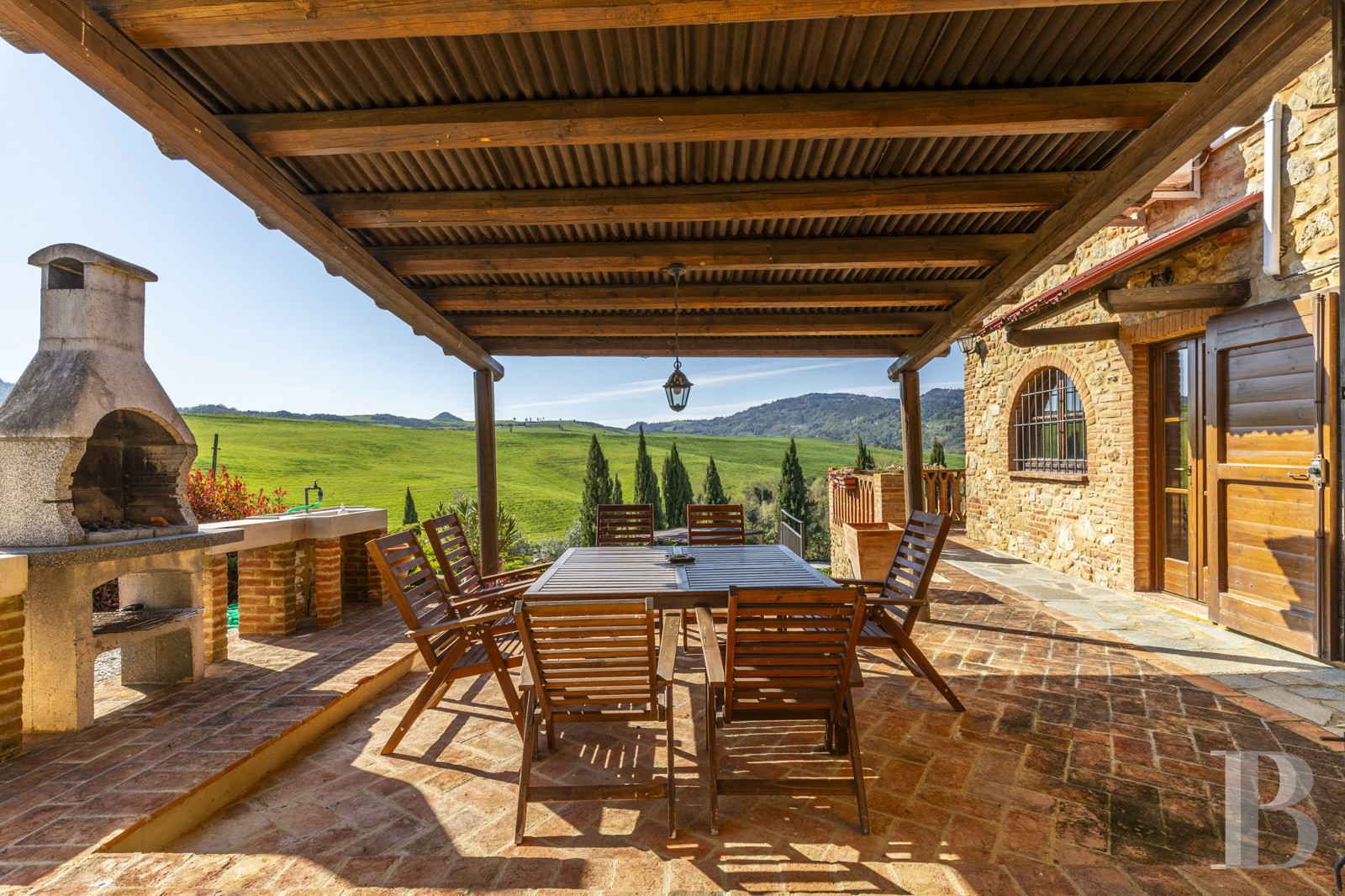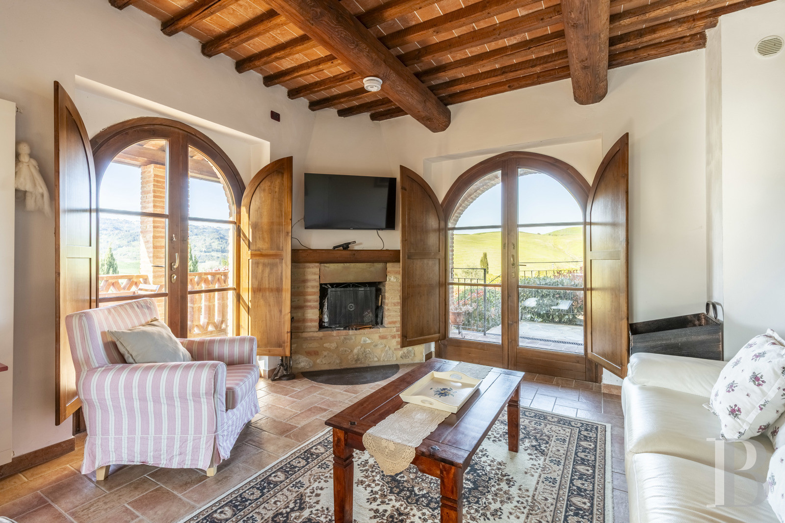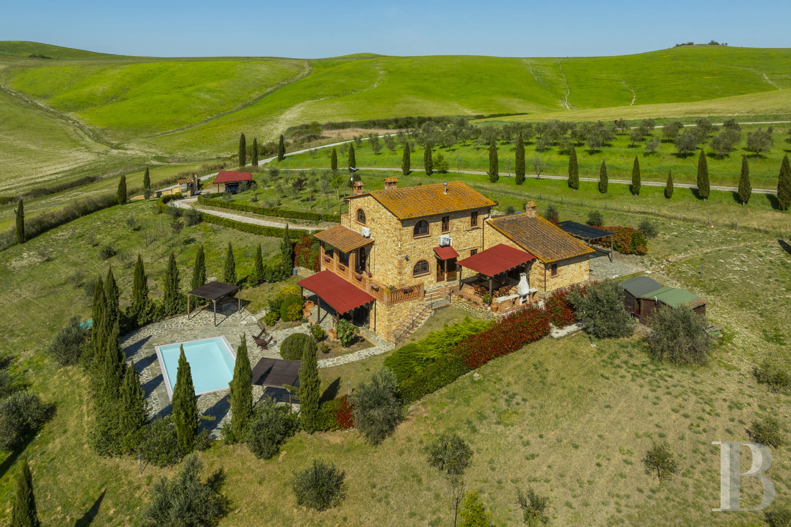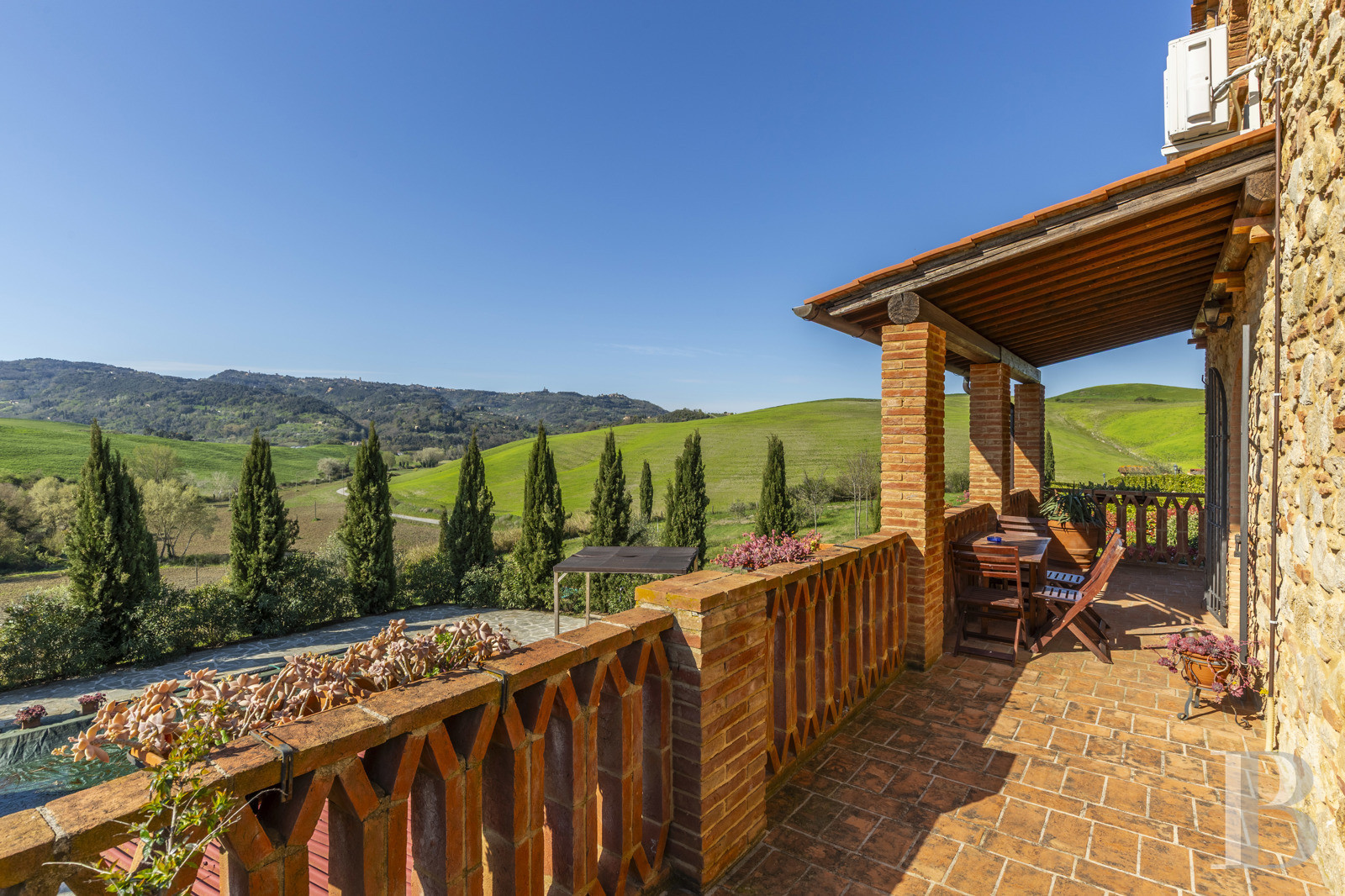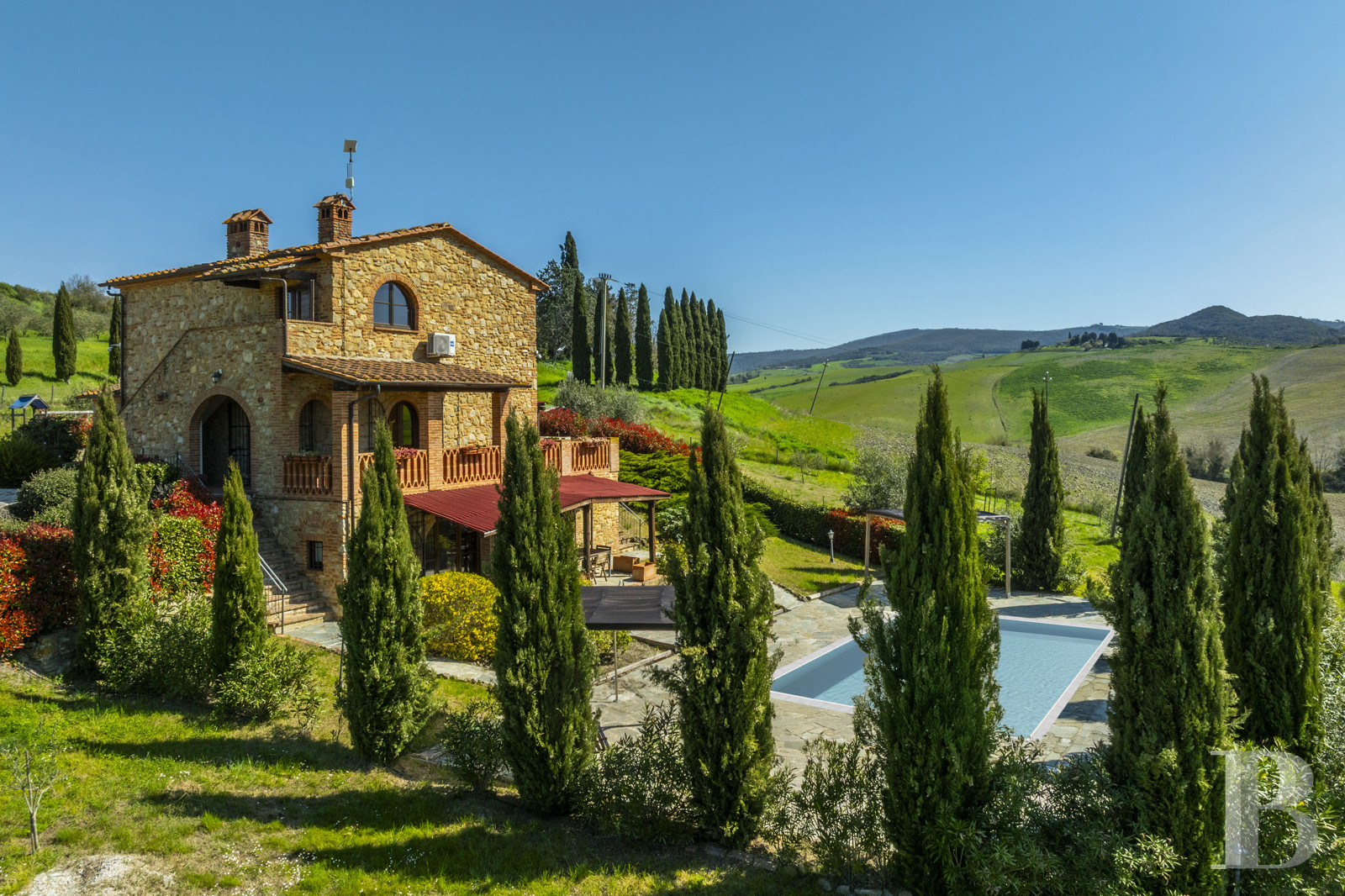 a Tuscan stone villa with panoramic views over the surrounding hills
