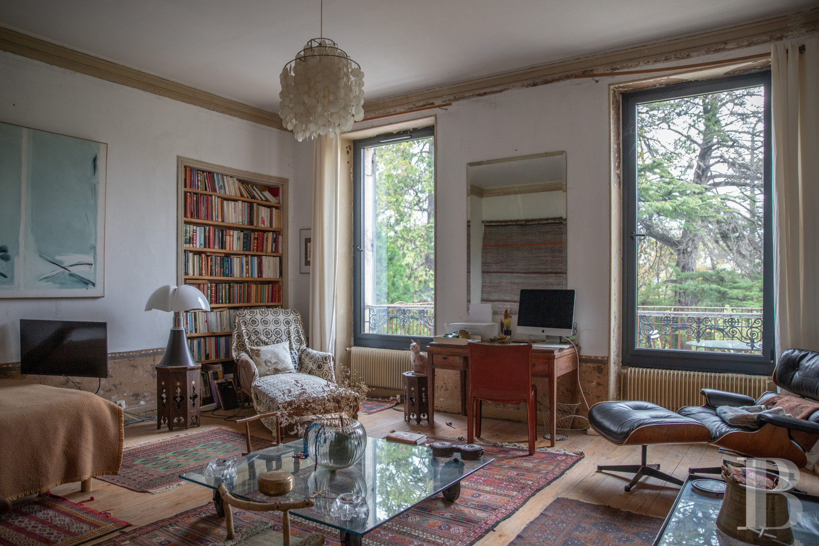 In addition, the edifice’s exterior provides a remarkable contrast with its interior, which has preserved the old-fashioned character of multi-century family dwellings with marble fireplaces and moulded stuccowork in the living rooms, as well as limed walls in pastel hues, vintage wallpaper, cement tiles, oak hardwood floors and terrazzo flooring in the bedrooms – the latter of which is more commonly found in Provence than the Cévennes.