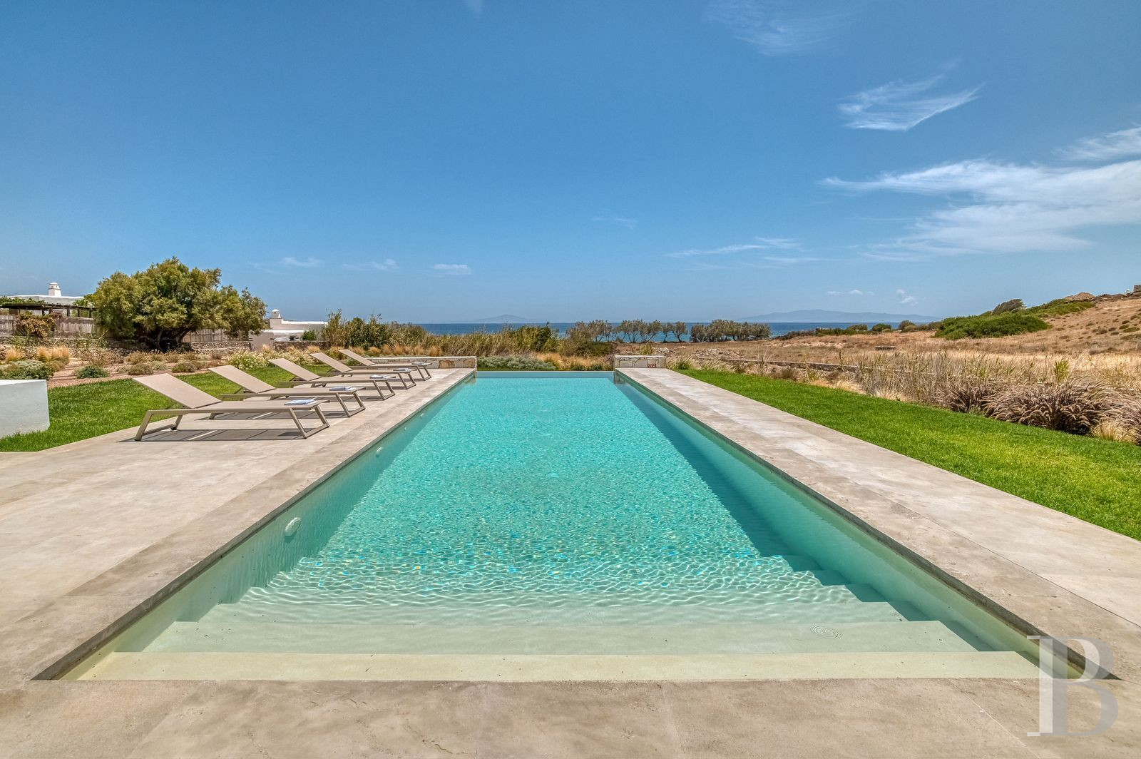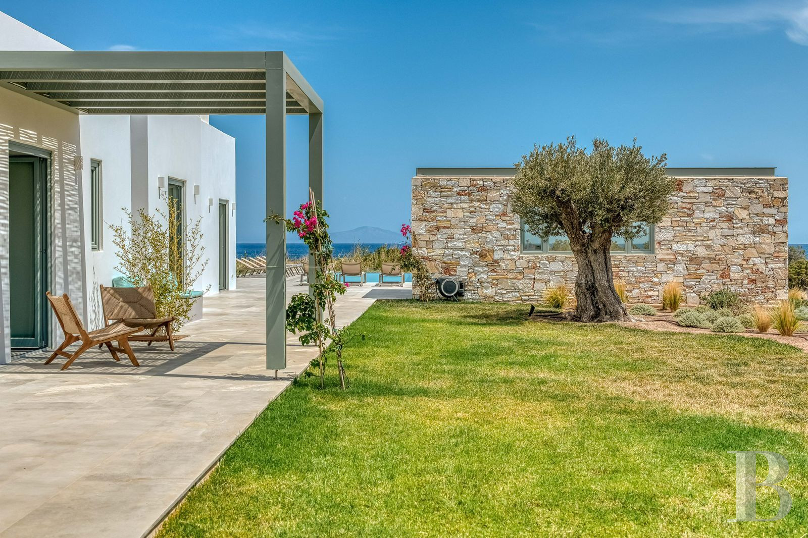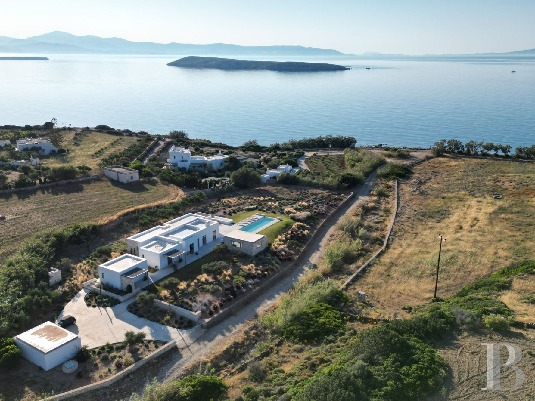 With its single-storey layout and architecture combining traditional Cycladic codes with contemporary minimalist lines, this villa blends seamlessly into the maritime landscape of Pyrgaki, a quiet village on the south-east coast of Paros where the small fishing port and coastal walks set the pace of island life. The property strikes a subtle balance between openness to the Aegean Sea and privacy preserved by Mediterranean vegetation. The authentic village has a few family-run tavernas by the harbour, equidistant from Naoussa to the north and Parikia to the west. The layout, with four bedrooms with en-suite bathrooms and a separate guest room, is ideal for extended family living or targeted rental use, in an area where demand for quality seafront accommodation remains strong.