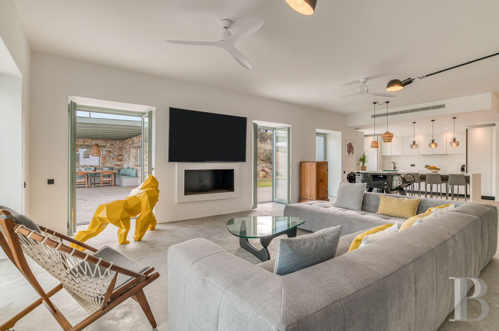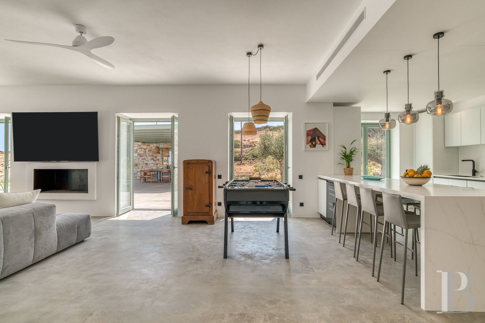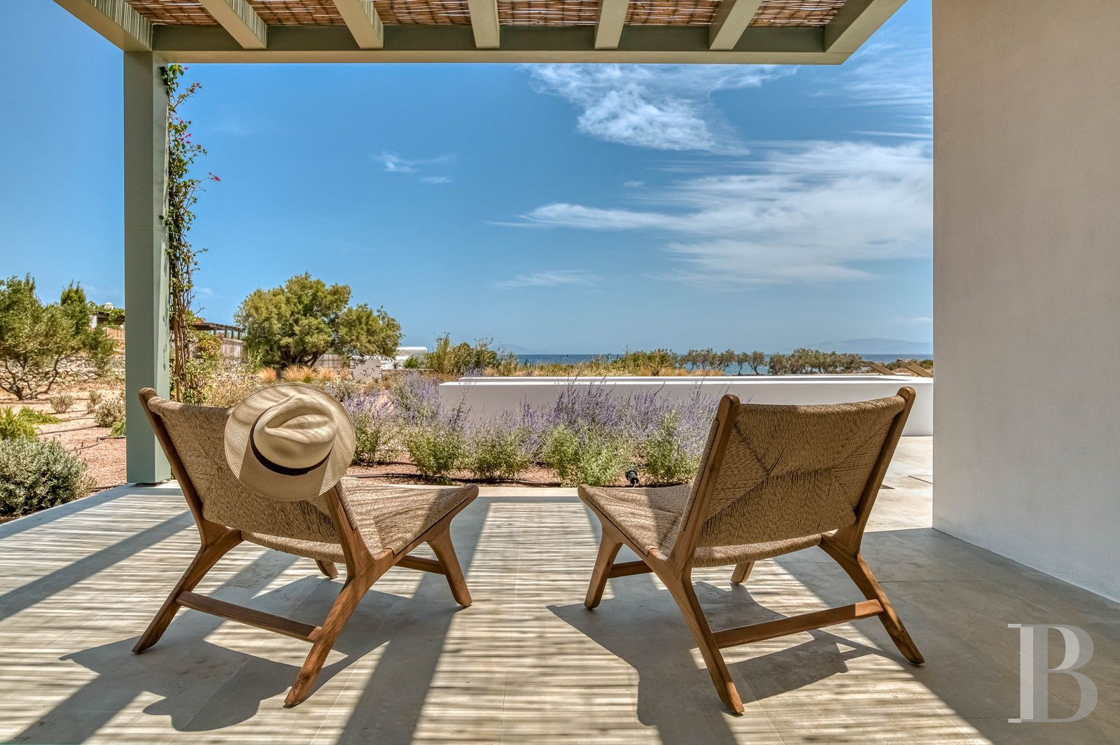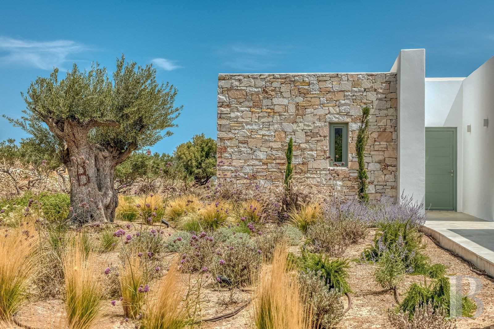 With its single-storey layout and architecture combining traditional Cycladic codes with contemporary minimalist lines, this villa blends seamlessly into the maritime landscape of Pyrgaki, a quiet village on the south-east coast of Paros where the small fishing port and coastal walks set the pace of island life. The property strikes a subtle balance between openness to the Aegean Sea and privacy preserved by Mediterranean vegetation. The authentic village has a few family-run tavernas by the harbour, equidistant from Naoussa to the north and Parikia to the west. The layout, with four bedrooms with en-suite bathrooms and a separate guest room, is ideal for extended family living or targeted rental use, in an area where demand for quality seafront accommodation remains strong.