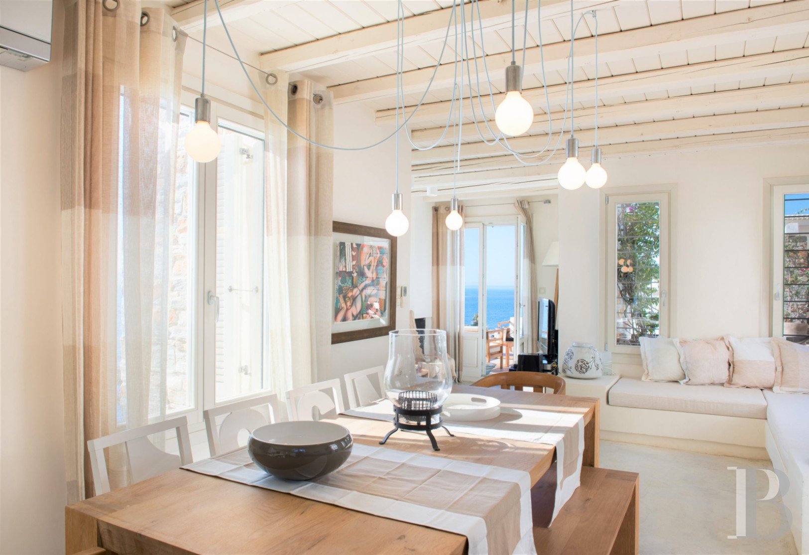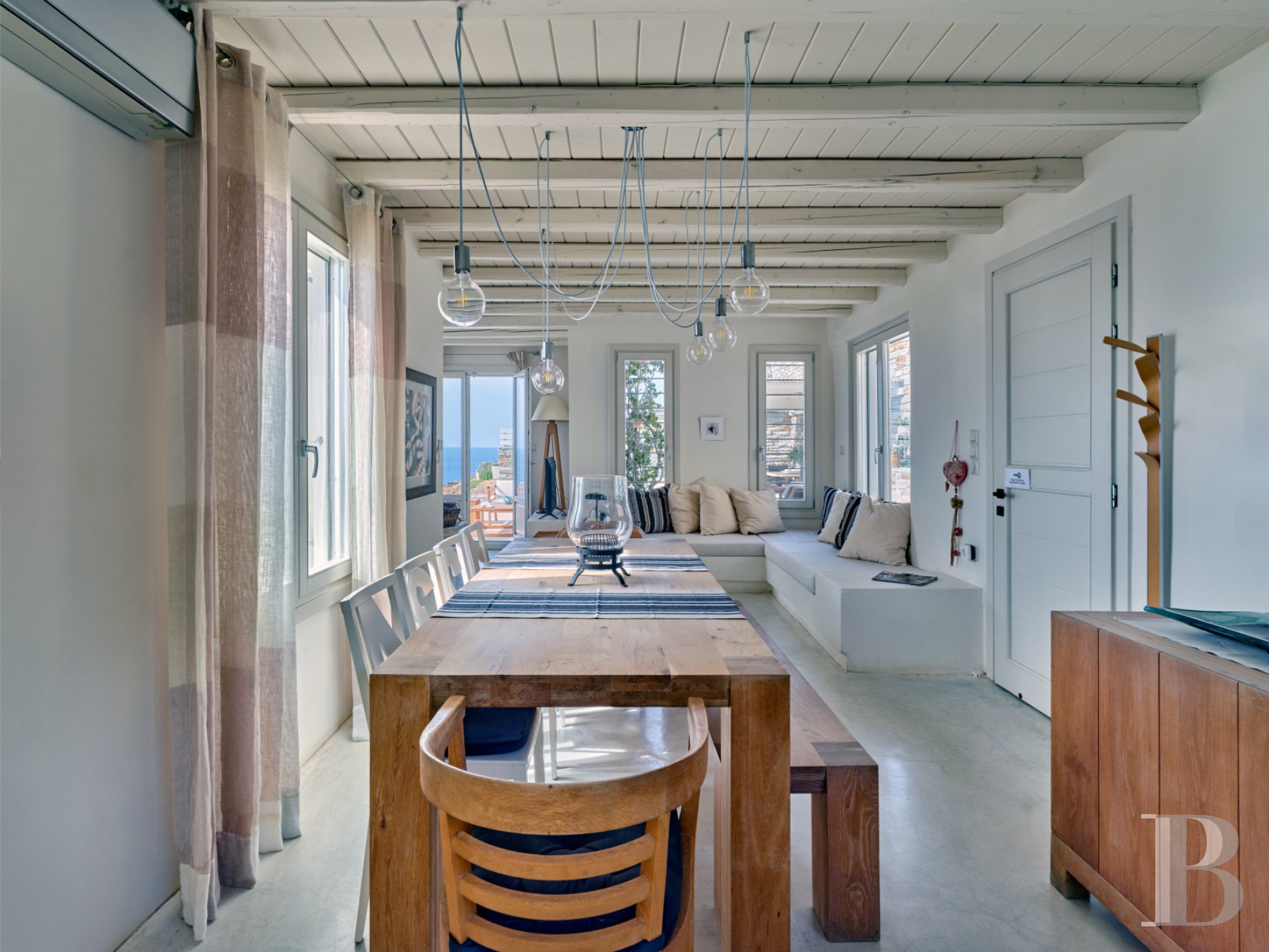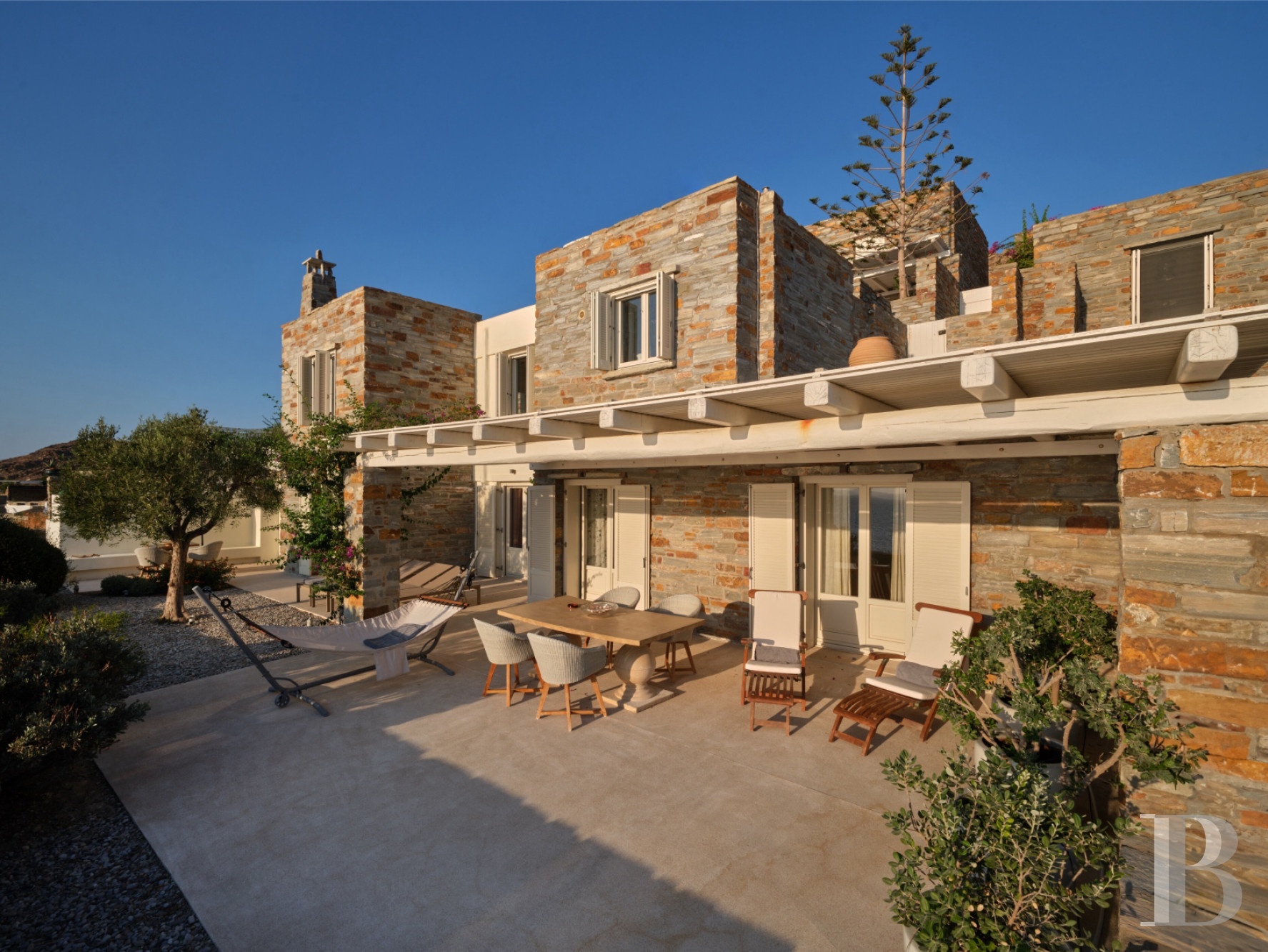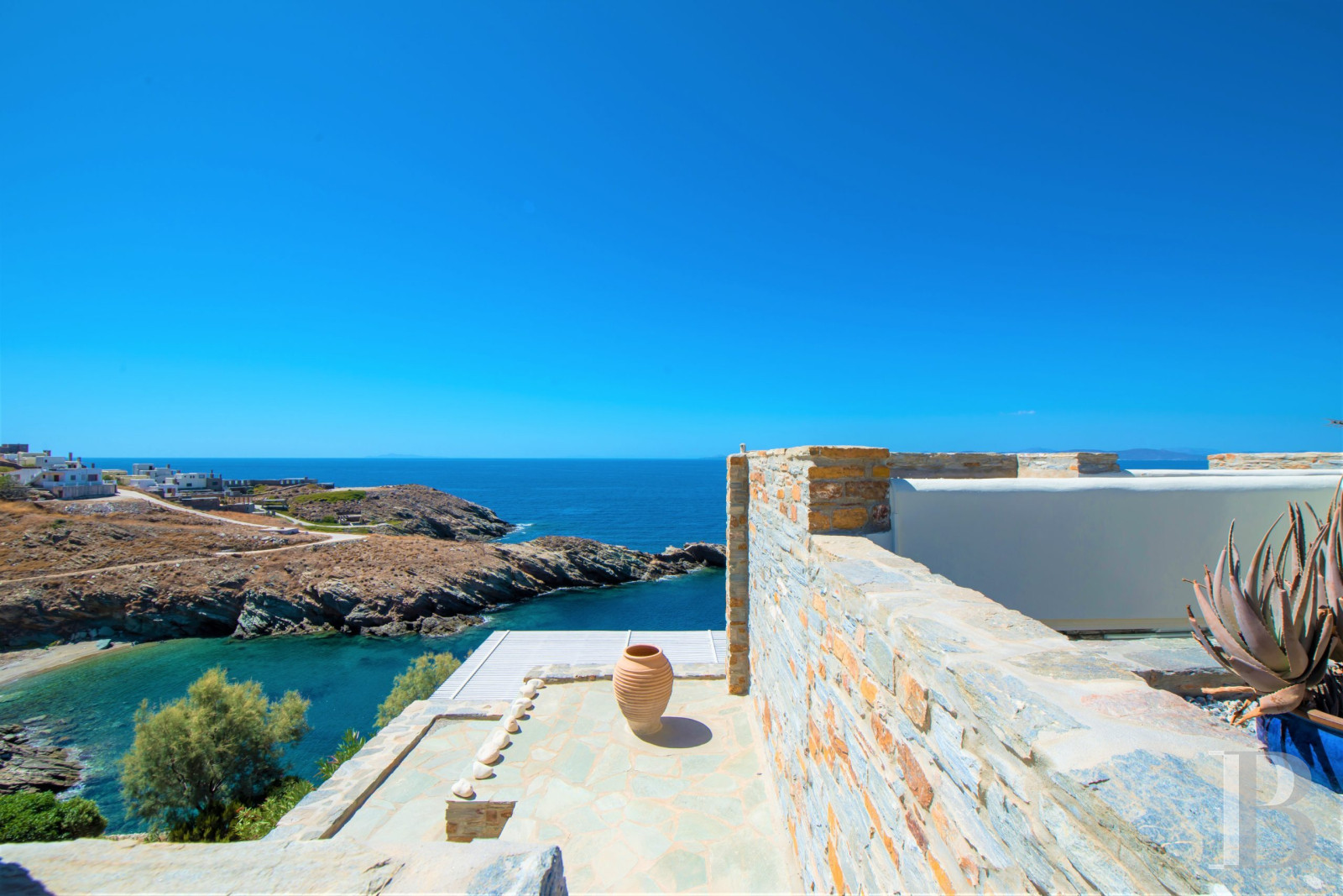 Set in a landscape marked by olive trees, dry stone terraces and the Aegean Sea, this contemporary villa features a two-level architecture that prioritises views of the sea and the surrounding terrain over sheer volume. The 200 m² landscaped terraces and carefully considered orientation place the building in line with contemporary Cycladic housing styles. The interior layout clearly distinguishes the upper floor, dedicated to reception, from the lower level, which houses five bedrooms and a second kitchen, reflecting a lifestyle focused on independence and extended hospitality. A private estate extends this territorial interpretation by maintaining the direct connection between the dwelling and the island landscapes and maritime horizons. Between traditional inland villages and the coastline with its unspoilt coves, this property is part of a continuum of uses that gives the place an identity based on its ideal location on Kea, an island in the western Cyclades accessible in an hour from Athens, and its enduring relationship with the sea.