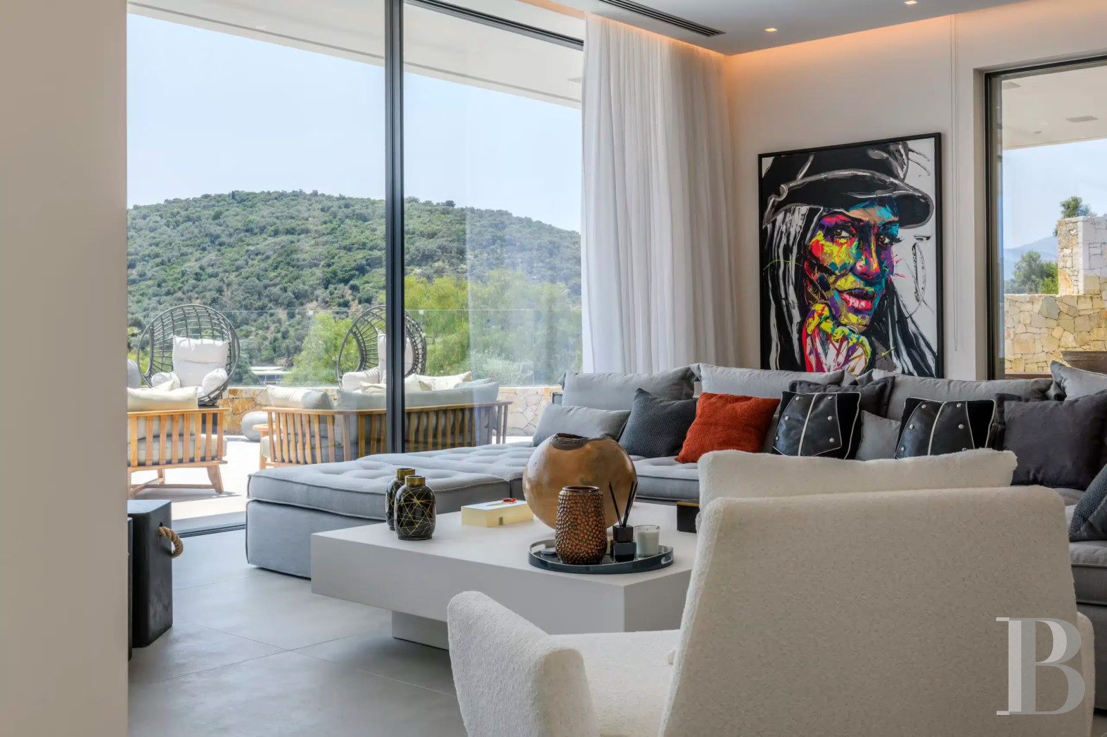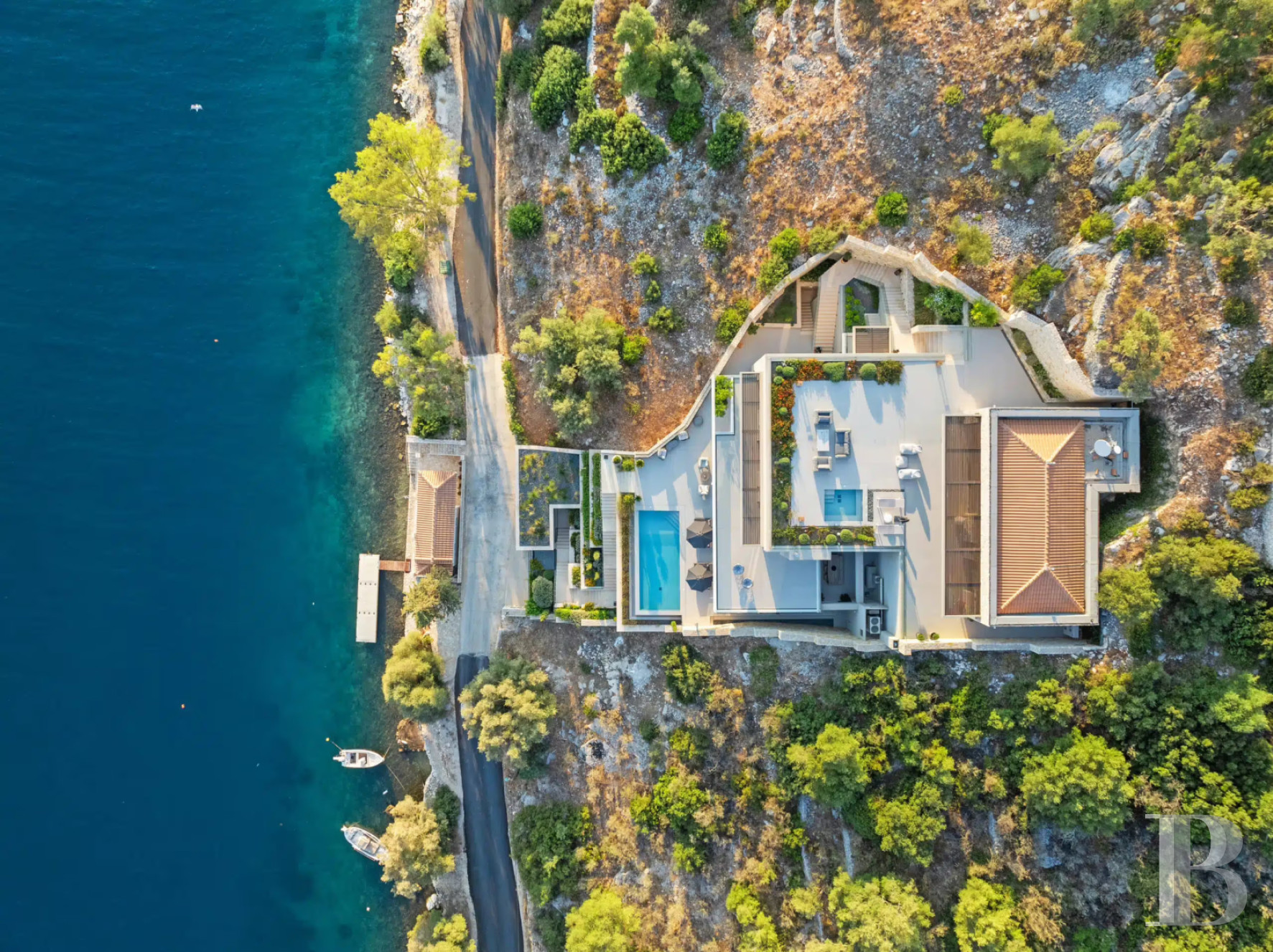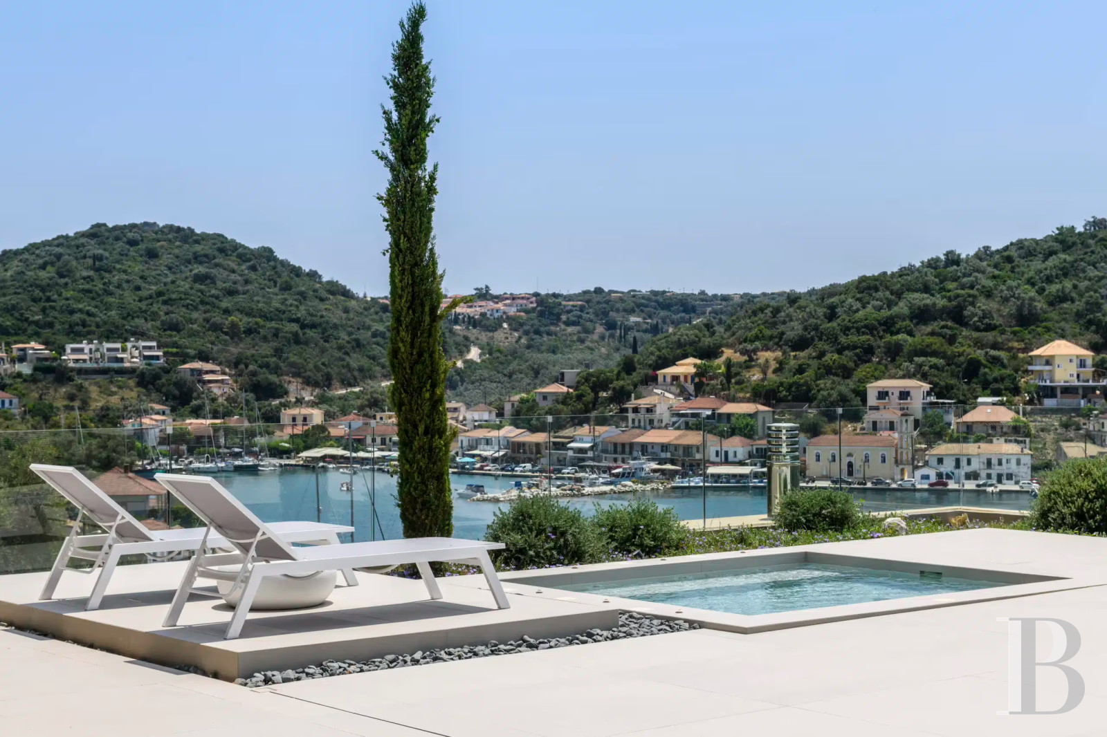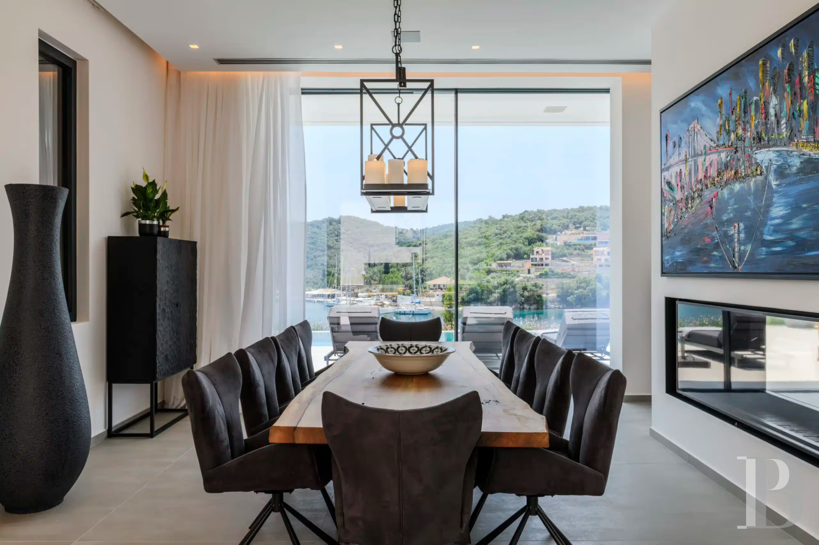 A contemporary villa recently built on the seafront, whose high ceilings and large windows create a sober, almost monolithic architecture, in direct dialogue with Meganisi Bay and the views of Skorpios. The tranquillity, the maritime influence of the seafront location and the commanding position reinforce a feeling of isolation, without being synonymous with remoteness: the village of Vathy is within walking distance and the sandy beach is five minutes away.