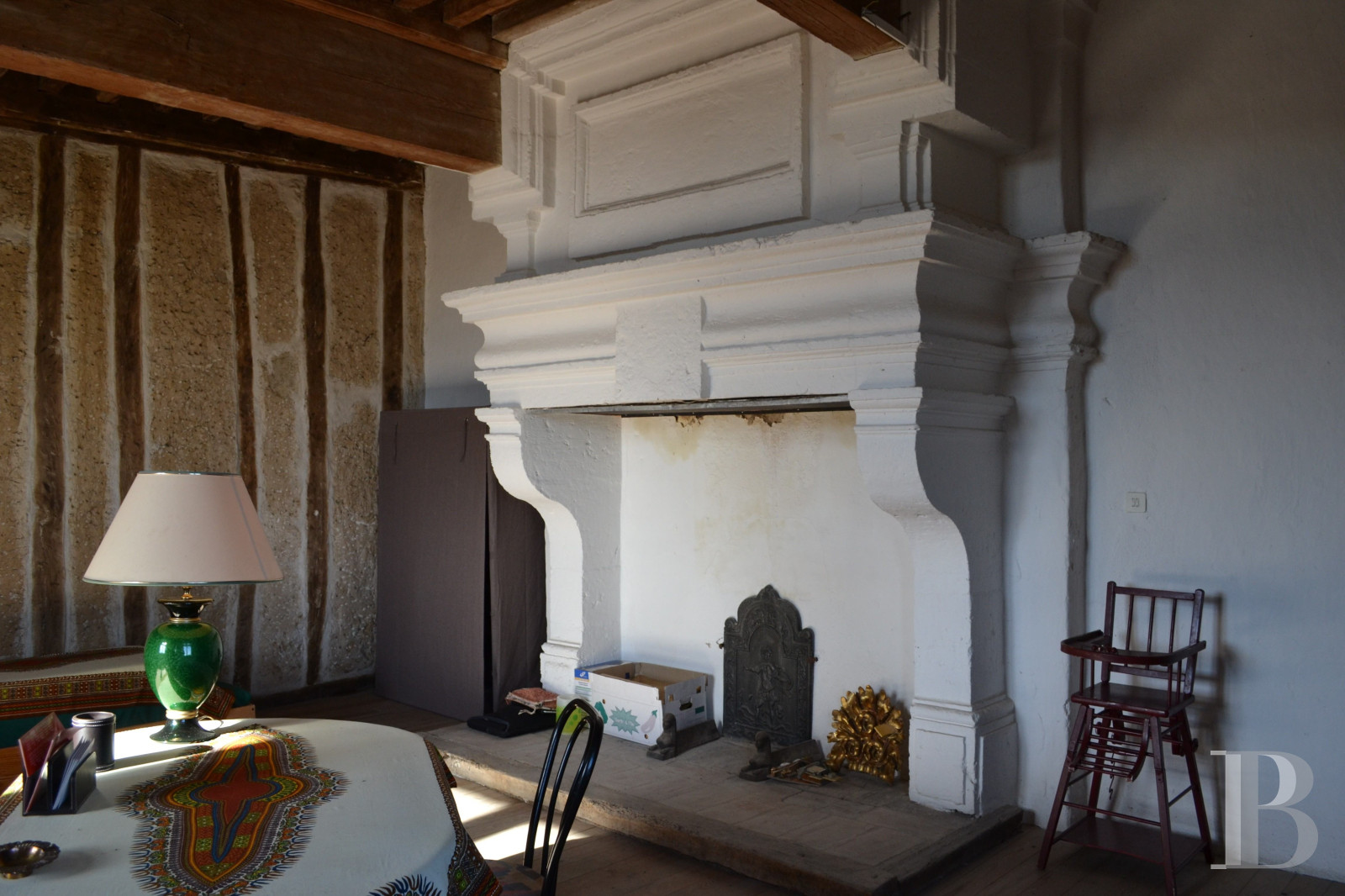 The wooden steps of the winding stairway are grafted on to a single tree trunk, spanning all levels. Said stairway leads to a landing room, with bare wood flooring and exposed beams. Wide planks of wood form the partitions of the stairwell. A wooden mullioned window, with 19th century, leaded stained glass, looks out on the north side over the narrow street. A toilet has been put under the stairway and a makeshift shower installed in a corner of the room. Old double doors on the south side open into the large room where residents spent most of their time in bygone days. The wall separating it from the landing room is composed of cob mixed with pebbles from the river Lot. This extremely bright room has a French ceiling and wide strip pattern wooden flooring. The 17th century fireplace is in good working order. A stone mullioned window, with stained glass, faces south; the other west-facing window looks out over the gallery to the cloister which is clearly to be seen at the end.