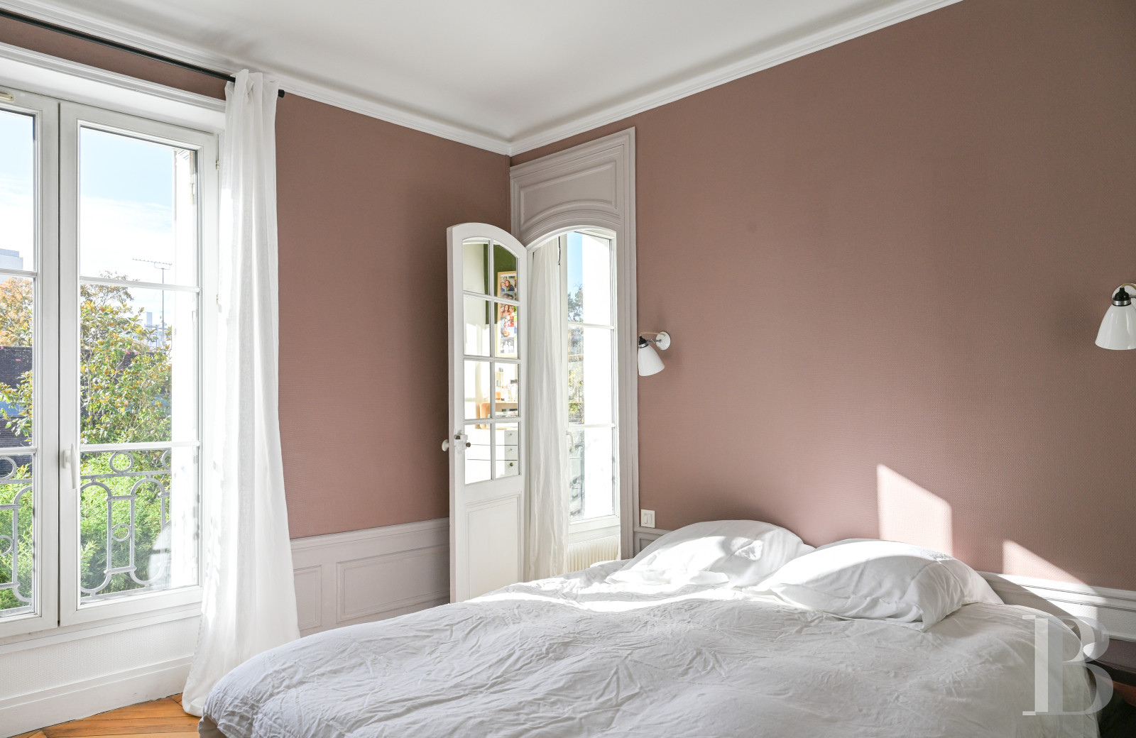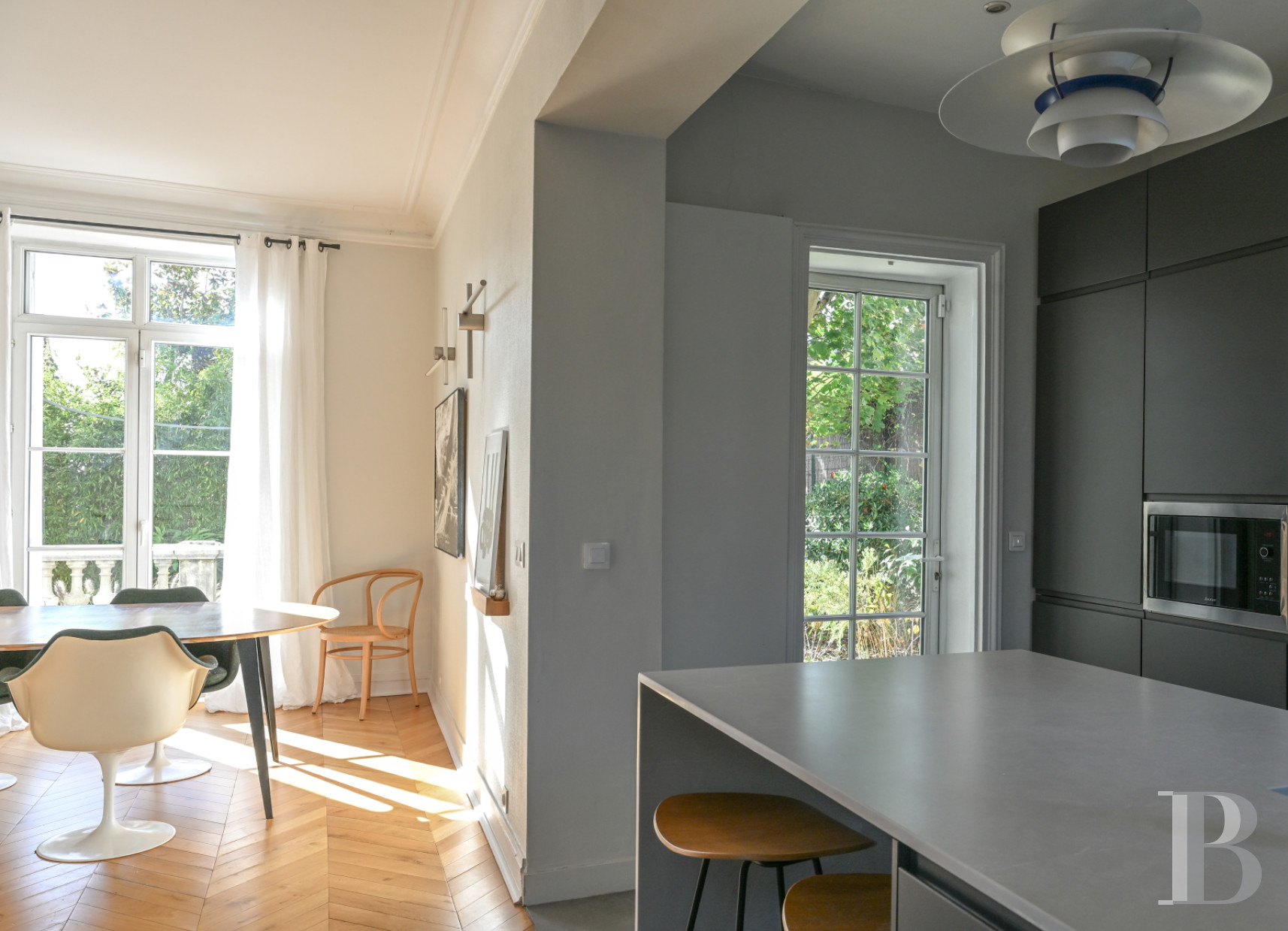 Sheltered from view and immersed in silence, this warm and pleasant family dwelling, hidden behind its tall walls and overlooking the neighbourhood, was tastefully renovated and is ready for its future occupants to move in right away. Reminiscent of a provincial manor house, only a stone's throw away from Paris, the elegance of its renovation combined with its history, exude an undeniable prestige, whereas the dwelling's different rooms have adopted the efficiency of modern amenities, all the while preserving their bygone cachet with their soaring floor-to-ceiling heights, original fireplaces and splendid hardwood floors.