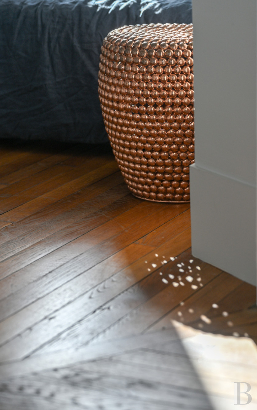 In addition, the second floor also includes a shower room, bathed in light by a large window, the shower of which features a partition reminiscent of an atelier window as well as white tiles, placed in a chevron pattern, which elegantly reflect the light.