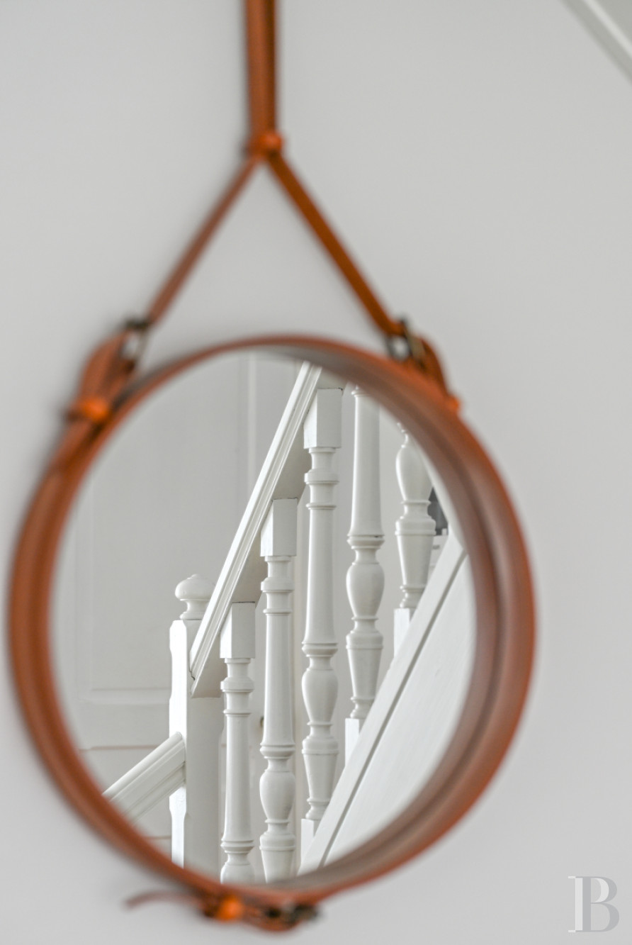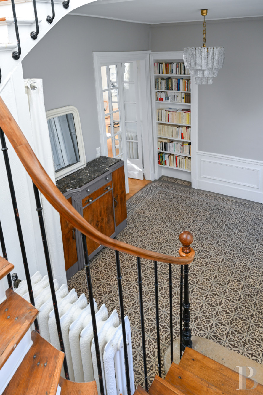 With its roof redone in 2017, the dwelling stands in the middle of the lot, sheltered from view thanks to a high wall topped with dense ivy and accessible via a large automatic gate. At the top of its original stone front steps, a glass and wrought-iron vestibule painted white and decorated with a floral motif, precedes the glazed front door, while, past the threshold, a jaw-dropping entrance hall, bathed in sunlight, communicates with the living areas and includes a staircase with solid oak steps, safeguarded by a wrought-iron bannister, around which a breath-taking carpet of original cement floor tiles spreads out for all to admire.
