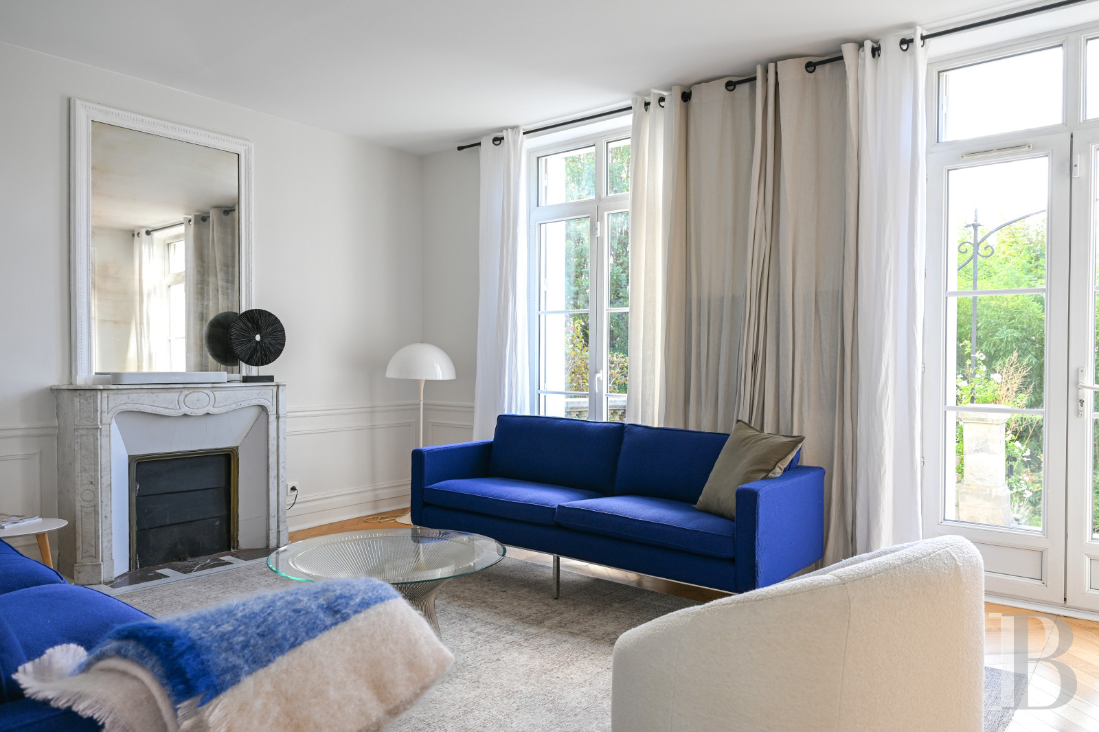Directly opposite, the living room, featuring three sets of glass double doors opening southwards, is drenched in abundant sunlight, while a white marble Louis XV “Pompadour” fireplace with a scalloped mantelpiece and a central medallion – popular in the late 19th century – decorates one side of the living room.
