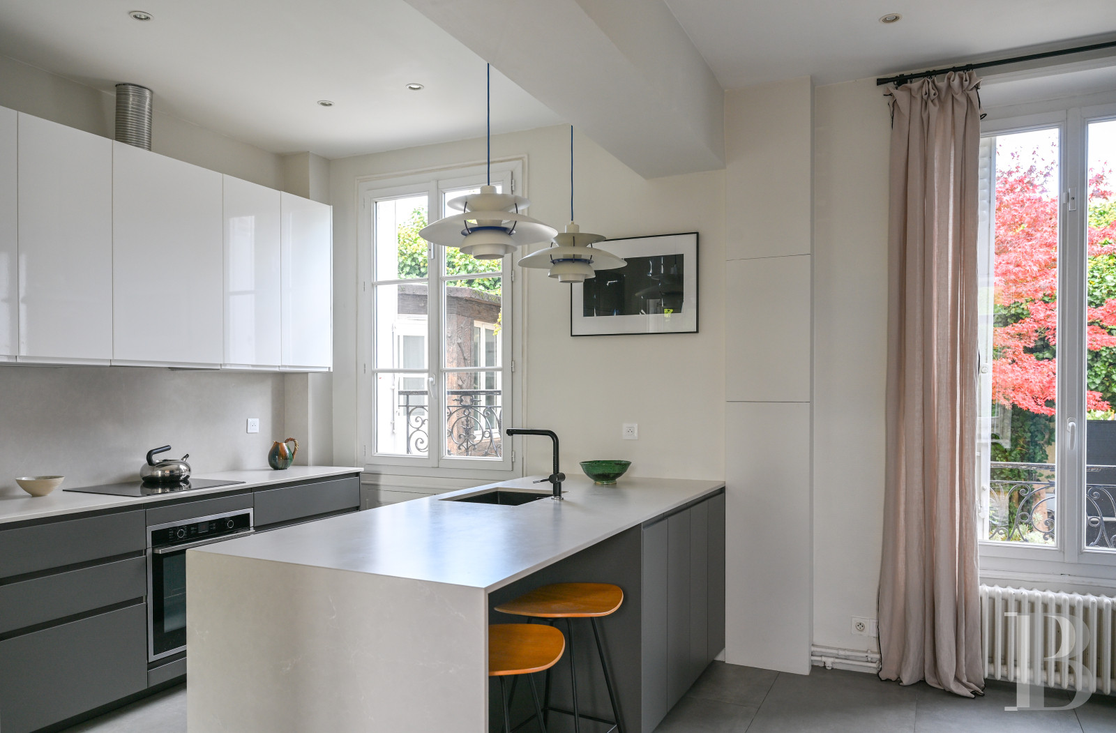 In addition, the kitchen of more than 10 m², also accessible from the entrance hall, is decorated in an understated palette of grey and white. Modern and cosy, it features two windows that face the front courtyard and a set of glass double doors that open to the west, as well as a central island with cupboards, a sink and a space large enough to eat light meals, while all the cast-iron radiators on this floor are original and decorated with a charming floral pattern.
