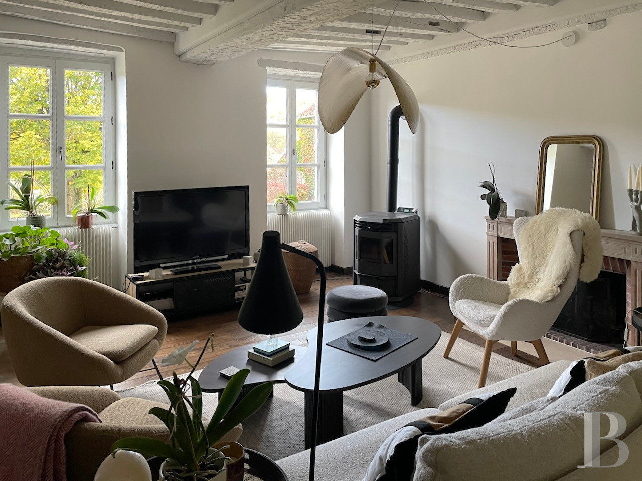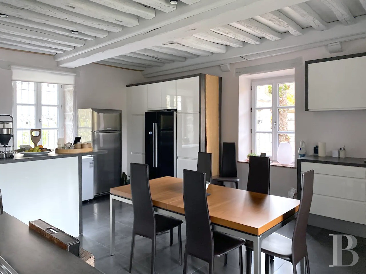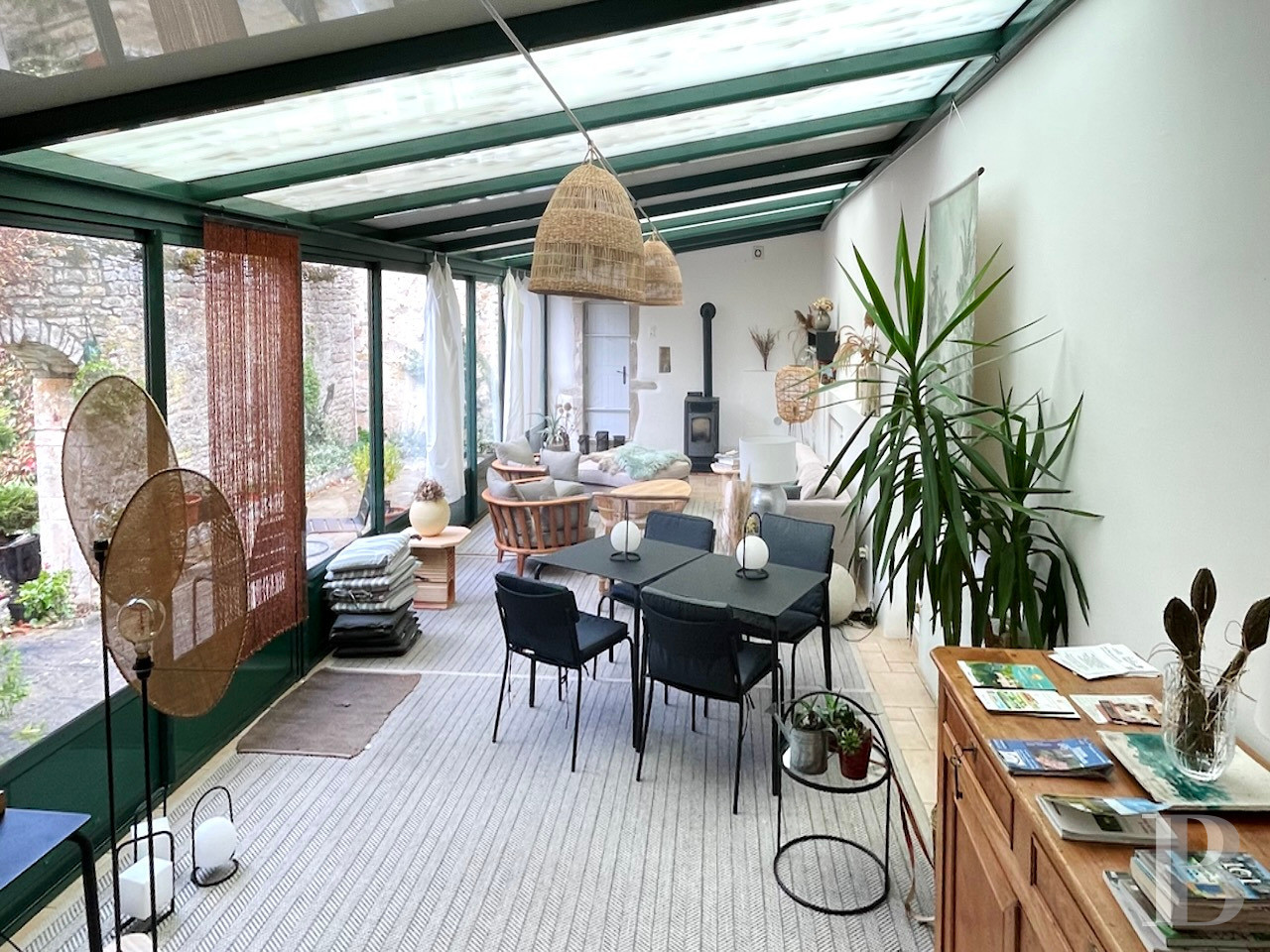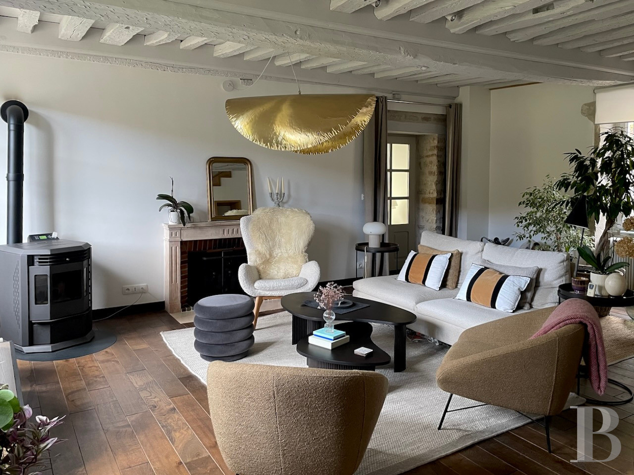 Beyond the glazed court-facing door, there is a vast central dual-aspect lounge with a floor of stone slabs. The room features a large stone fireplace fitted with a wood-burning stove. On the right, this room connects to a semi-professional kitchen, filled with an abundance of natural light from four windows spread across three walls and facing three directions. This spacious kitchen is fully fitted and includes a cooking and preparation area and an eating area. On the left, there is a lavatory and a cosier lounge that has wood strip flooring, a Louis XVI style marble fireplace and a pellet-burning stove. This dual-aspect room leads up to the first floor and connects to a conservatory via a glazed door. This conservatory is heated up with a pellet-burning stove. A separate entrance door leads into the room from the street. Its broad sliding doors lead outside into a small court enclosed with stone walls, with a central vault leading to the garden. The whole ground floor has French-style beamed ceilings.