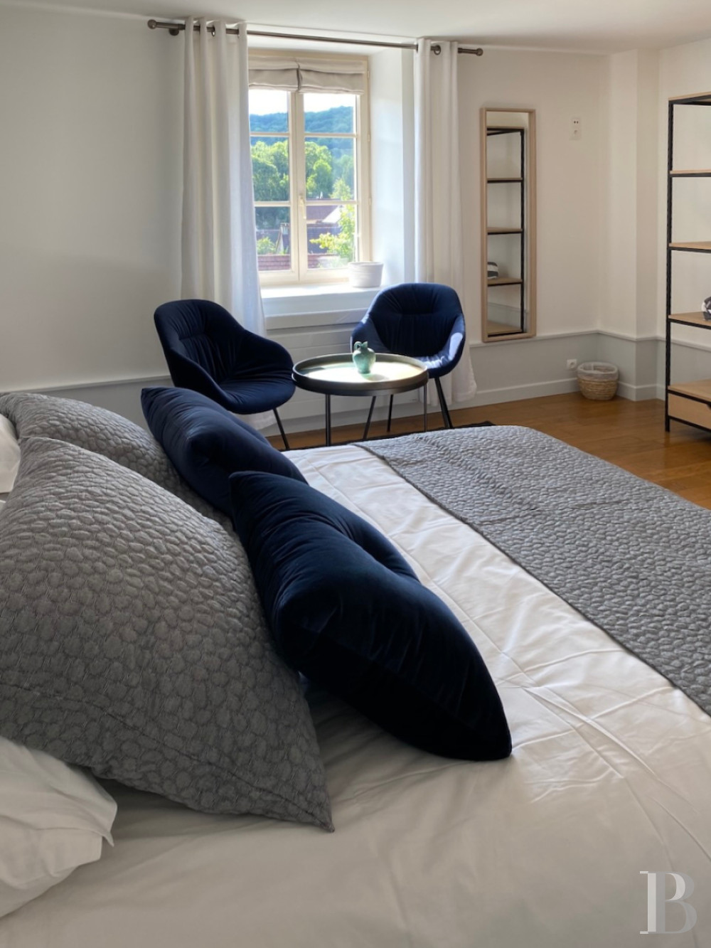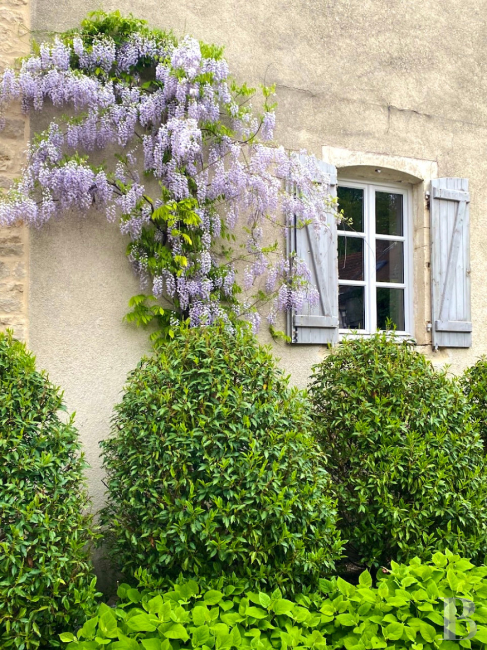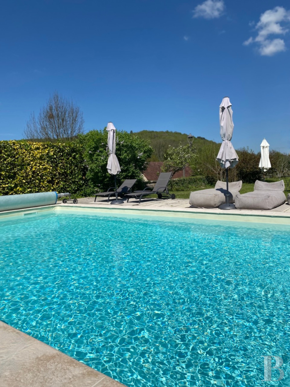 In the middle of the lawn, an age-old linden tree towers. It draws your gaze and goes well with two other linden trees that provide shade for the parking area. Wisteria and Portuguese laurels adorn the facade of the main house. In front of this facade, a terrace invites you to enjoy open-air meals and relaxing moments. Two neatly trimmed junipers mark the entrance into the conservatory. A Virginia creeper grows up the outbuildings and a Japanese maple marks the entrance into the annexe. Begonias and agapanthuses in pots dot the space, adding colour with seasonal flowering as a complement to the shrubs and perennials that line the paths and include irises, lavender, rosemary, peonies and rose bushes. The garden extends along the west side of the property and ends with a swimming pool warmed up with a heat pump. This pool lies in the south-west corner of the garden. Along the south edge, there is a grassy path with wooden kitchen-garden beds. It leads down to an old bakehouse via a flight of stone steps. This bakehouse, with its fireplace and stone slabs preserved, now houses the swimming pool’s technical installations. A pedestrian gate leads to the village.