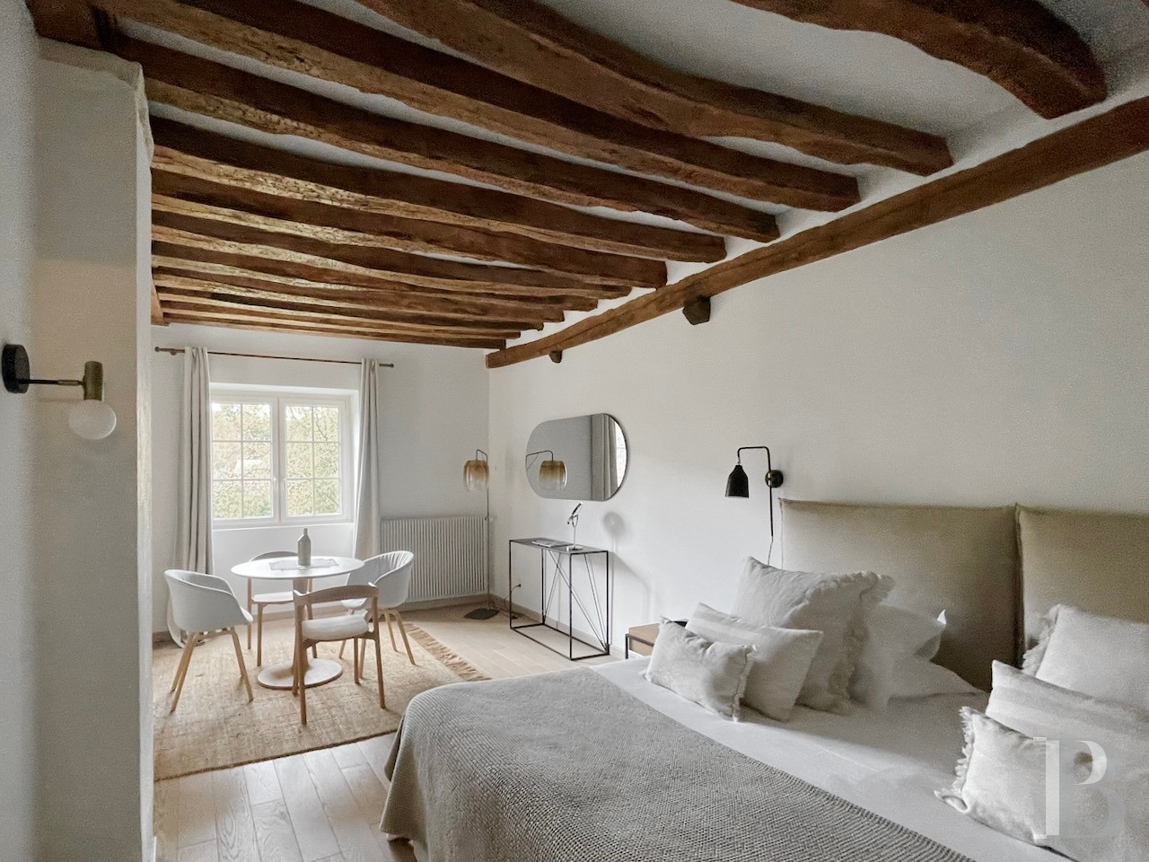You reach the roof space via a hidden door. This roof space has a floor area similar to the levels below it. Placed upon beams, this top space, which has no partitions, reveals the original oak beams of the roof frame, structured with four identical trusses. Only the chimney flue passes through this convertible space.