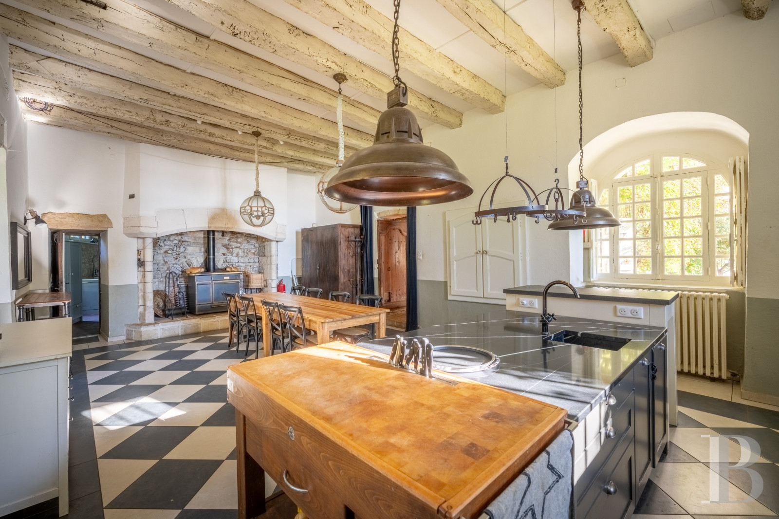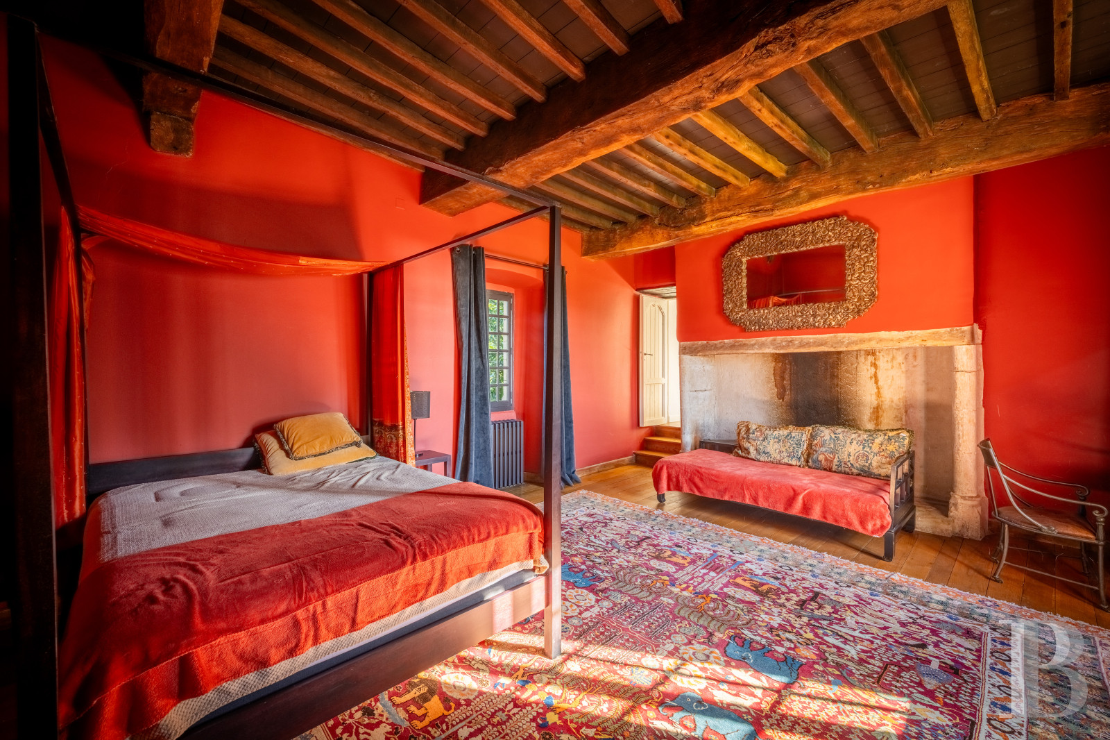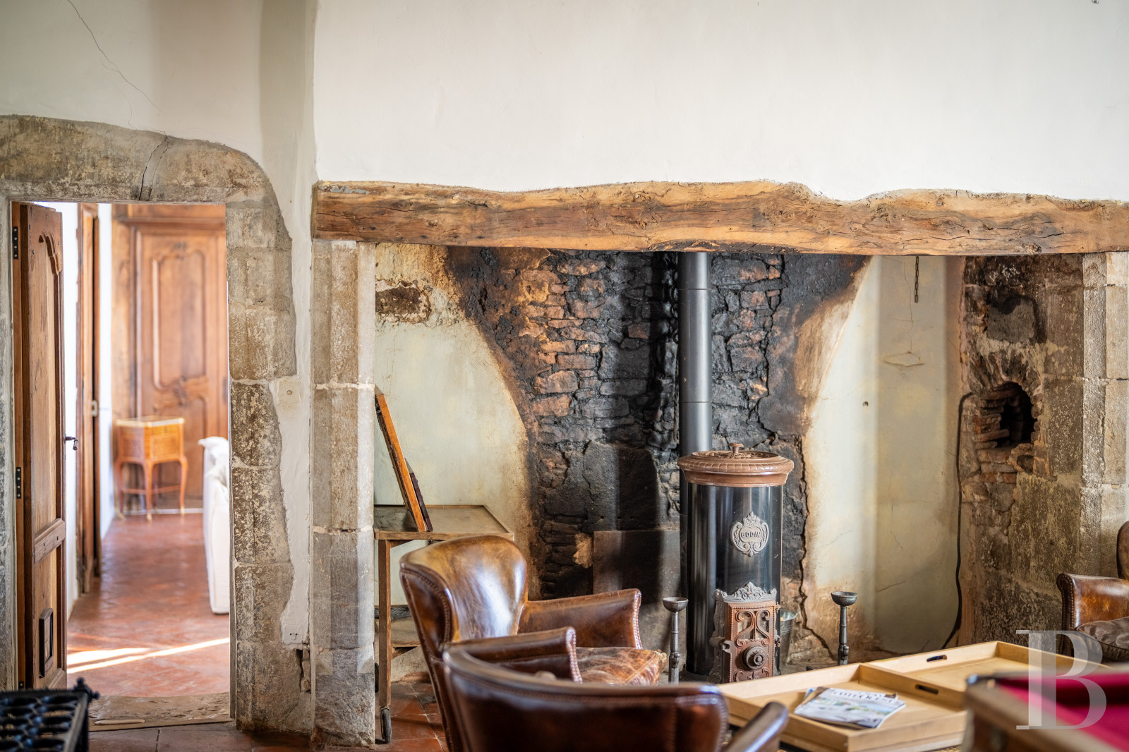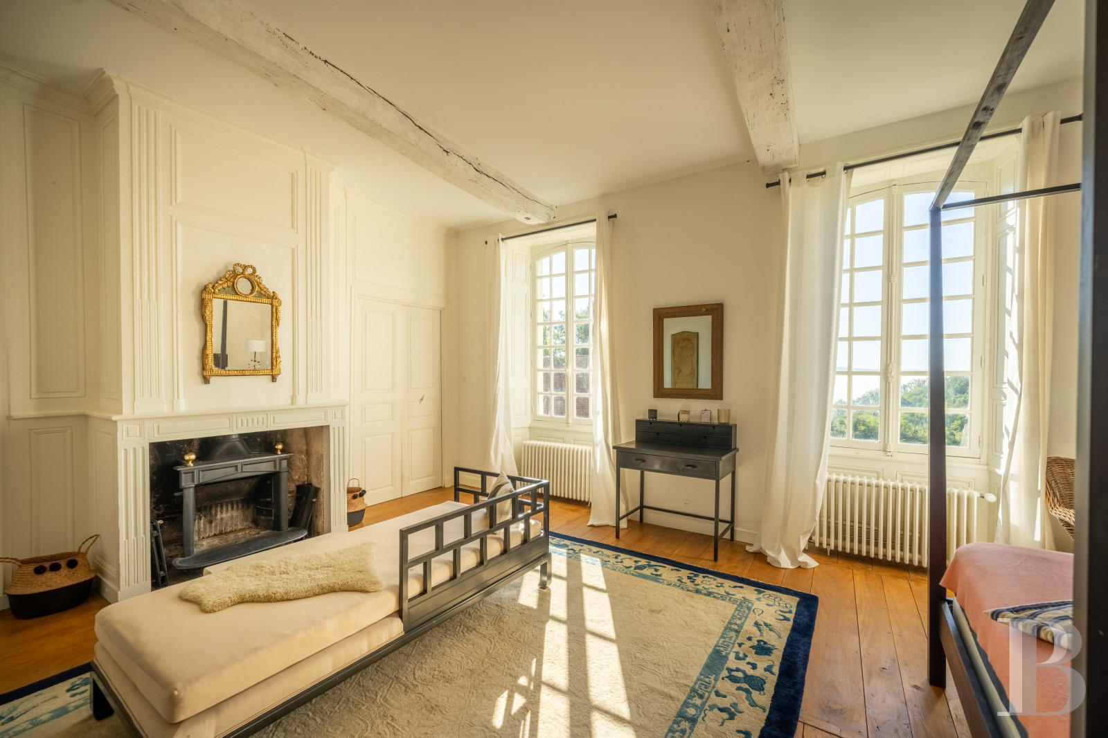 This level, which can be reached via a wooden, quarter-turn staircase from the billiards room as well as via the spiral staircase, includes three large bedrooms bathed in light and enjoying views of the surrounding landscape. Period parquet flooring, stone fireplaces, soberly lined wooden mantelpieces, discrete wood panelling and small-paned windows contribute to the elegant appearance and the peaceful atmosphere. A walk-in wardrobe and two bathrooms complete the layout on this level. At the western tip, above the kitchen, a large, approximately 54-m² room formerly used as a workshop and a study, with the possibility of a wide range of new purposes, boasts an around 10-m² covered gallery, making it possible to enjoy the views whatever the season.