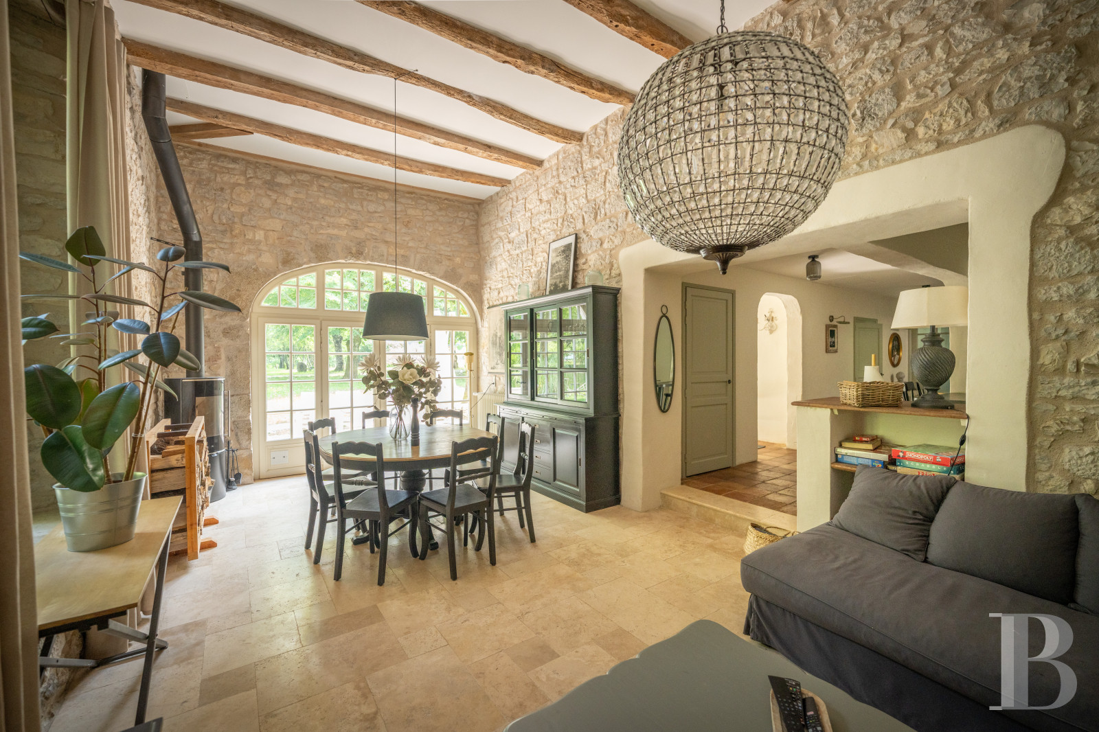 The manor house’s origins are thought to date back to the 13th century, which was a period when a former watchtower overlooked the descent into the valley. The current residence was enlarged over the centuries and is now made up of several sections adjoining each other or set perpendicularly, standing around a round tower housing a spiral staircase and a former vaulted passageway that was the original entrance to the property. The two-storey residence, topped by convertible attics, is made of local limestone beneath a roof of small flat tiles that has been recently renovated. Light streams through the regularly laid-out windows and doors into dual aspect rooms with generous volumes, boasting period fireplaces, traditional flooring and exposed beams, which combine to form a welcoming atmosphere. It has been carefully restored and combines preserved authenticity with potential for development, according to needs.