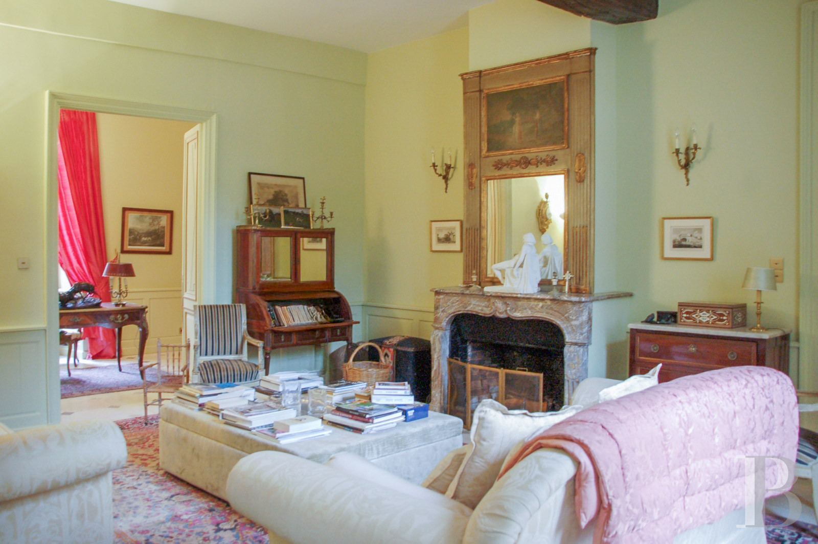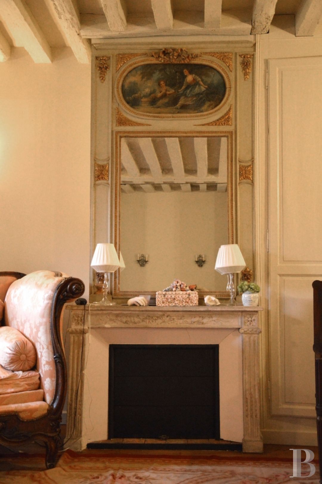 De l’autre côté du vestibule, un premier salon se distingue par ses lambris d’appui et sa cheminée en marbre à bas-relief. Une grande porte en bois mène à un bureau, qui communique avec un second salon parqueté à points-de-Hongrie. La pièce est ornée des boiseries décorées de douze médaillons inspirés d’un modèle du 18 e s., conservé au musée Carnavalet. Réalisés sur le thème des fables de La Fontaine, ils reprennent des compositions du peintre Jean-Baptiste Oudry. La salle de réception est également rehaussée de moulures, de rosaces et d’une cheminée en pierre. La dernière pièce du rez-de-chaussée est une entrée avec cheminée monumentale qui jouxte une salle technique.
