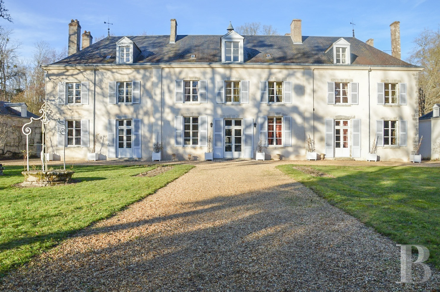 Édifiée au 18e s. dans un style classique, elle est édifiée selon un plan rectangulaire aux lignes sobres et symétriques. Entièrement restaurée, elle développe environ 500 m² habitables, hors combles répartis sur trois niveaux. Une corniche met en valeur la toiture à quatre pans couverte d’ardoise, percée de nombreuses lucarnes surmontées d’un petit fronton et ponctuée de souches de cheminée en brique. Les façades en pierre, enduites de couleur beige, sont rythmées par de larges baies et des œils-de-bœuf aux encadrements en pierre de taille. Chaque porte est précédée de quelques marches en pierre qui en soulignent les accès.