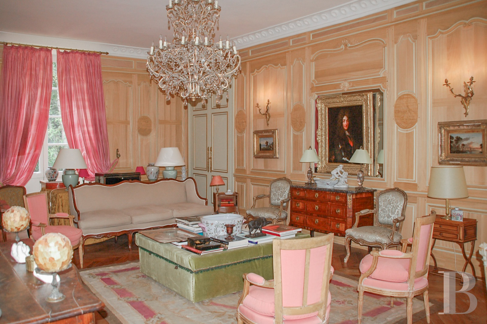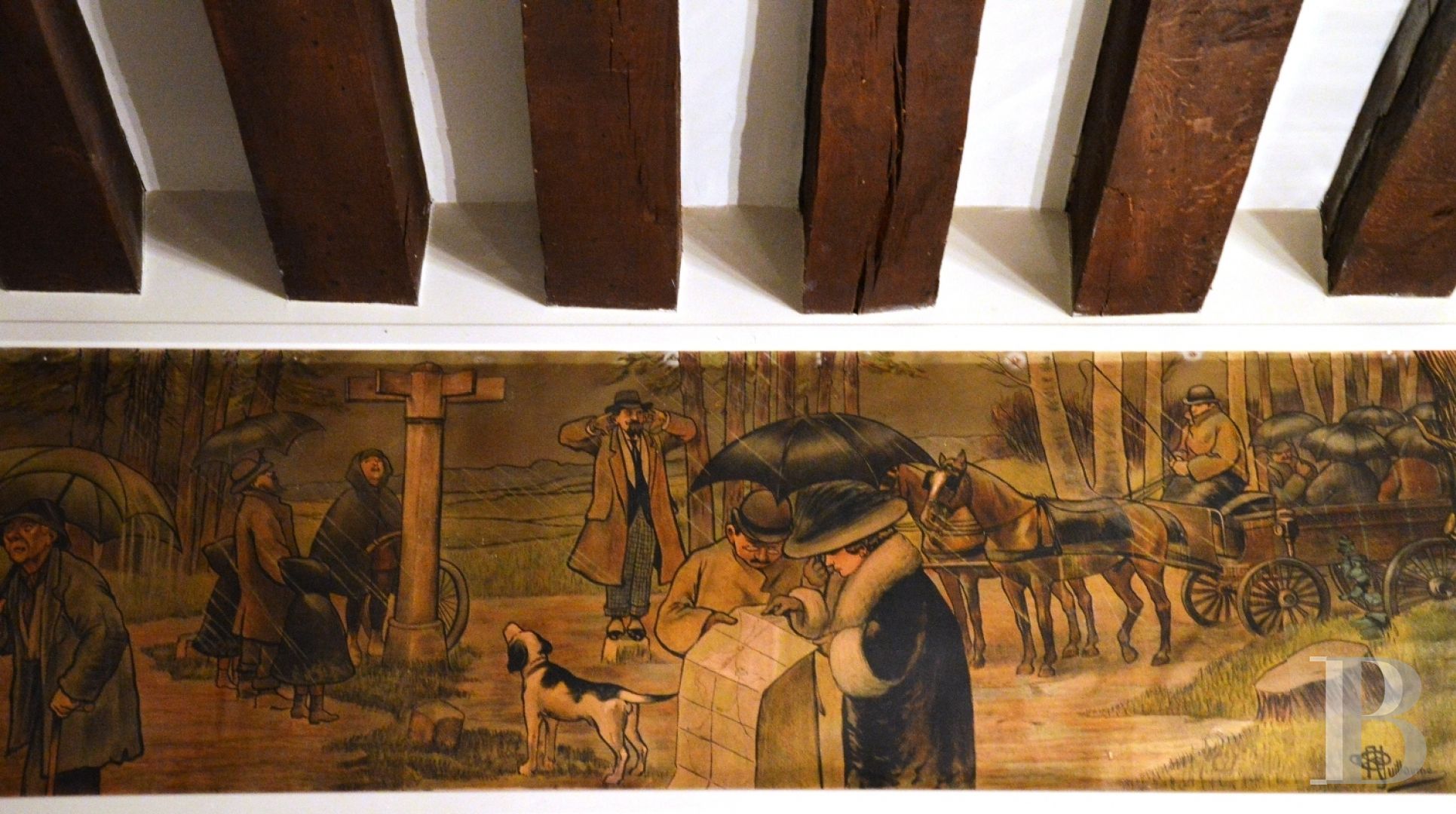 Avec une superficie d’environ 240 m² et 3,5 m de hauteur sous plafond, il s’organise autour d’un vaste vestibule traversant, percé de quatre grandes portes en bois, qui distribue les deux côtés du logis. D’un côté, une entrée dont la baie a conservé son coussiège en carreaux de ciment se divise en trois espaces : un couloir équipé de grandes penderies, des toilettes avec lavabo et une seconde entrée vers un escalier tournant en chêne doublé d’une rambarde en fer et d’une main courante en bois. Dans le prolongement, une petite salle à manger avec habillage mural blanc finement sculpté jouxte une cuisine sur-mesure, pourvue d’un évier en pierre, d’une imposante hotte en bois et d’une cheminée à foyer ouvert. Une vaste salle à manger, baignée de lumière et réchauffée par une cheminée en pierre, ouvre sur la terrasse en gravillon. Ses murs blancs sont décorés de lambris d’appui et d’une fresque de chasse peinte par Albert Guillaume, artiste et affichiste reconnu.