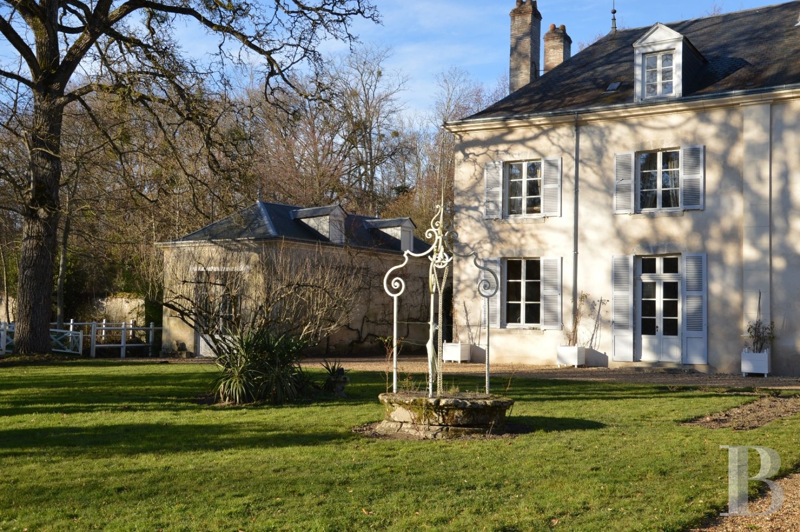 Deux pavillons de pierre, enduits d’un beige discret, encadrent la maison de maître. Leurs toitures à quatre pans, couvertes d’ardoise, sont mises en valeur par une corniche et ponctuées de lucarnes coiffées d’un petit fronton. L’un des pavillons, jadis d’orangerie, s’élève au-dessus d’une petite cave aménagée. Le second abrite une chapelle ainsi qu’un garage qui sert aujourd’hui de bûcher, grâce à sa proximité immédiate avec la maison.