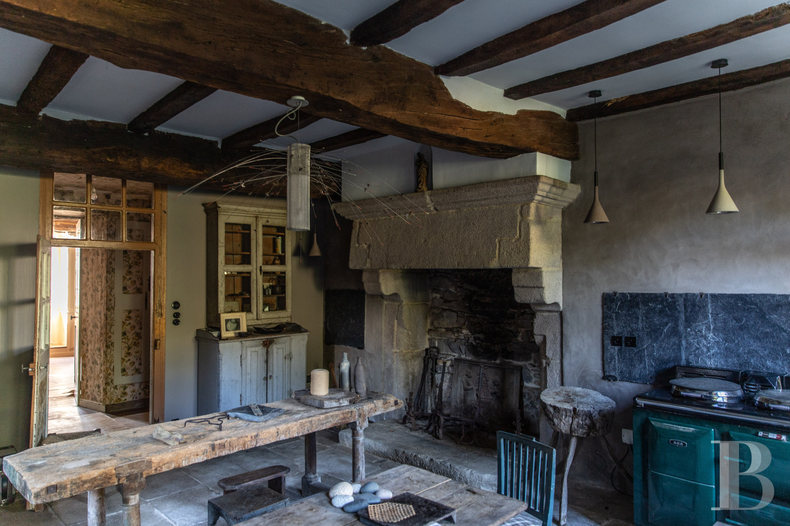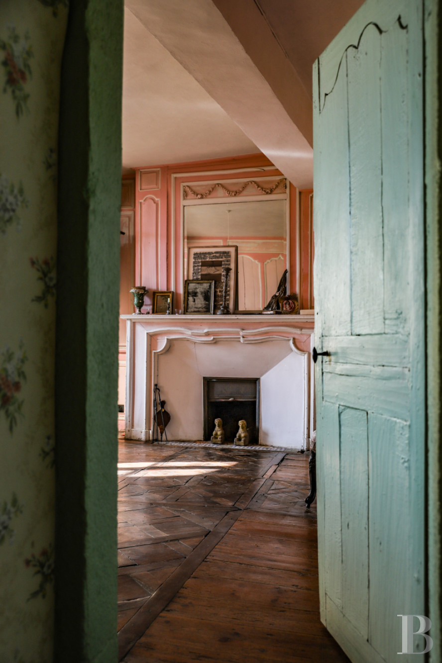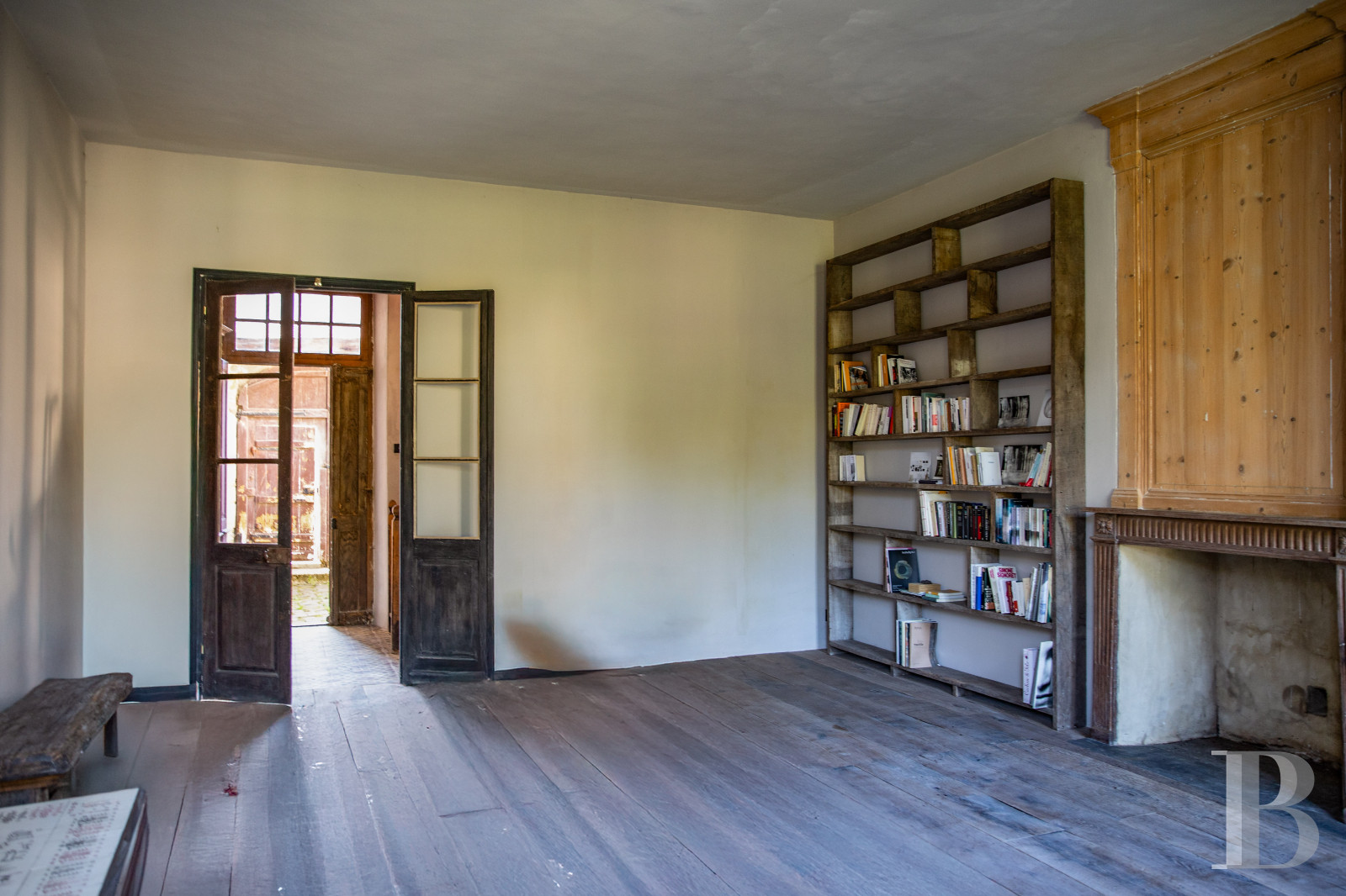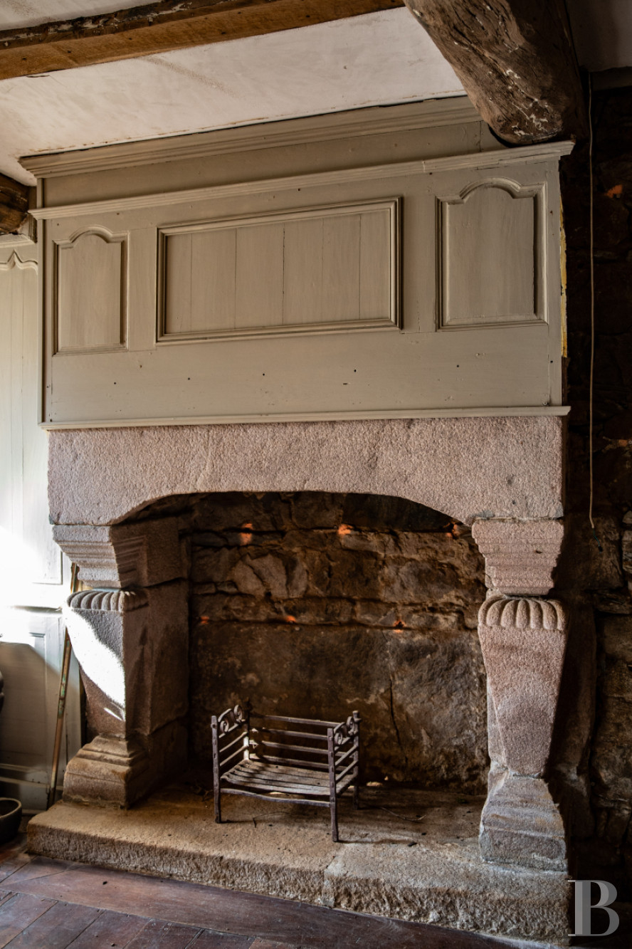 Le vestibule est authentique et épuré. Les murs sont enduits à la chaux. Au sol, est posé un carrelage ancien en carreaux de ciment, à caractère géométrique et répétitif. Le motif alterne losanges bordeaux pleins et dessins floraux stylisés bleus sur fond crème. Un salon sur parquet, orné d’une cheminée en bois de style Louis XVI dont le manteau s’élève jusqu’au plafond lui fait face. Il ouvre sur le jardin à l’arrière grâce à une large porte-fenêtre à deux vantaux. Un petit couloir au départ du vestibule dessert une salle à manger, une cuisine, une salle de douche, des toilettes et un hall secondaire. La cuisine est structurée par de larges poutres traversantes et des solives en bois massif. Un dallage de granit recouvre le sol. Certains murs sont en pierre apparente, d’autres sont enduits à la chaux. Une cheminée monumentale en pierre se distingue. La salle à manger est vaste. Ses baies ouvrent côté rue. Des boiseries sont encore en place et une cheminée de granit est également présente. La salle de douche a la particularité d’être accessible par la porte d'un grand meuble en bois ancien. Enfin, à proximité, une large trappe au sol cache l’entrée d’un escalier à vis en granit qui descend vers la cave. De même, une porte semi-vitrée donne sur une petite cour extérieure et son ancien lavoir.