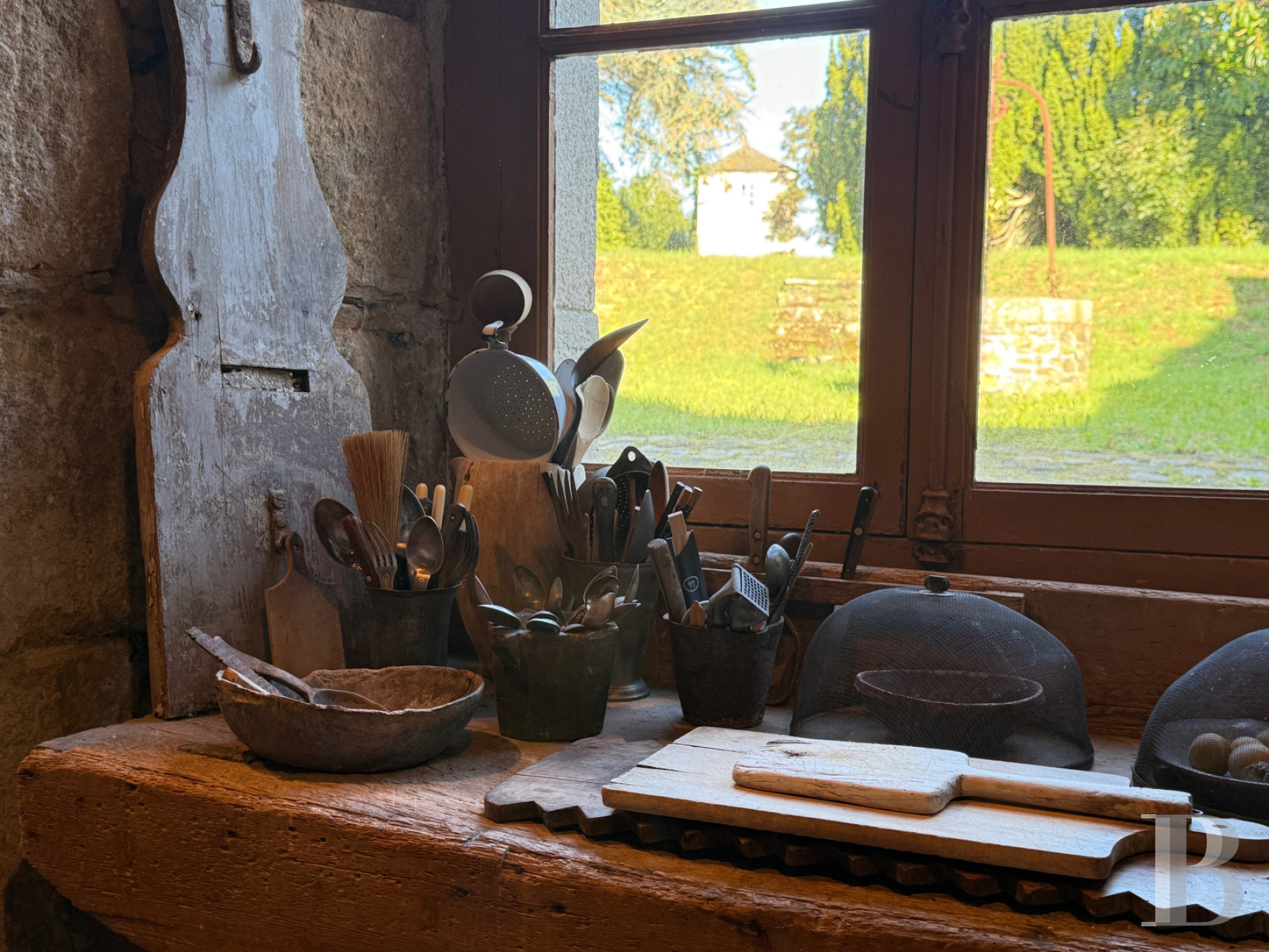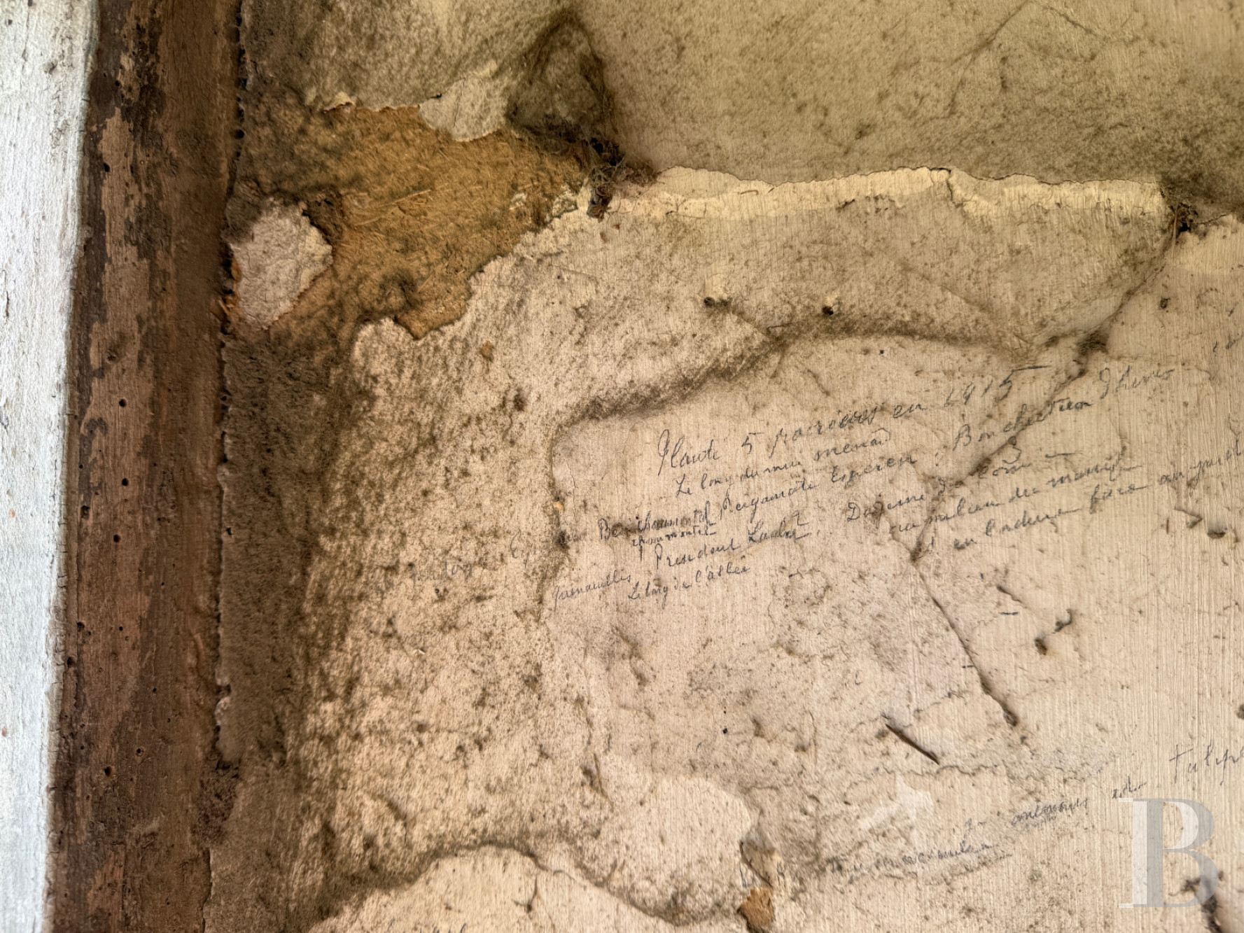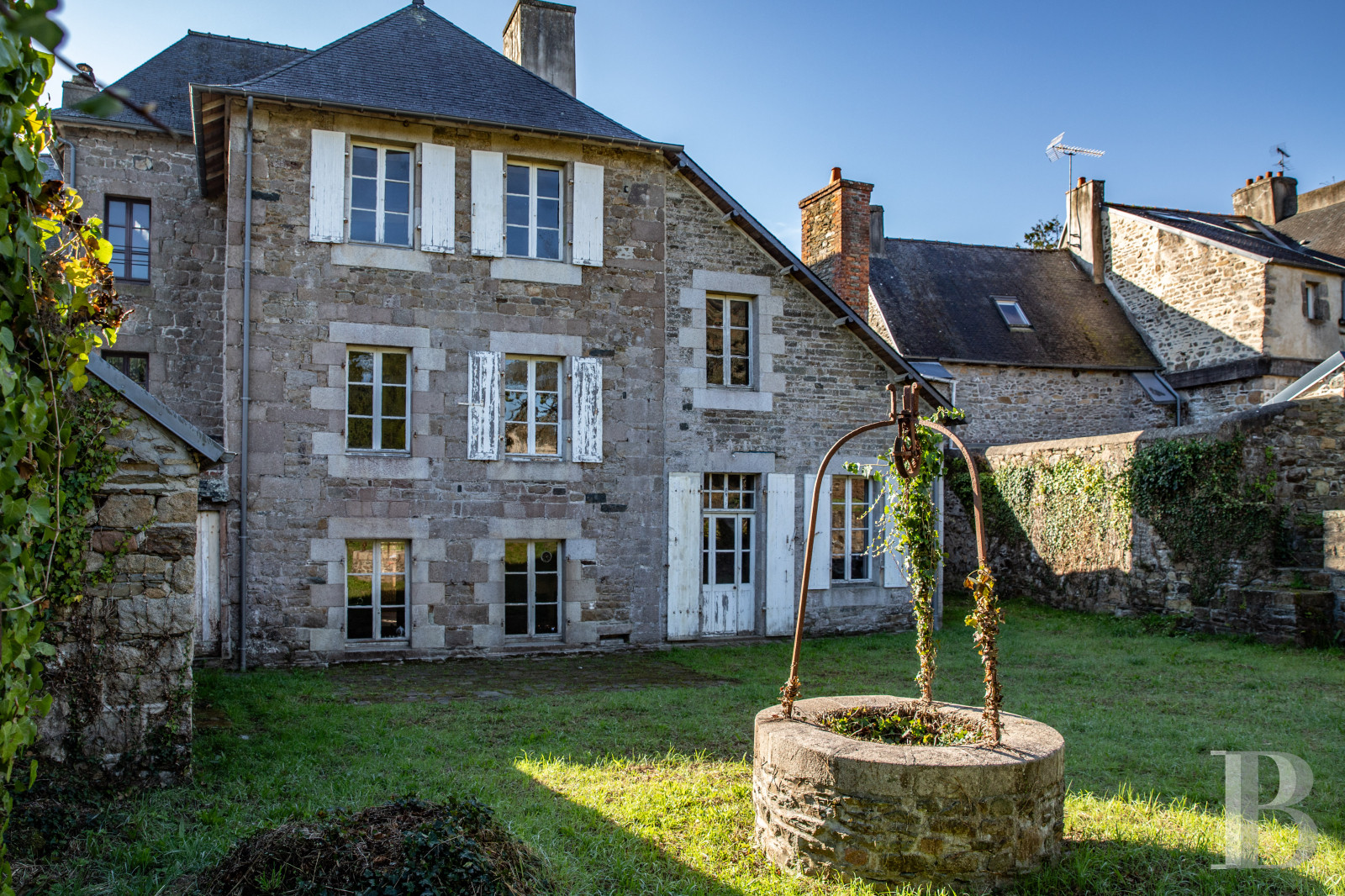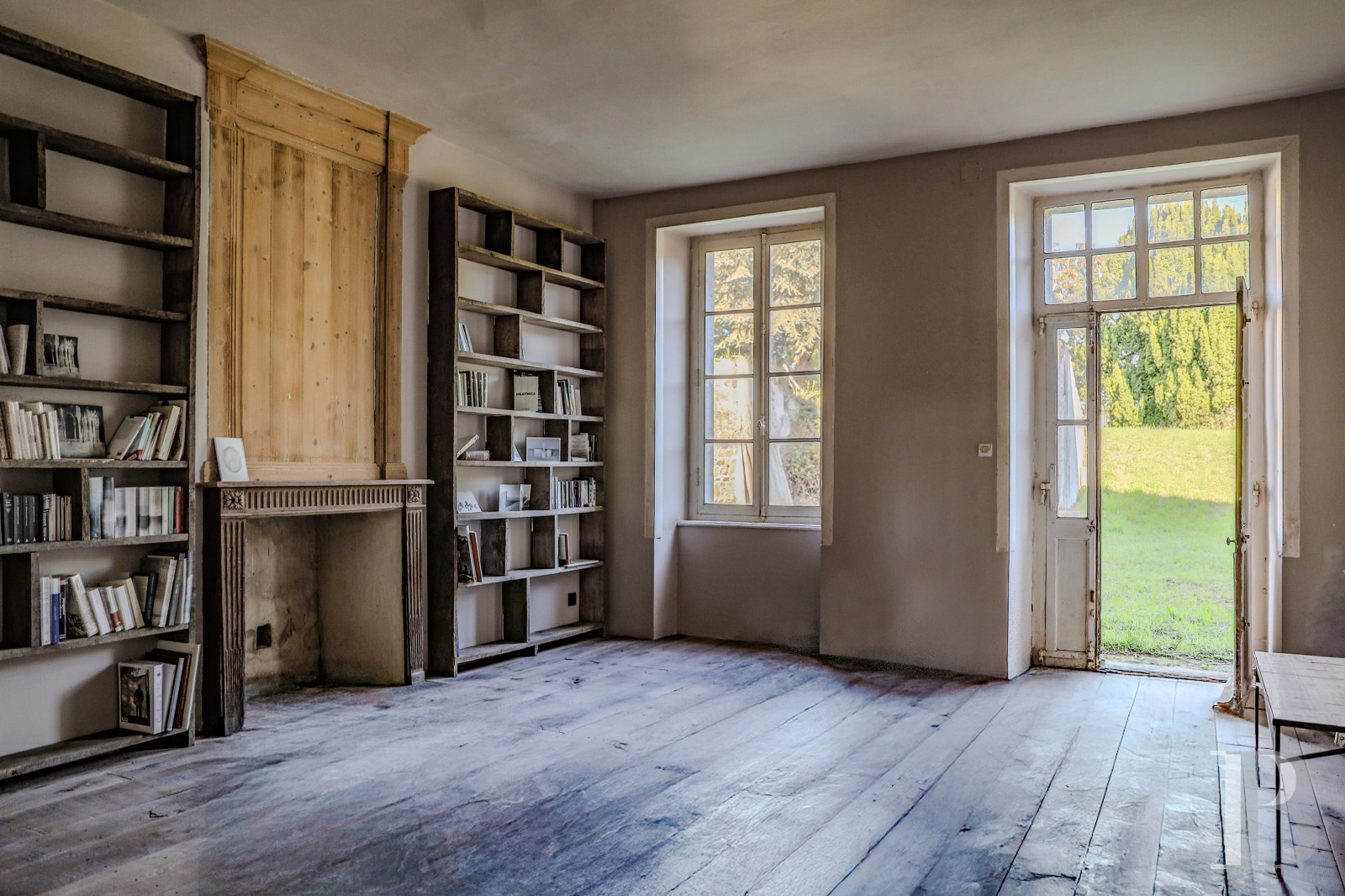 Le vestibule est authentique et épuré. Les murs sont enduits à la chaux. Au sol, est posé un carrelage ancien en carreaux de ciment, à caractère géométrique et répétitif. Le motif alterne losanges bordeaux pleins et dessins floraux stylisés bleus sur fond crème. Un salon sur parquet, orné d’une cheminée en bois de style Louis XVI dont le manteau s’élève jusqu’au plafond lui fait face. Il ouvre sur le jardin à l’arrière grâce à une large porte-fenêtre à deux vantaux. Un petit couloir au départ du vestibule dessert une salle à manger, une cuisine, une salle de douche, des toilettes et un hall secondaire. La cuisine est structurée par de larges poutres traversantes et des solives en bois massif. Un dallage de granit recouvre le sol. Certains murs sont en pierre apparente, d’autres sont enduits à la chaux. Une cheminée monumentale en pierre se distingue. La salle à manger est vaste. Ses baies ouvrent côté rue. Des boiseries sont encore en place et une cheminée de granit est également présente. La salle de douche a la particularité d’être accessible par la porte d'un grand meuble en bois ancien. Enfin, à proximité, une large trappe au sol cache l’entrée d’un escalier à vis en granit qui descend vers la cave. De même, une porte semi-vitrée donne sur une petite cour extérieure et son ancien lavoir.