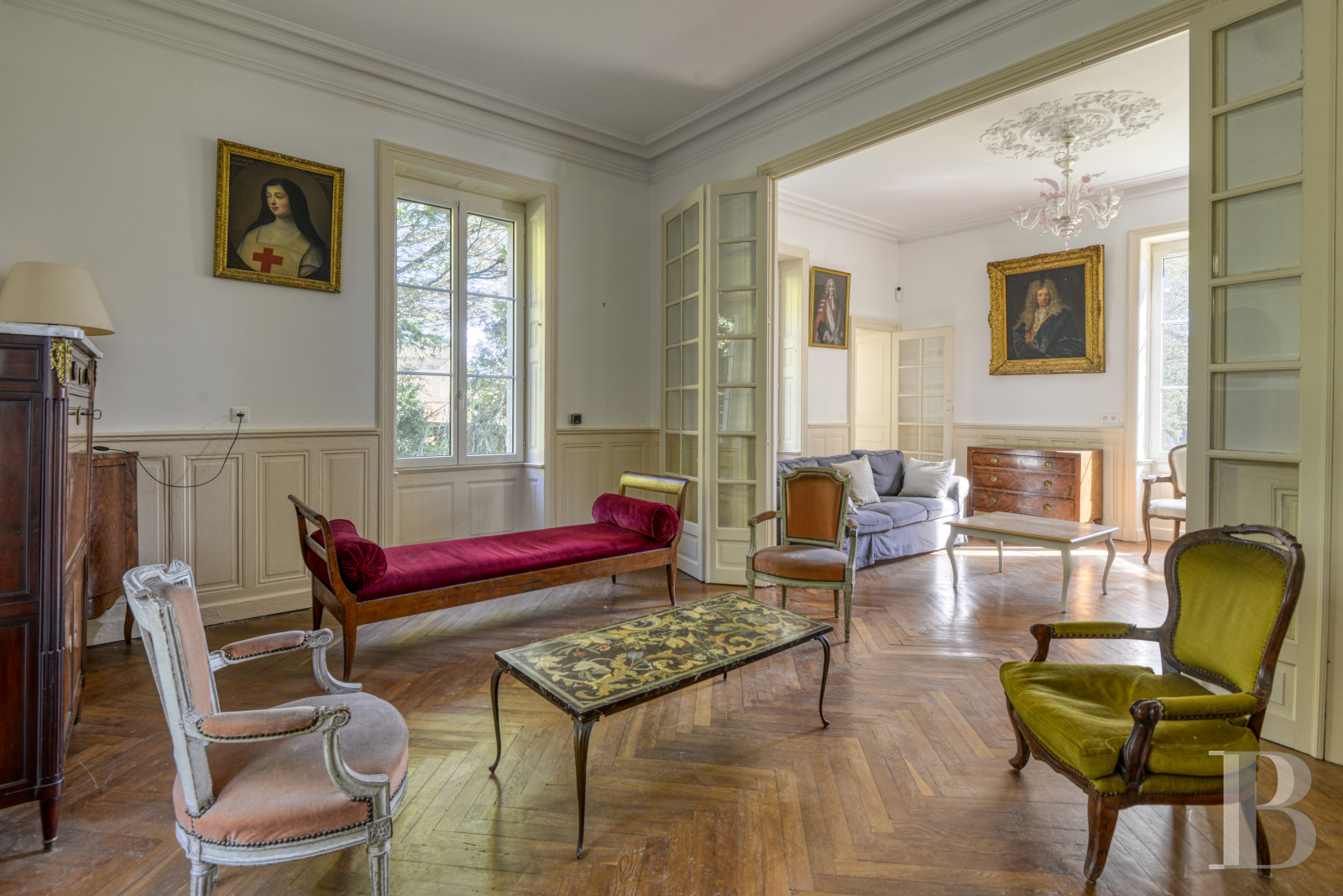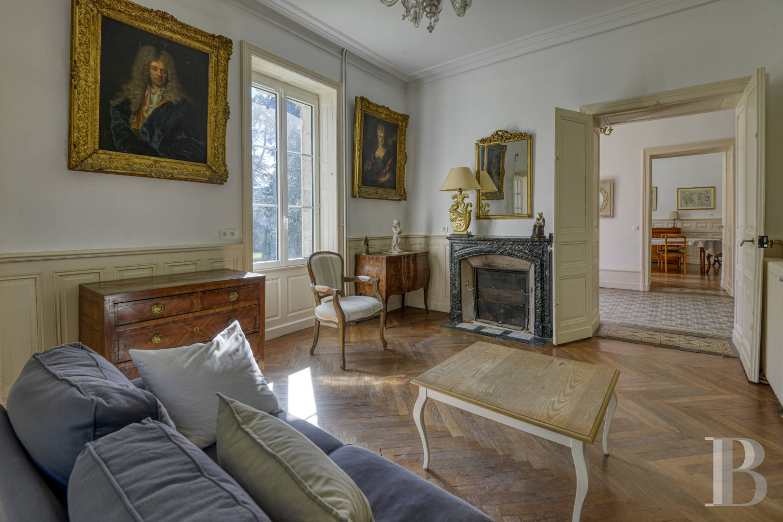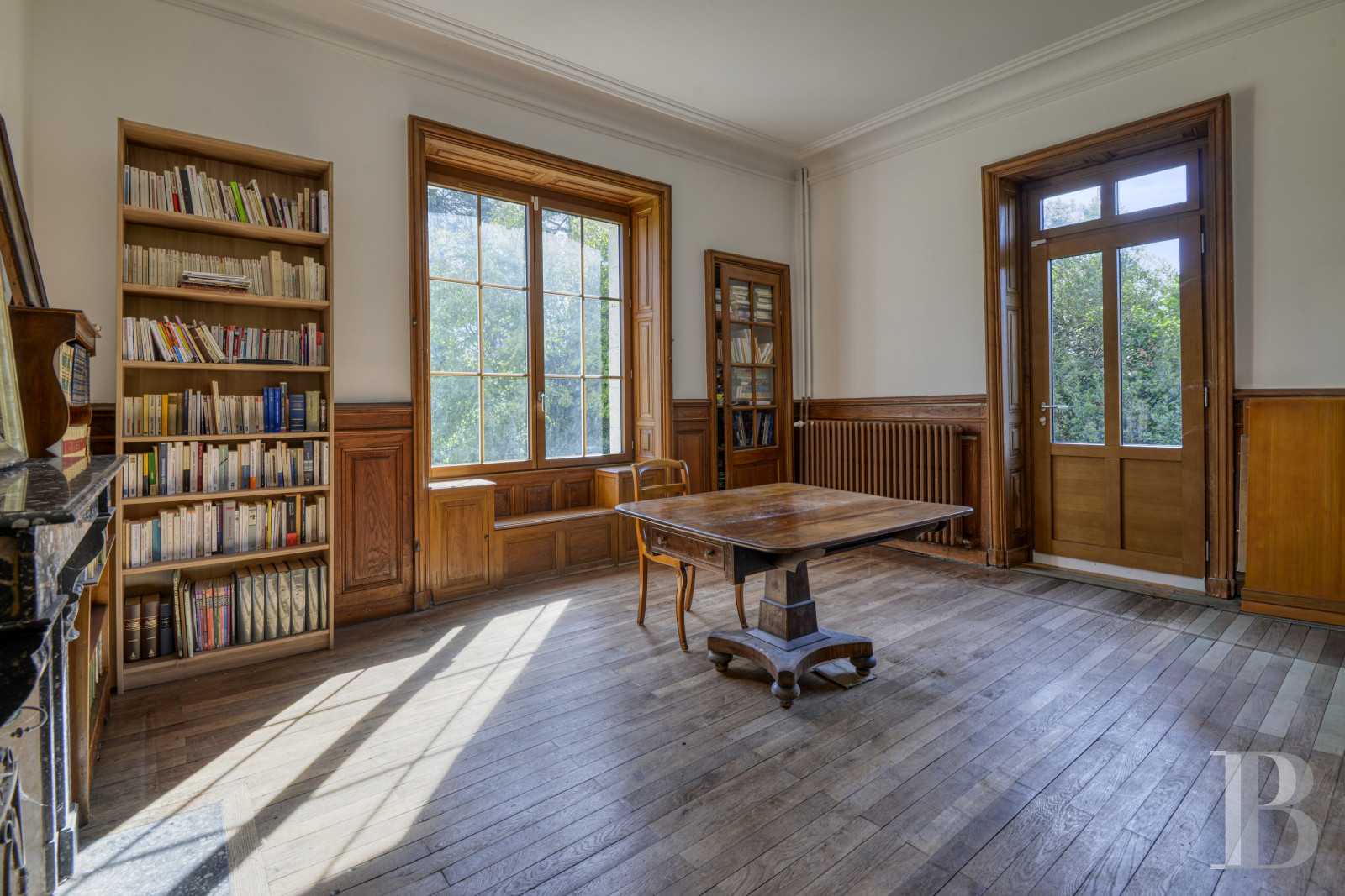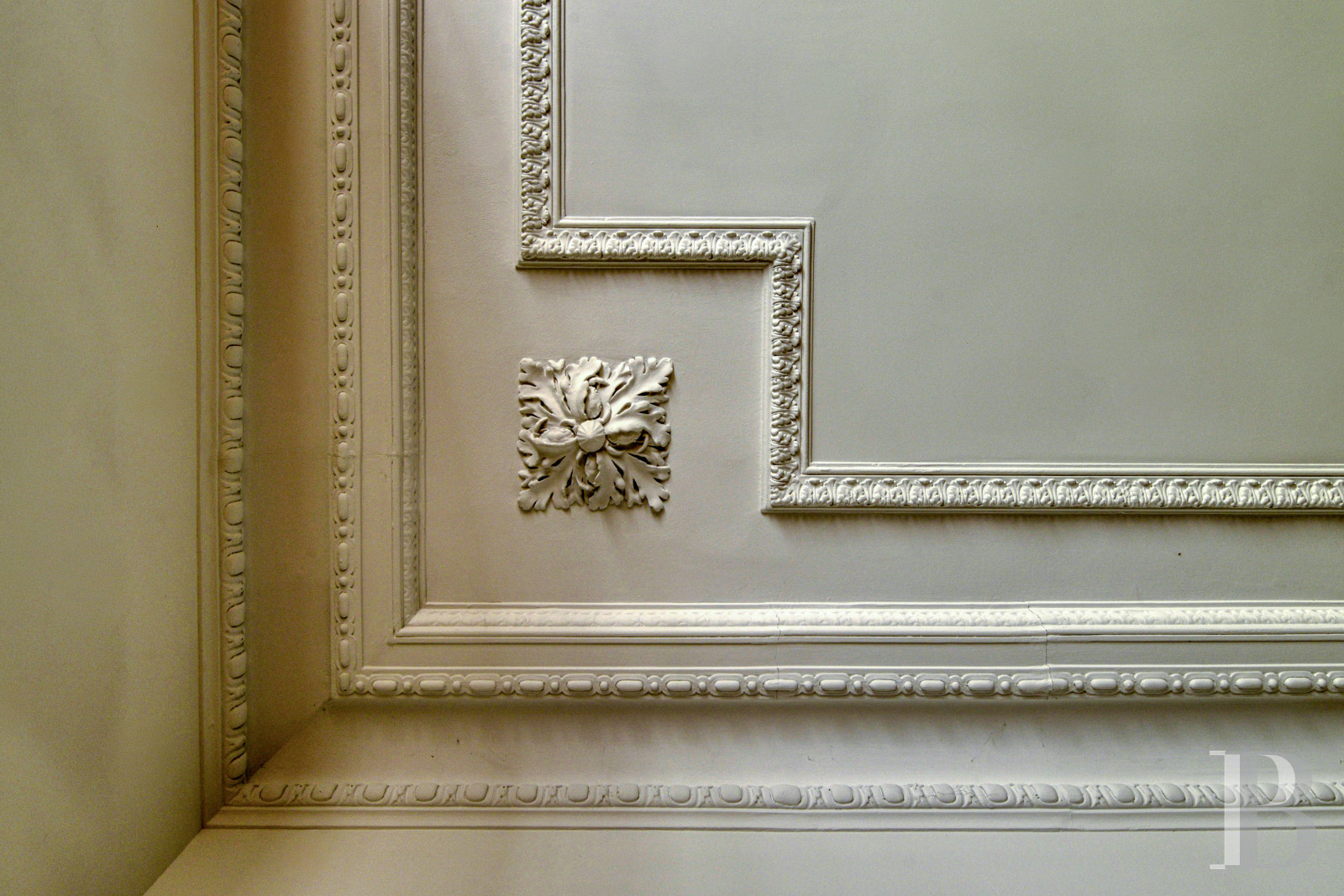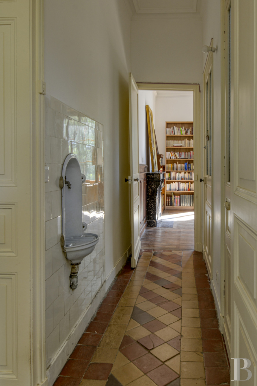 Dans la partie ouest, une salle à manger est parquetée à points-de-Hongrie. Rosaces, lambris d’appui et cheminées en marbre témoignent du soin apporté à l’ornementation intérieure, tandis que la hauteur sous plafond atteint 3,30 m. La tour carrée abrite un couloir de dégagement au sol de tomettes posées en diagonale. Les murs partiellement carrelés conservent une ancienne fontaine murale en faïence, rappel discret de l’usage domestique des lieux. L'espace conduit à une ancienne chambre de 20 m² environ, aujourd’hui utilisée comme bibliothèque. La pièce, aux volumes réguliers et aux moulures discrètes profite d’une double exposition et est prolongée d’une salle de douche avec toilettes.