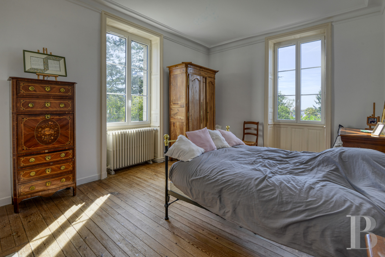 Le premier étage de 146 m² environ est occupé par des espaces privés. Il comprend cinq chambres de 19 à 21 m² environ, toutes avec une belle hauteur sous plafond, une double exposition, des cheminées en marbre aux nuances variées et des parquets à lames droites. Un petit bureau, installé dans la tour ronde, conserve un mur en pierre apparente soigneusement jointoyé. L’étage compte aussi une salle de bains et une salle de douche, chacune assortie de toilettes. Enfin, une vaste pièce traversante a été aménagée en garde-robe.