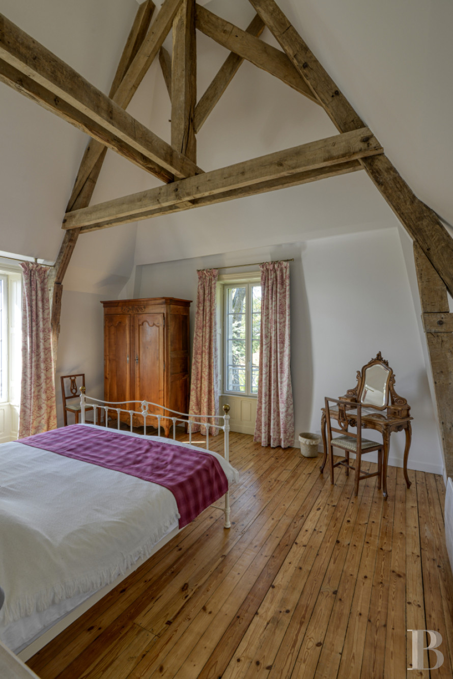 Sous les combles, dont les plafonds ont été supprimés pour laisser apparaître la charpente après isolation, le dernier niveau d’environ 135 m² est occupé par trois chambres, une salle de douche, une salle de bains et un petit salon. Les sols sont parquetés de larges lames de bois blond. La hauteur sous plafond et de hautes baies baignent les pièces de lumière. Ces espaces, à la fois sobres et élégants, se prêtent aussi bien à un aménagement familial qu’à l’accueil d’hôtes. Une vaste pièce de 37 m² environ, dite salle de jeu, avec accès à la tour ronde, reste à achever.