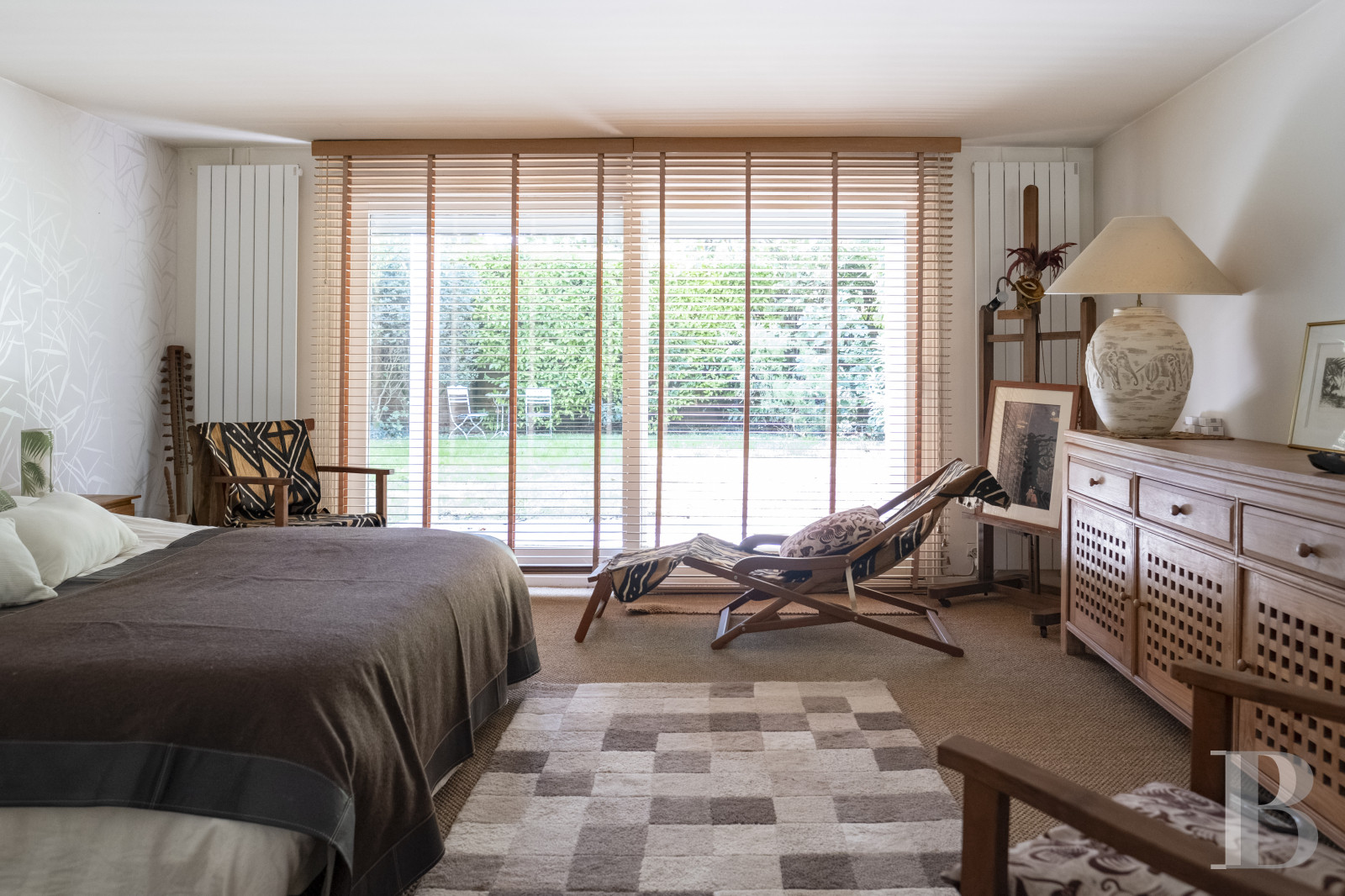 En pénétrant dans le salon, une rampe ornée d’une sphère « cristal soleil », invite à emprunter un escalier en chêne pour atteindre le niveau supérieur de l’édifice. Le palier, qui a été cloisonné en partie, distribue sur sa gauche la chambre principale composée d’une pièce de nuit de plus de 14 m², ouverte sur un balcon, qui surplombe le petit bras de la Marne et domine les arbres. Une garde-robe, autrefois chambre de presque 14 m², apporte un confort non négligeable. Une salle de bains spacieuse de plus de 19 m² avec douche italienne et baignoire ainsi que des toilettes s’ouvre sur une terrasse-solarium offrant une vue plongeante sur le côté opposé de l’île. Le palier peut être ouvert pour revenir au plan initial de la maison.