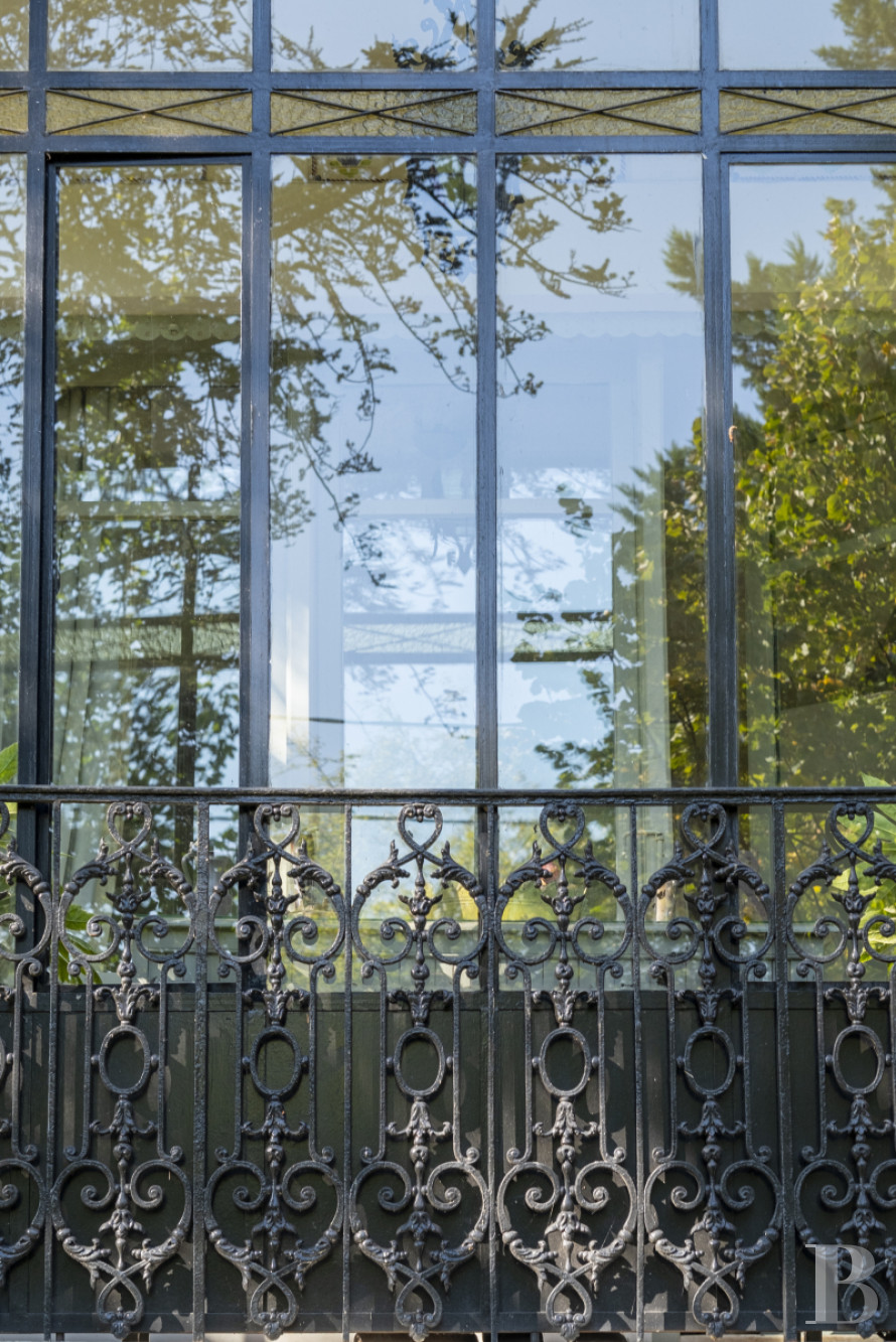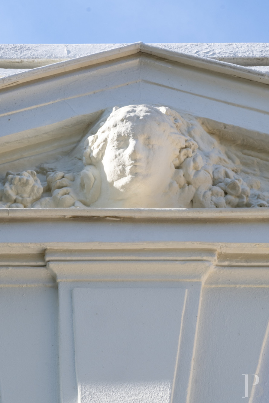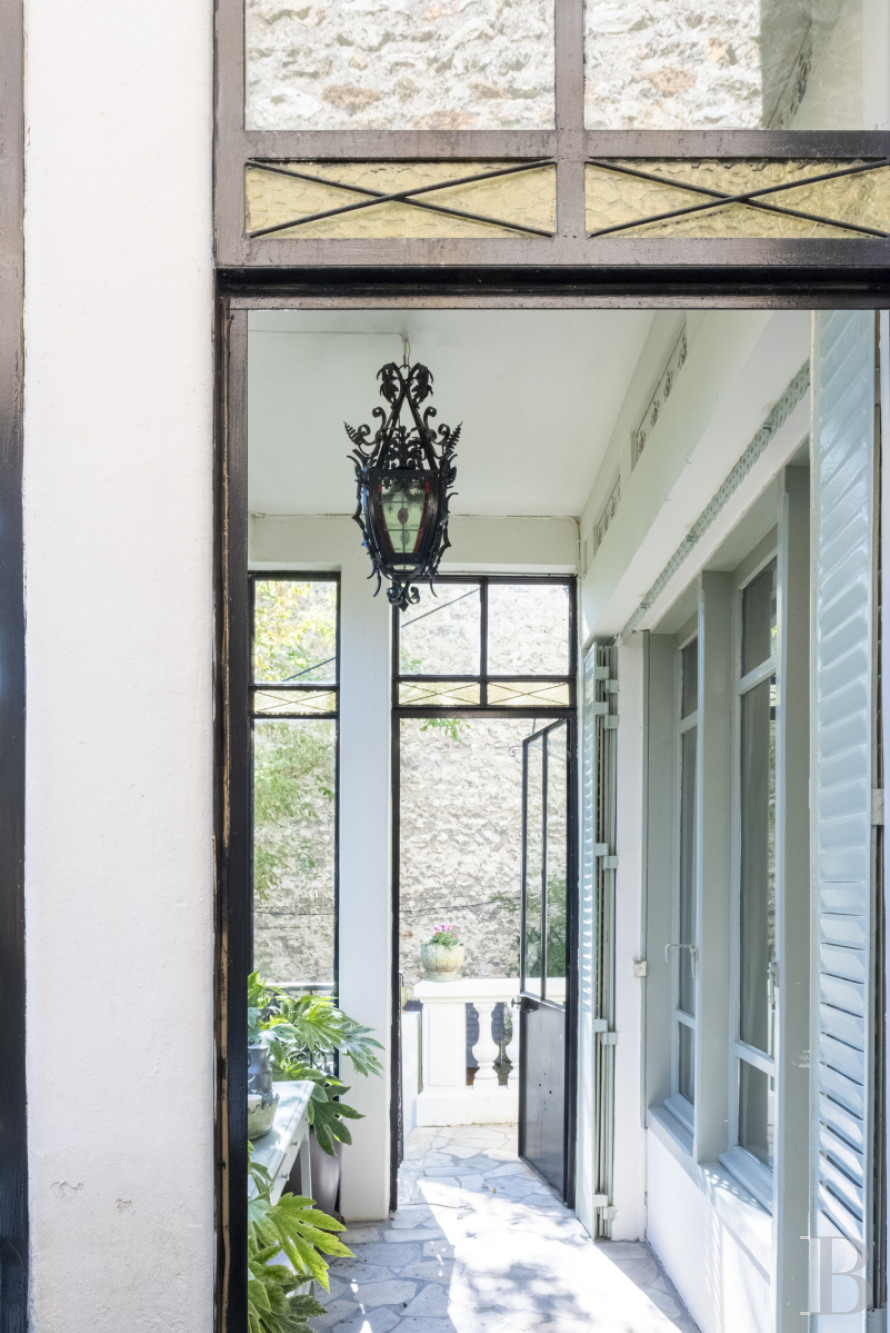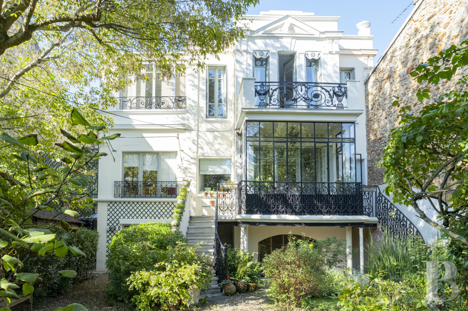 Le portail en fer forgé ouvre sur un jardin à l’abondante végétation, ponctué des multiples couleurs des rosiers, des lilas ou de l’oranger du Mexique, parfumé d’essences de rose, de verveine, de jasmin et de lavande. Après avoir cheminé sous l’arche végétale, la bâtisse au fronton triangulaire orné d’une tête d’ange s’élève haut dans le ciel. Les deux bras des escaliers en berceau s’ouvrent tel un décor de cinéma, comme pour honorer la mémoire de son ancien propriétaire, monsieur Meurice, chef décorateur dans le 7e art, et pour rappeler la présence des anciens studios de tournage de Joinville, situés non loin. Le perron d’entrée de la maison est accessible par une volée de marches en pierre à double montée parallèle, légèrement galbée et à double palier de repos. La balustrade rampante en ferronnerie fait écho à la structure de la verrière en fer forgé et aux fenêtres étroites et régulières de la véranda du perron d’une surface de près de 5 m². L’ouvrage apporte de la majesté à l’ensemble de la façade. La console du perron, galbée, est soutenue par quatre colonnes pour laisser passer la lumière des pièces du rez-de-jardin. La véranda, en surplomb de l’avant du jardin et de son petit étang, abrite une entrée lumineuse et ouvre une perspective sur la Marne.