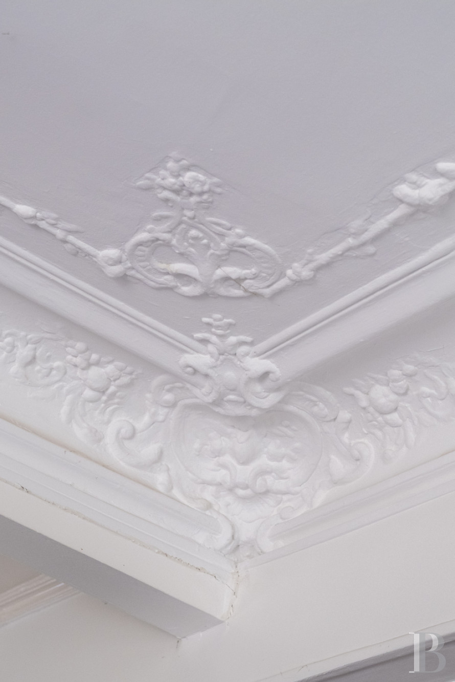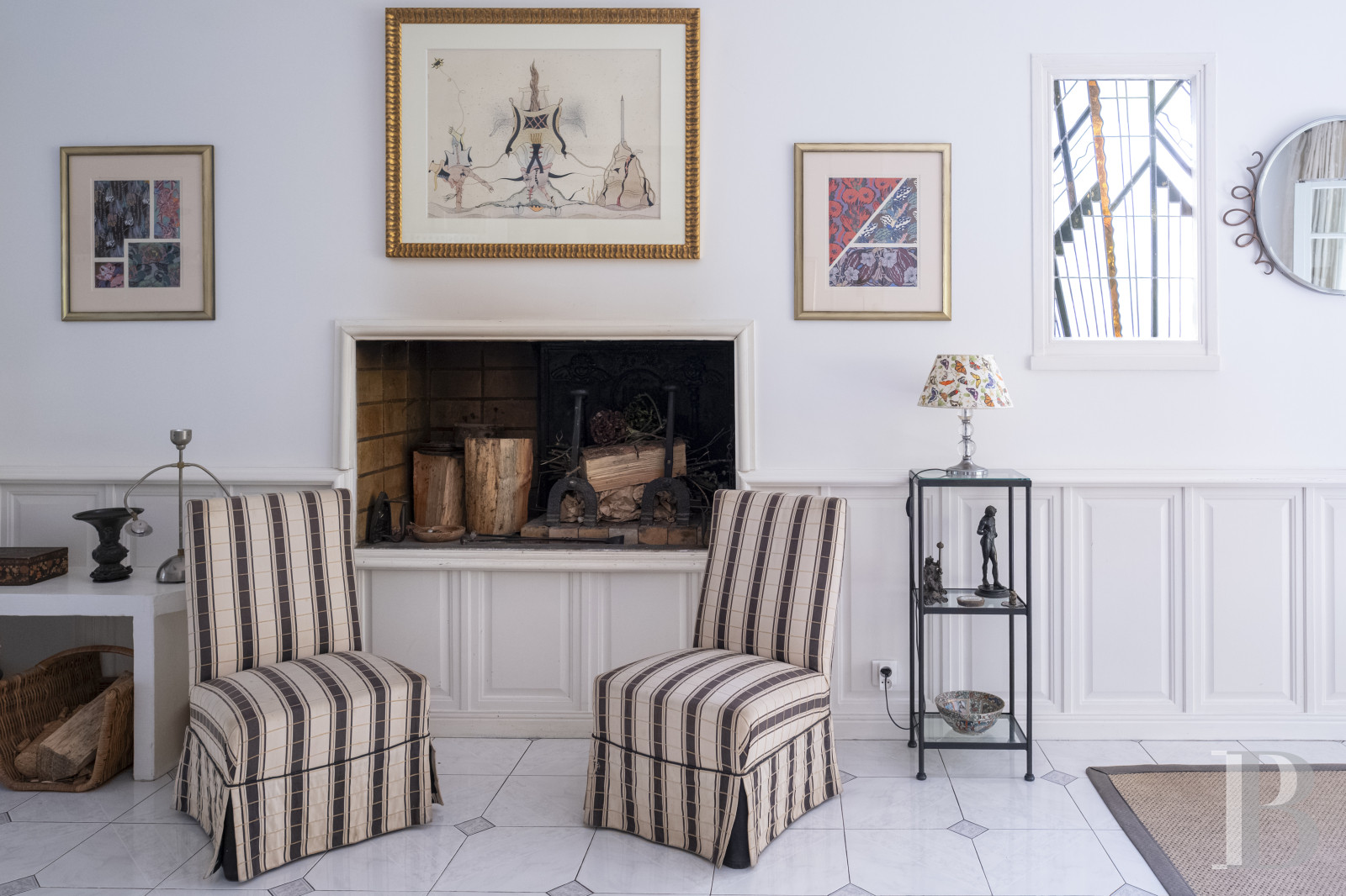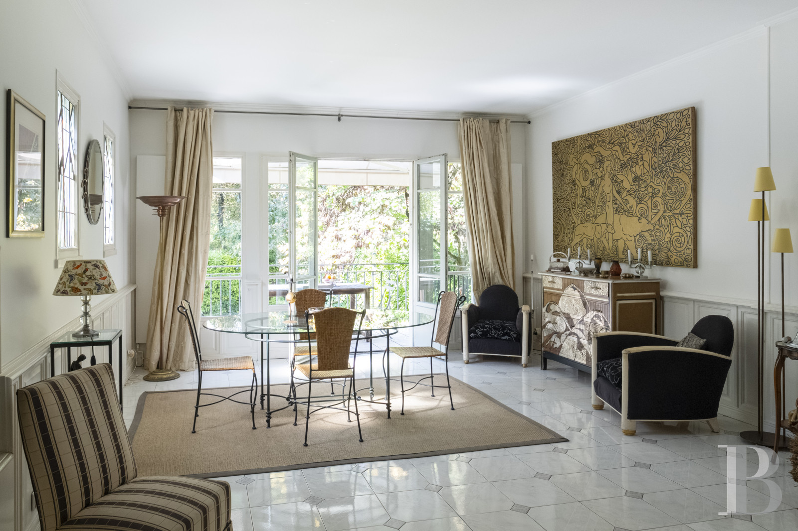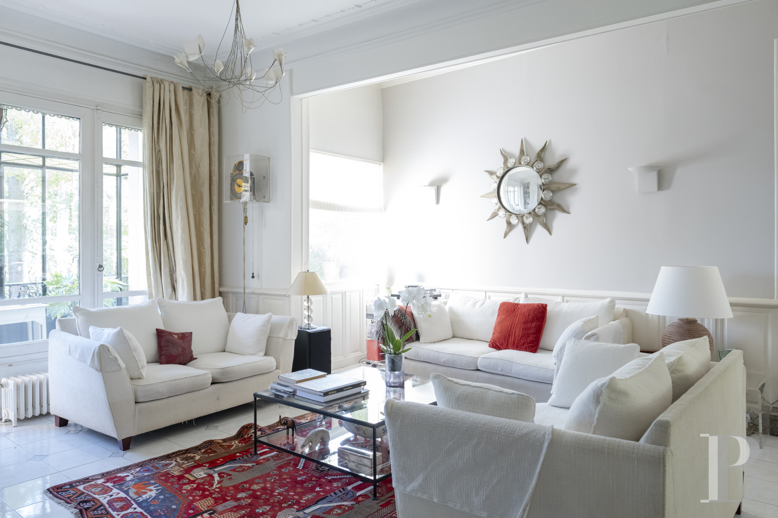 Un salon, traversant et de style classique, dispense une atmosphère chaleureuse. Il constitue l’axe central autour duquel s’articulent les différents espaces de la maison. Les corniches ornées de moulures qui couronnent le plafond indiquent l’empreinte initiale de la pièce, avant qu’elle ne soit agrandie. Une porte-fenêtre ouvre sur l’arrière du jardin. À gauche se trouvent deux marches en angle, en marbre gris irisé de blanc, qui contrastent avec le sol en carrelage clair à cabochons ; une configuration qui semble délimiter l’accès à l’espace cuisine et salle à manger qui se trouve légèrement surélevé. Le second espace, ouvert et traversant, s’étend jusqu’à une terrasse avec vue sur l’arrière du jardin et une perspective sur l’autre rive de l’île. La sophistication et le cachet de la salle à manger, grâce aux lignes géométriques et aux ressources visuelles puissantes, dont les vitraux sont emblématiques, confirment le style « Art déco » qui a influencé la conception de la maison. Un foyer en briquettes de couleur feu annonce la convivialité de futurs dîners. Les nombreuses baies de l'espace d’environ 77 m² procurent une grande luminosité. Les toilettes indépendantes, ornées d’éléments décoratifs d’époque, présentent un sol en ciment agrémenté d’une frise de motifs hexagonaux et floraux aux tons bleu-gris et brun, typiques de l'époque de la construction.
