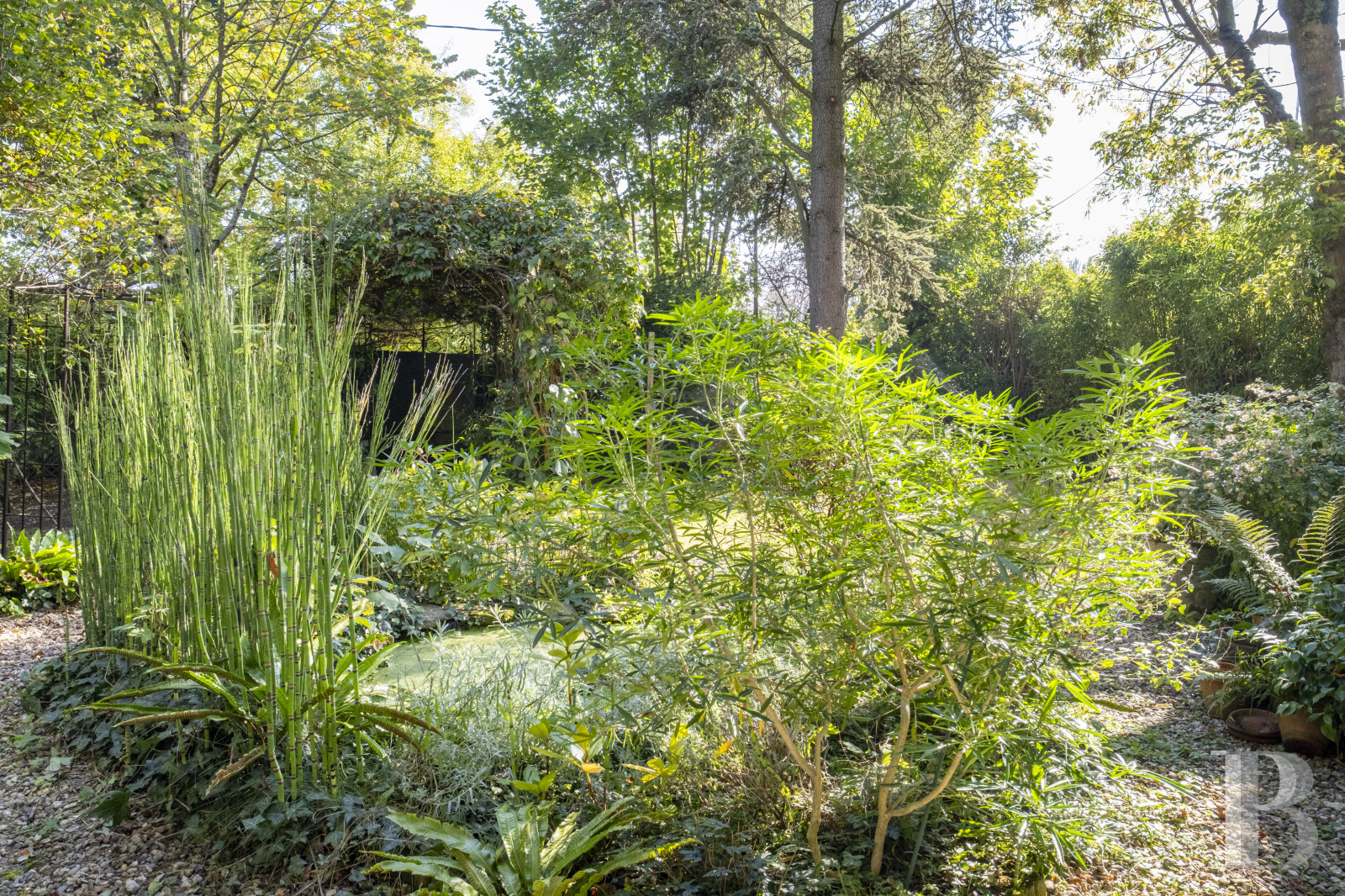 D’une superficie d’environ 430 m², le jardin présente une végétation foisonnante, mais bien ordonnée, alternant zones ombragées et espaces de détente ensoleillés. Il entoure la résidence. Sa section avant, paysagée, invite à emprunter les allées qui contournent un petit étang pour atteindre quelques marches d'escalier qui mènent à la propriété. Le côté gauche de la maison permet d’accéder à l’arrière du jardin. Sur le chemin, une porte se distingue de l’entrée principale de la demeure. Elle conduit au second bureau, situé en rez-de-jardin. L’arrière du jardin est également accessible depuis le salon par quelques marches. Le prolongement de verdure constitue un vaste espace de jeu ou de détente, à l’abri de grands arbres. De ce côté, la terrasse de la salle à manger ou encore le solarium du premier étage dominent. Une terrasse semi-couverte et dallée de pierre présente un lieu ombragé pour se détendre. La chambre invités ouvre directement sur la terrasse de l’arrière du jardin.