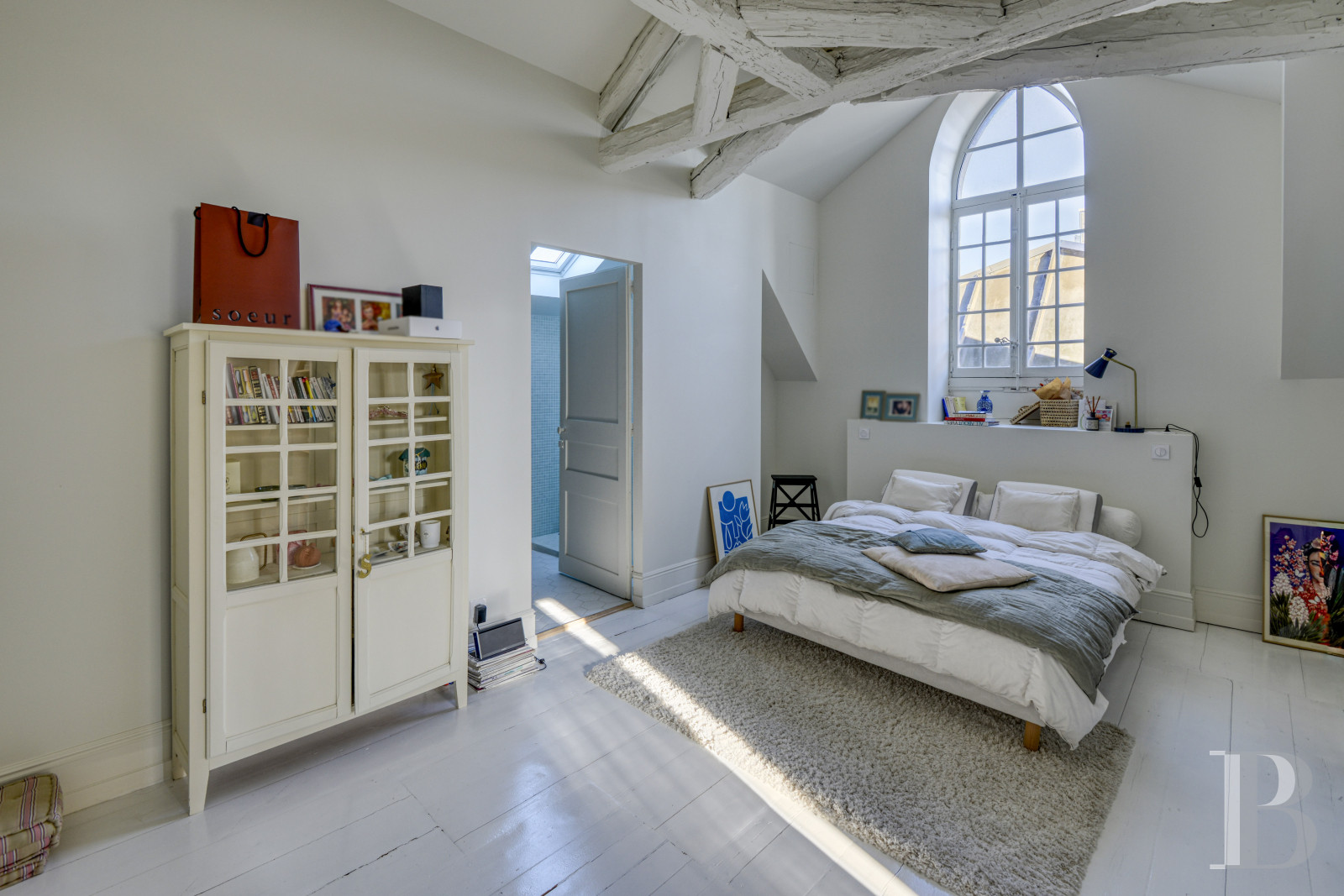 Il est aménagé est dans une ambiance plus chaleureuse et rustique que les niveaux inférieurs. Dès le palier, suffisamment large pour être aménagé, le sol est parqueté à lames larges, comme l’escalier. L'espace distribue une première pièce en face, côté jardin, et un couloir vers trois chambres. La première pièce est actuellement utilisée en salle de sport, mais pourrait servir de chambre. Après des toilettes, les chambres sont organisées autour d’un salon d’étage, qui peut être utilisée en salle de jeux, salle de musique ou bibliothèque. Les pièces gardent l’atmosphère de l'ancien grenier, avec des sols parquetés de larges lames de bois rustiques, recouvertes d’une résine blanche, ainsi qu'une charpente apparente, peinte aussi en blanc. Un premier ensemble est composé d’une chambre, un coin garde-robe et une salle d’eau. S'ensuit une chambre seule, puis un dernier ensemble, composé d’une chambre, d'une garde-robe, d'un bureau et une salle d’eau.
