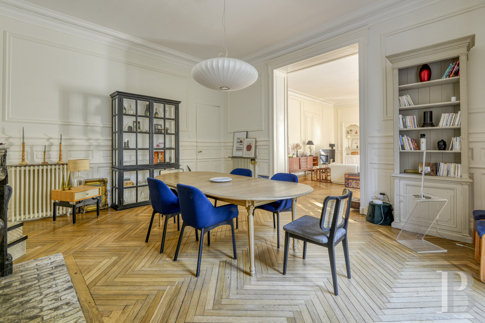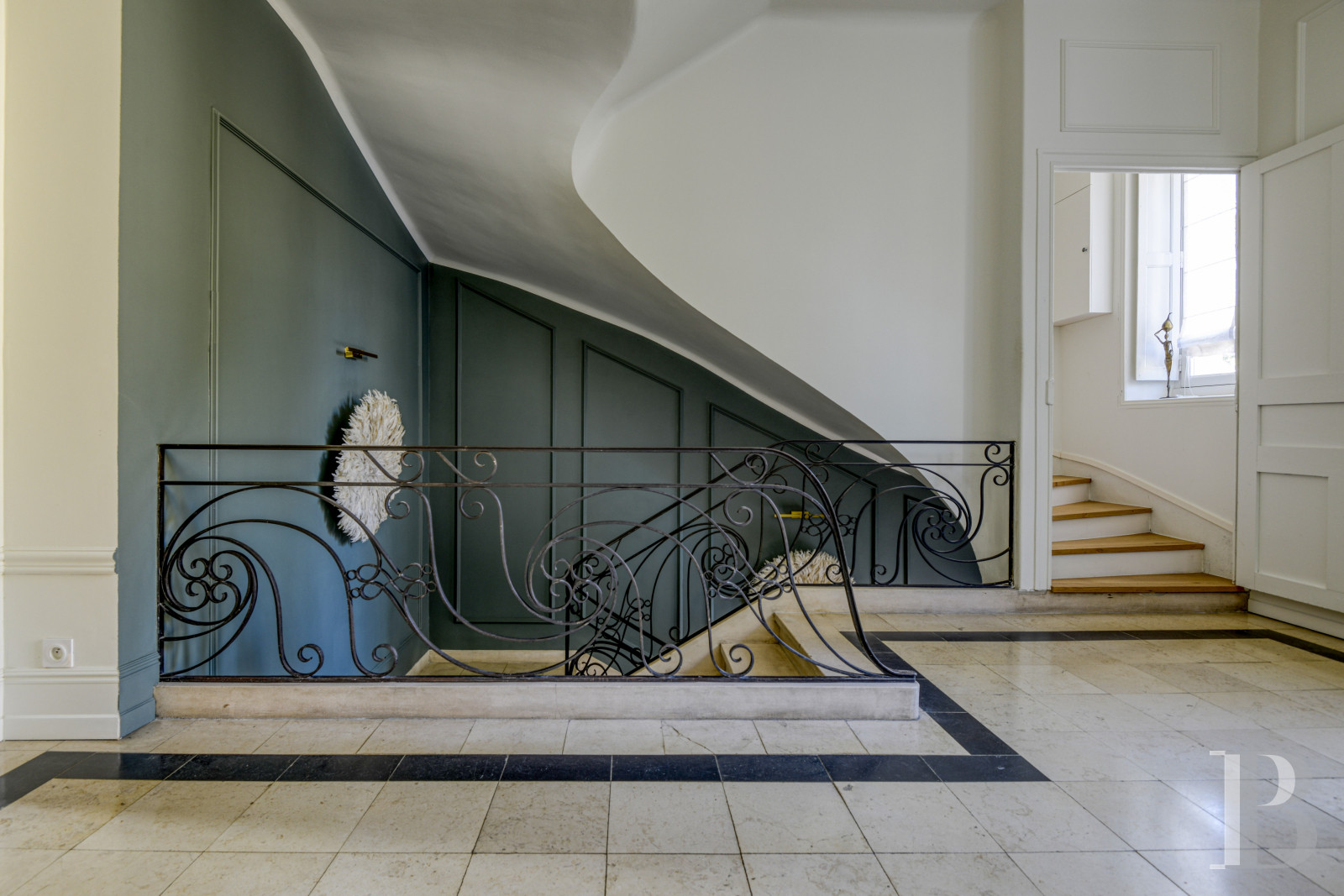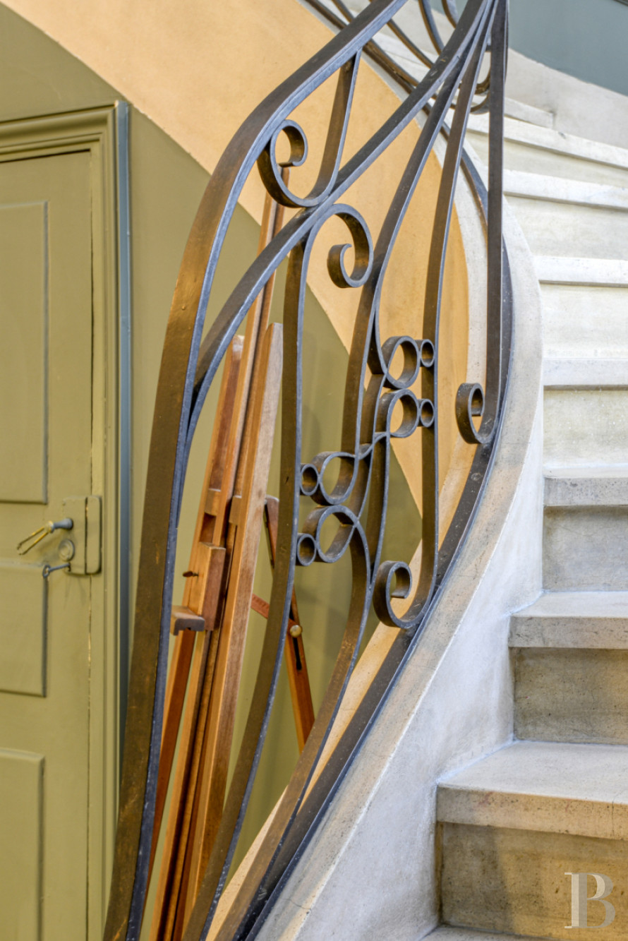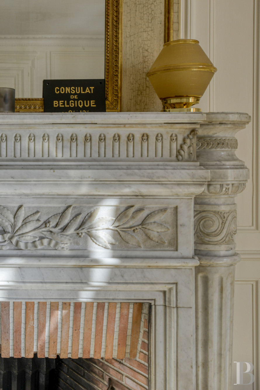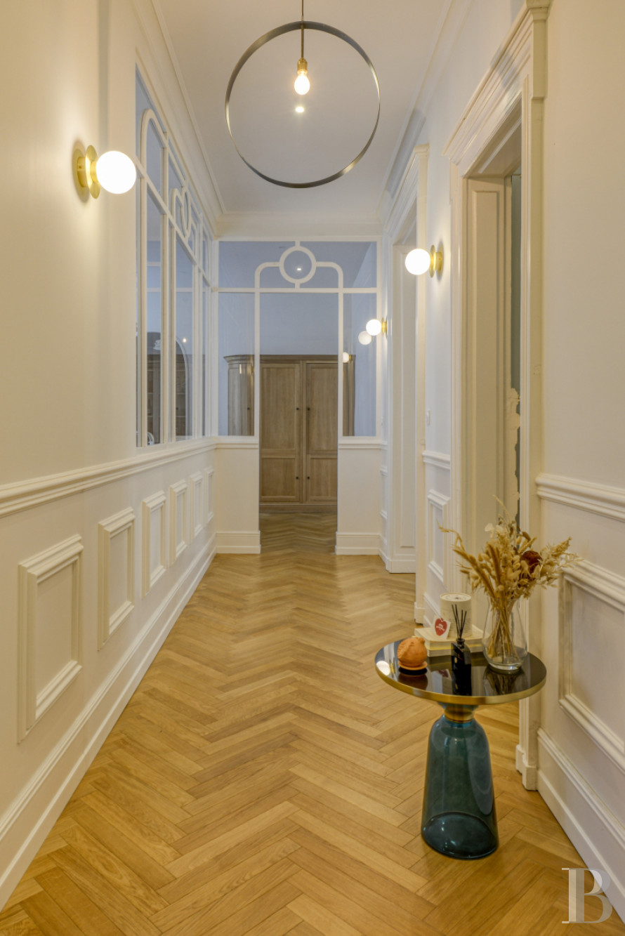 Il représente ici l’étage noble. La hauteur sous plafond de 3,60 m environ ménage de vastes volumes, mis en lumière par des baies à la fois généreuses et ordonnées, qui reflètent une volonté d’ouvrir l’intérieur sur le jardin. Dès l’entrée, apparaît un remarquable escalier suspendu en pierre. Après les premières marches en volute, le limon arrondi est majestueux, surmonté d'une rampe d'appui en ferronnerie. Dans la pièce, un carrelage à motifs géométriques reprend la couleur claire de l’escalier, qui tranche avec le noir des motifs. Tout autour, les plinthes menuisées hautes, les entourages des huisseries, ainsi que les agencements sur mesure habillent la pièce. En face, une porte s’ouvre sur un bureau qui donne sur le jardin via un balcon. Le sol est parqueté à bâtons rompus, à l'instar de toutes les pièces principales de ce niveau. Depuis l’entrée, en plus des accès vers l’étage et le niveau inférieur, un couloir dessert les pièces. Côté jardin, s'étend une salle de séjour de plus de 40 m², avec des boiseries rénovées, un faux lambris constitué d’une cimaise et des tables oblongues. Le plafond est orné de voussures en périphérie, qui adoucissent la liaison avec les murs, ainsi que d'une rosace à motifs fleuris en son centre. Deux grandes portes-fenêtres ouvrent sur l’escalier monumental de la terrasse et font de cette pièce une véritable salle de réception. Une cheminée s'élève sur le côté, entre deux niches élégamment intégrées et encadrées de moulures. Le manteau est en marbre blanc veiné, avec des piédroits de type colonnettes engagées cannelées, surmontées de chapiteaux corinthiens stylisées. Au centre, une décoration florale est sculptée sur le linteau. Un rétrécissement embrasé en brique encadre le foyer. En trumeau, se trouve un miroir avec un cadre doré. En enfilade, vers le bureau, un large passage ouvre sur une salle à manger. Ici, se retrouvent les mêmes codes dans le revêtement de sol, les décors muraux et la liaison avec le jardin. La cheminée est en marbre noir veiné, avec un manteau nettement plus sobre et moins travaillé. Côté rue, juste après l’entrée, se trouve un cabinet d’aisance spacieux, composé d’une première pièce avec un lavabo au style rétro surmonté d’un miroir de forme ovoïde encadré d’un liseré doré. Ce sas fait le lien avec des toilettes, où le sol est pavé d’un carrelage à petits carreaux hexagonaux noirs et blancs, façon mosaïque. Ensuite, une cuisine est séparée du couloir par une grande verrière de style Art déco, qui laisse pénétrer la lumière dans la circulation. La pièce est aménagée avec du mobilier en bois, fourni par un cuisiniste réputé. Le plan de travail est en marbre de Carrare. Au fond, est dissimulée une arrière-cuisine bien agencée.