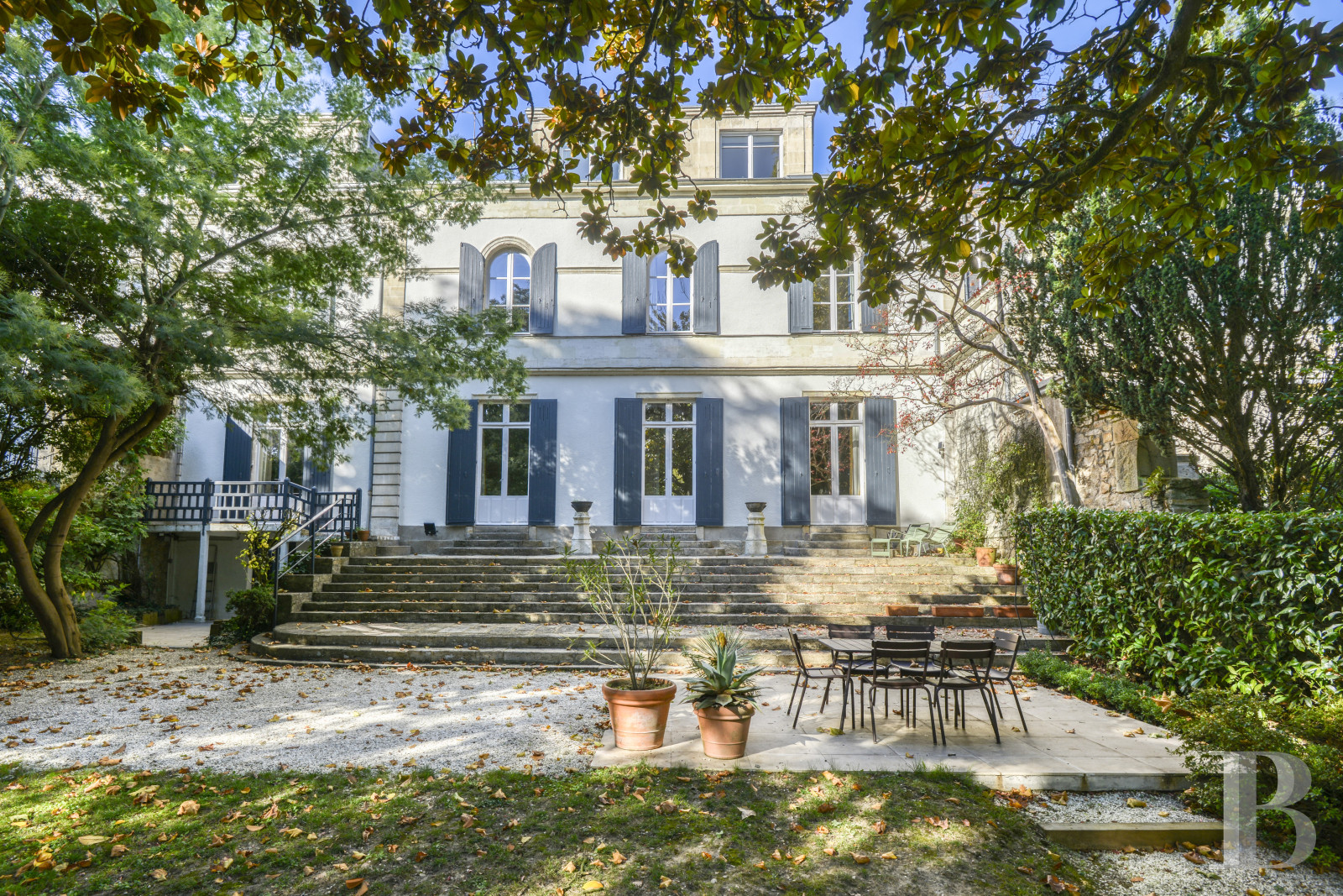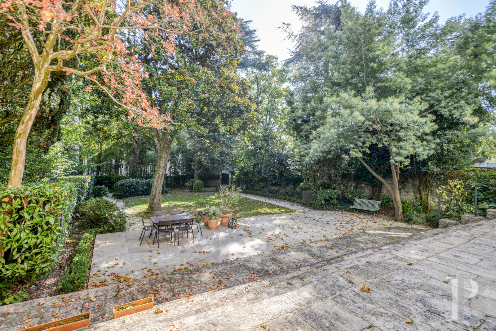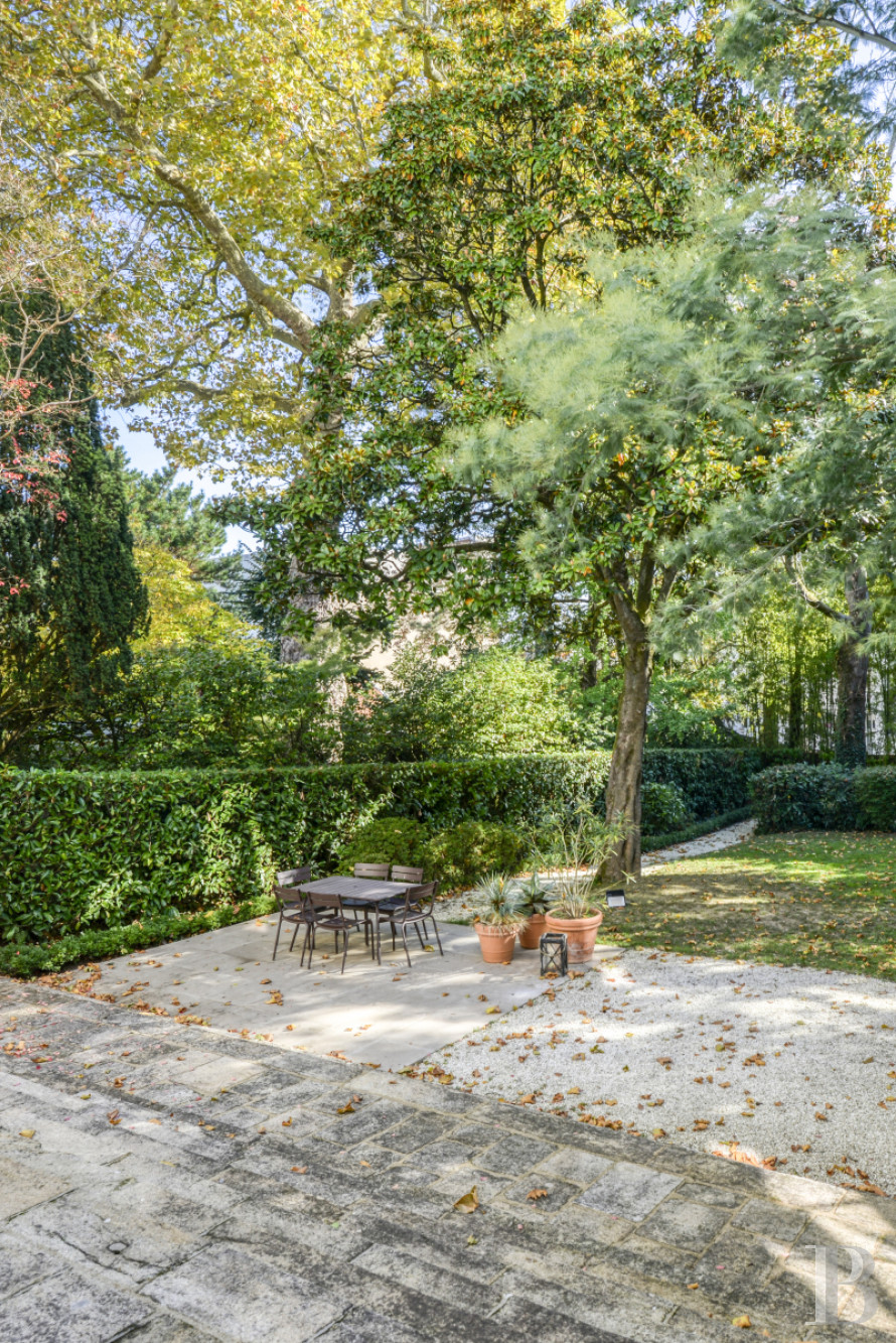 À l’arrière de la demeure, il est clos et se déploie dans une ambiance feutrée. Ombragé par de grands arbres d’ornement – magnolias, érables, conifères et lauriers – il compose un tableau végétal à la fois structuré et naturel. Le feuillage persistant de certaines essences forme un écran protecteur autour de la parcelle, tandis que les teintes variées des feuillus apportent une note saisonnière délicate. Au pied du majestueux escalier, une terrasse composée de grandes dalles, créé un espace de convivialité à l’ombre d'un magnolia. Au centre, une pelouse encadrée d'une allée de graviers permet de circuler entre les différents espaces : du vestibule jusqu’au garage et de la terrasse jusqu’à la maison.