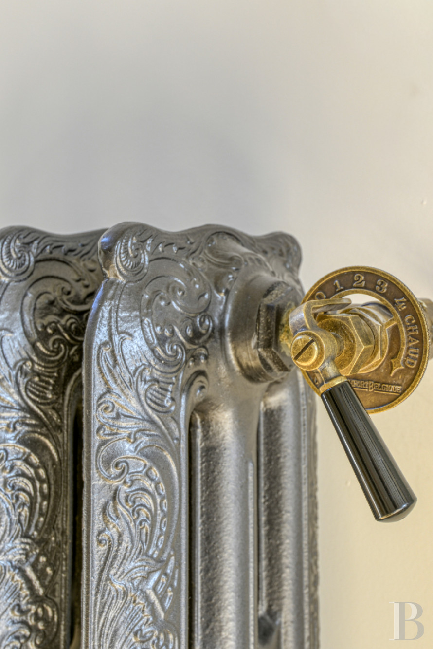 Le majestueux escalier se prolonge par un large palier en carrelage de marbre blanc, ceinturé par une bande noire. Dans le reste de l’étage, le revêtement de sol est parqueté en bois à pose droite. Le palier dessert un cabinet d’aisance, un premier ensemble et un couloir qui mène à un deuxième ensemble. Le cabinet d’aisance, bien que moins spacieux que celui du rez-de-chaussée, reprend le même esprit avec un lavabo au style rétro, carrelage hexagonale anthracite au sol, et une faïence blanche style métro parisien. Le premier ensemble est composé de deux chambres communicantes. Dans chacune, se trouve une tête de lit menuisée, avec prises encastrées. Ces détails d'agencements allient l'esthétique au confort moderne. En face, est liée une salle d’eau avec baignoire sur pied et robinetterie style rétro, ainsi qu'une douche à l’italienne habillée au sol et au mur en mosaïque à petits carreaux. Ensuite, le couloir reprend les décors de l’étage inférieur, mais de façon plus sobre avec une cimaise sans cadre en soubassement et en partie haute des panneaux à petits cadres, ainsi qu’une corniche simple. Une porte ouvre sur le second espace, composée d’une chambre confortable avec cheminée, éclairée par deux baies et doublée de deux garde-robes, d’une salle d’eau avec une baignoire, de deux douches à l’italienne et de deux lavabos sur colonnes, encadrées de deux niches de rangement.