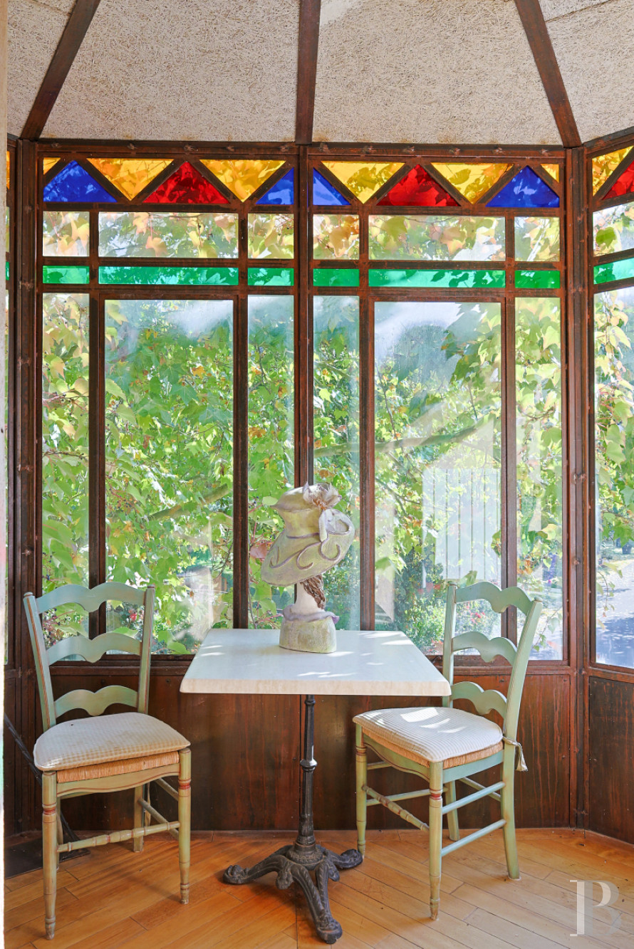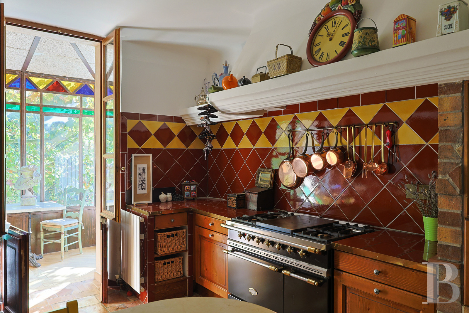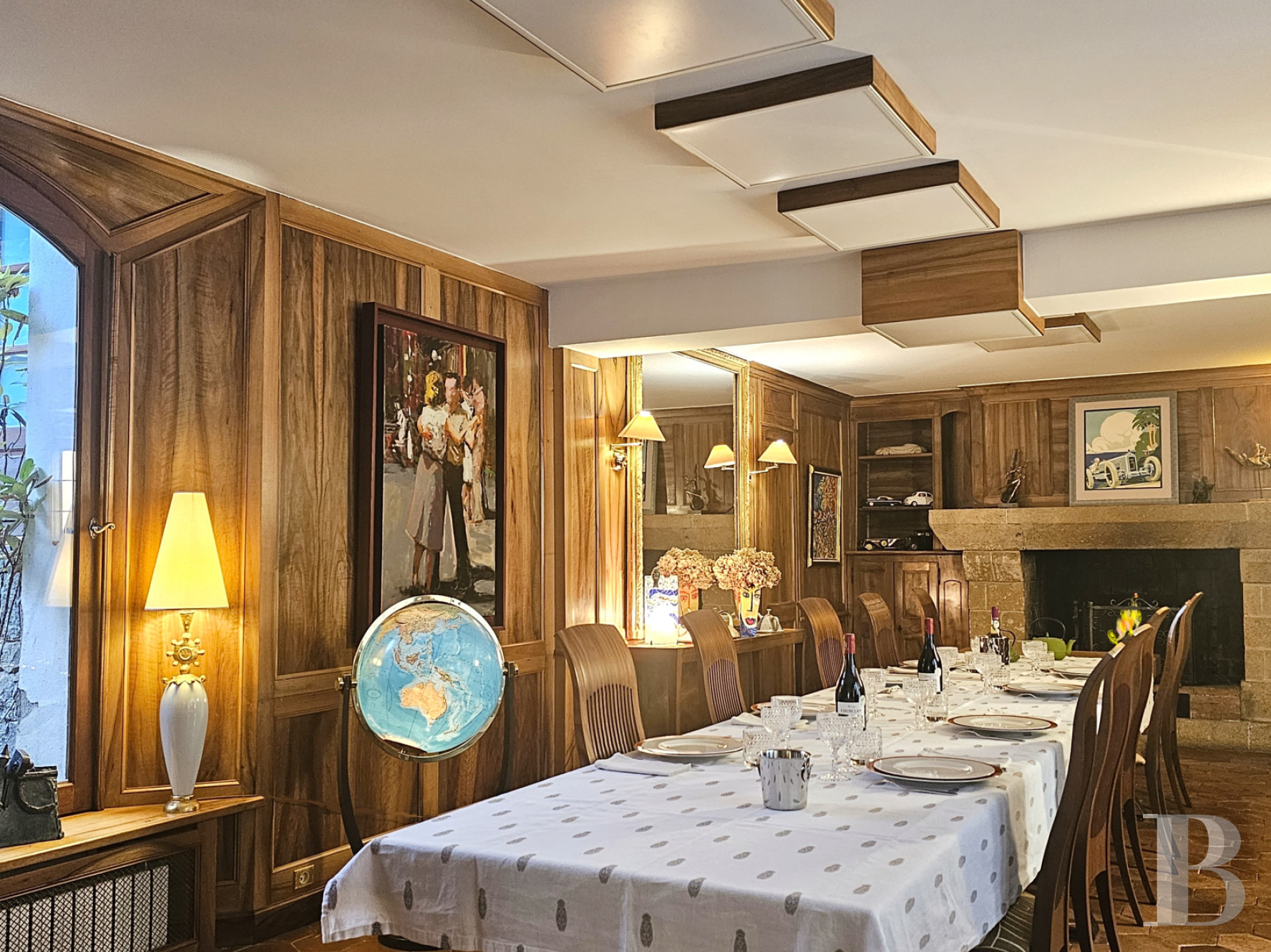 Le long de la façade principale, se succèdent une ancienne cuisine et sa loggia, un petit salon, une grande cuisine éclairée par une fenêtre de toit, ainsi qu’une chambre avec balcon et salle d’eau. Les baies, droites ou cintrées, soulignées de petits carreaux, diffusent une lumière douce. À l’opposé du grand salon, une salle à manger avec cheminée, orientée à l’ouest, donne accès, à l’arrière, à une chambre avec salle d’eau et toilettes, à une salle de cinéma de près de 30 m², ainsi qu’à un escalier secondaire vers l’étage supérieur.