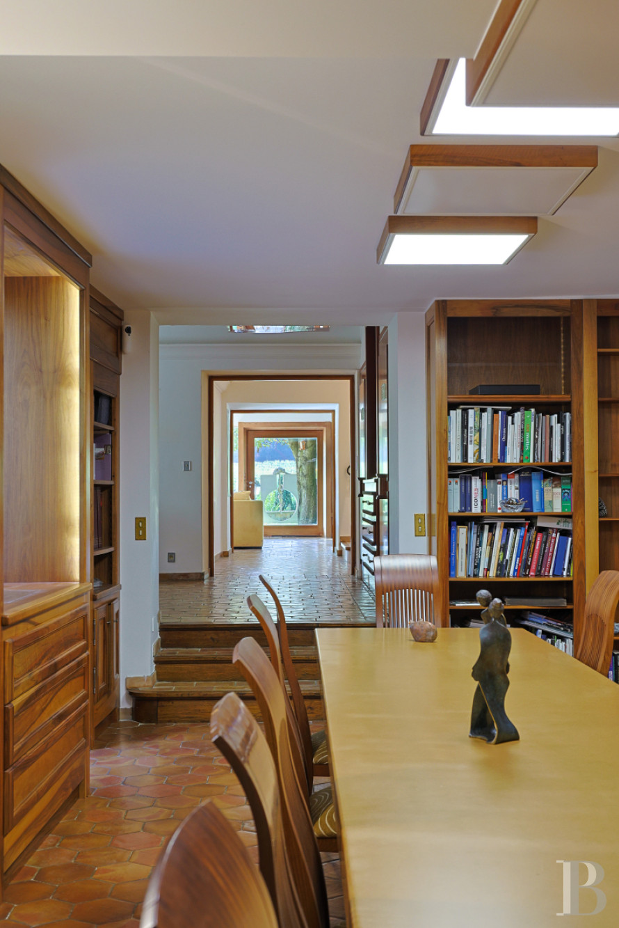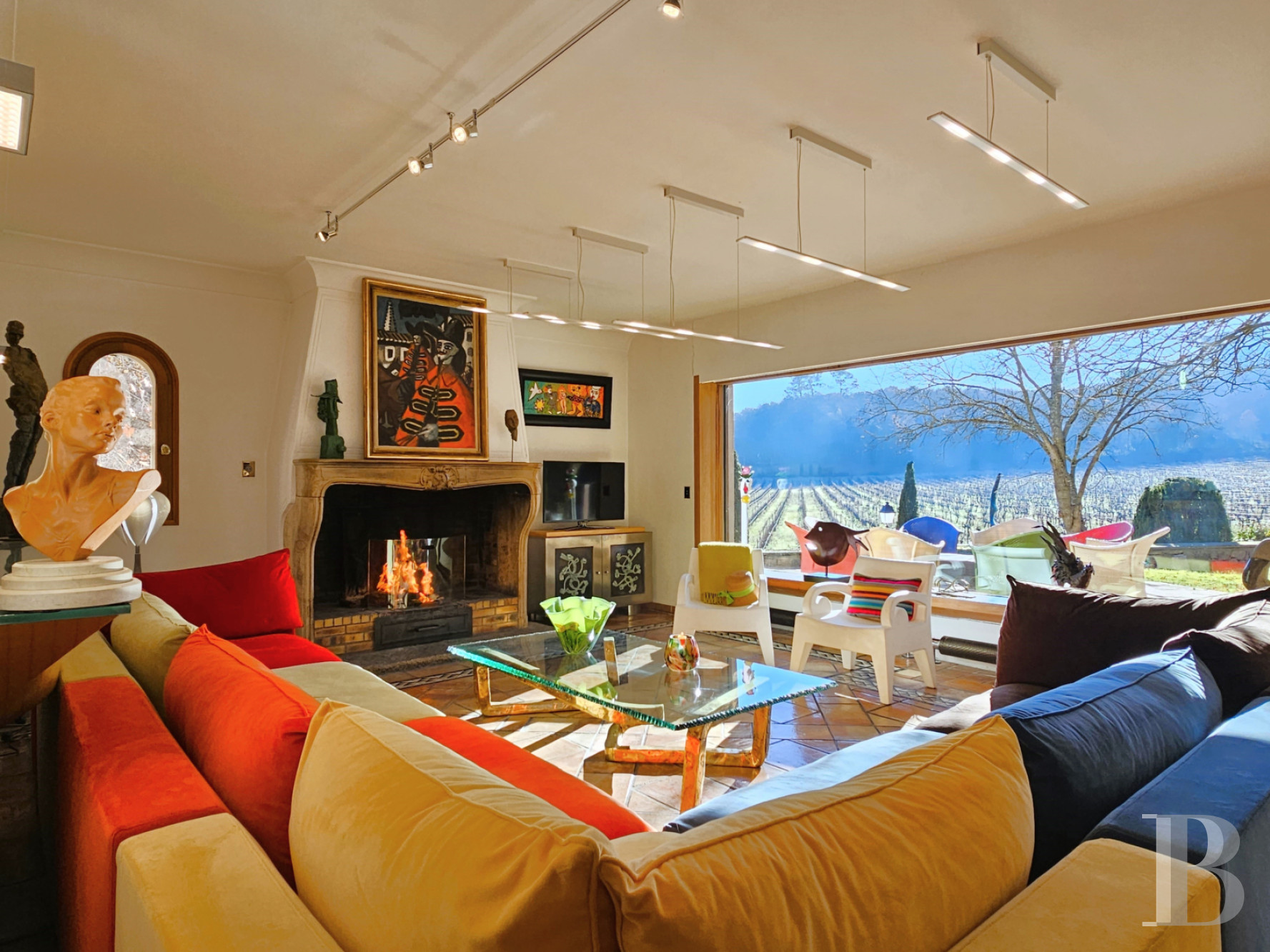 D’une superficie d’environ 500 m², elle forme l’habitation principale. Son entrée ouvre, en rez-de-jardin, sur plusieurs espaces techniques et de service : d’un côté, un double garage et une cave à vin ; de l’autre, une buanderie, une chaufferie, un second garage au fond duquel se trouve un ascenseur, ainsi que des toilettes destinées aux invités. Un large escalier, dallé de tomettes aux nez de marche en bois, conduit au premier étage où se trouvent les pièces de réception. À l’extrémité sud, un vaste salon d’environ 40 m², inondé de lumière et avec cheminée, ouvre sur une terrasse par une large baie vitrée et une porte-fenêtre. De cet espace, la vue embrasse les vignes et les collines.