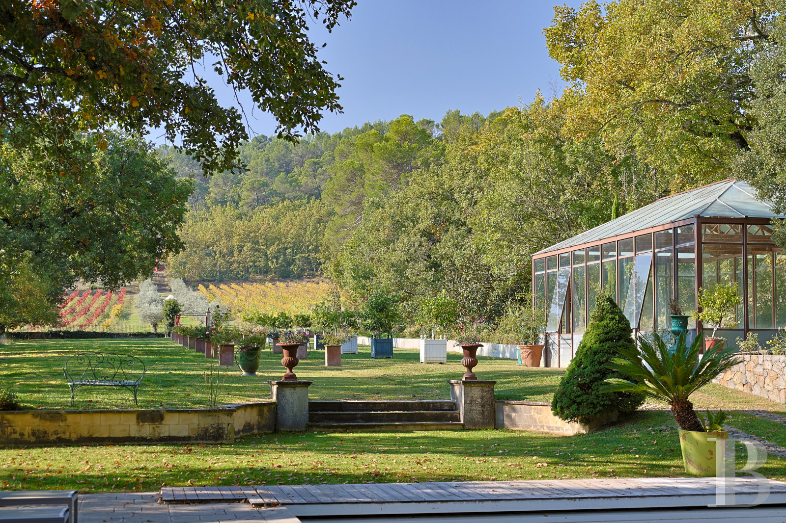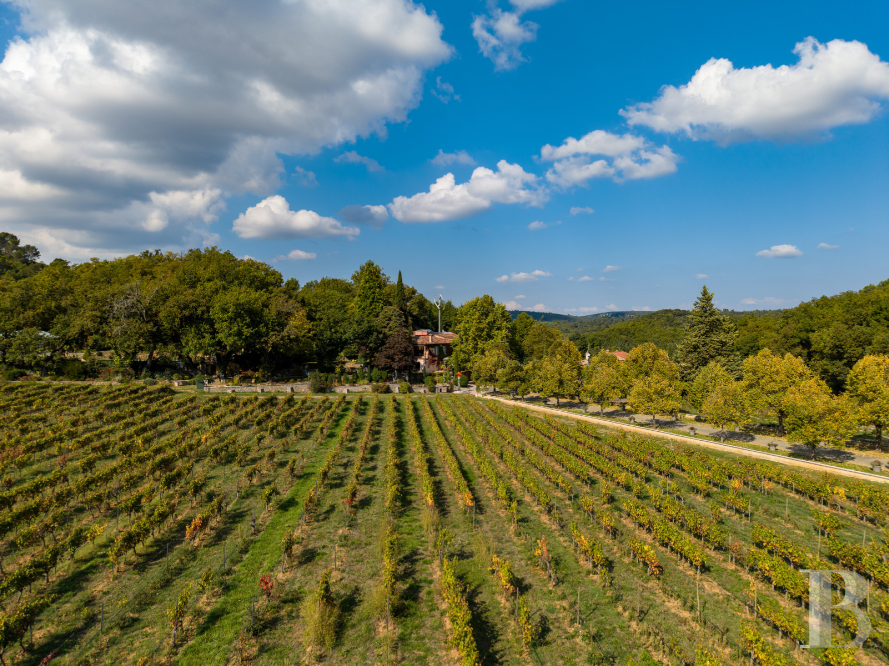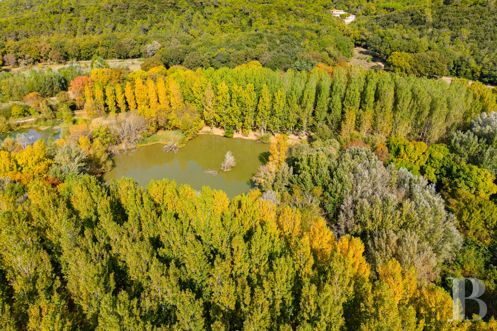 Au-delà du potager et du jardin d’agrément, la propriété s’étend sur plus de 250 ha. Les terres alternent entre parcelles de vignes en fermage – une vingtaine d’hectares avec accès à l’eau – bois, forêts de chênes et de chênes truffiers, peupleraies, cèdres et oliveraies en production. Entre monts et vallons, ce vaste ensemble, à la fois agricole et paysager, compose une mosaïque de vues changeantes où se répondent les lignes de crêtes et les étendues cultivées. À l’extrême nord du domaine, la rivière et son étang sont bordés de peupliers.