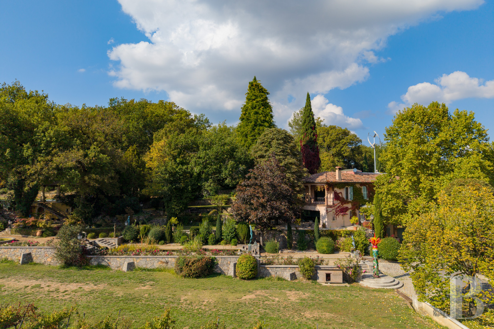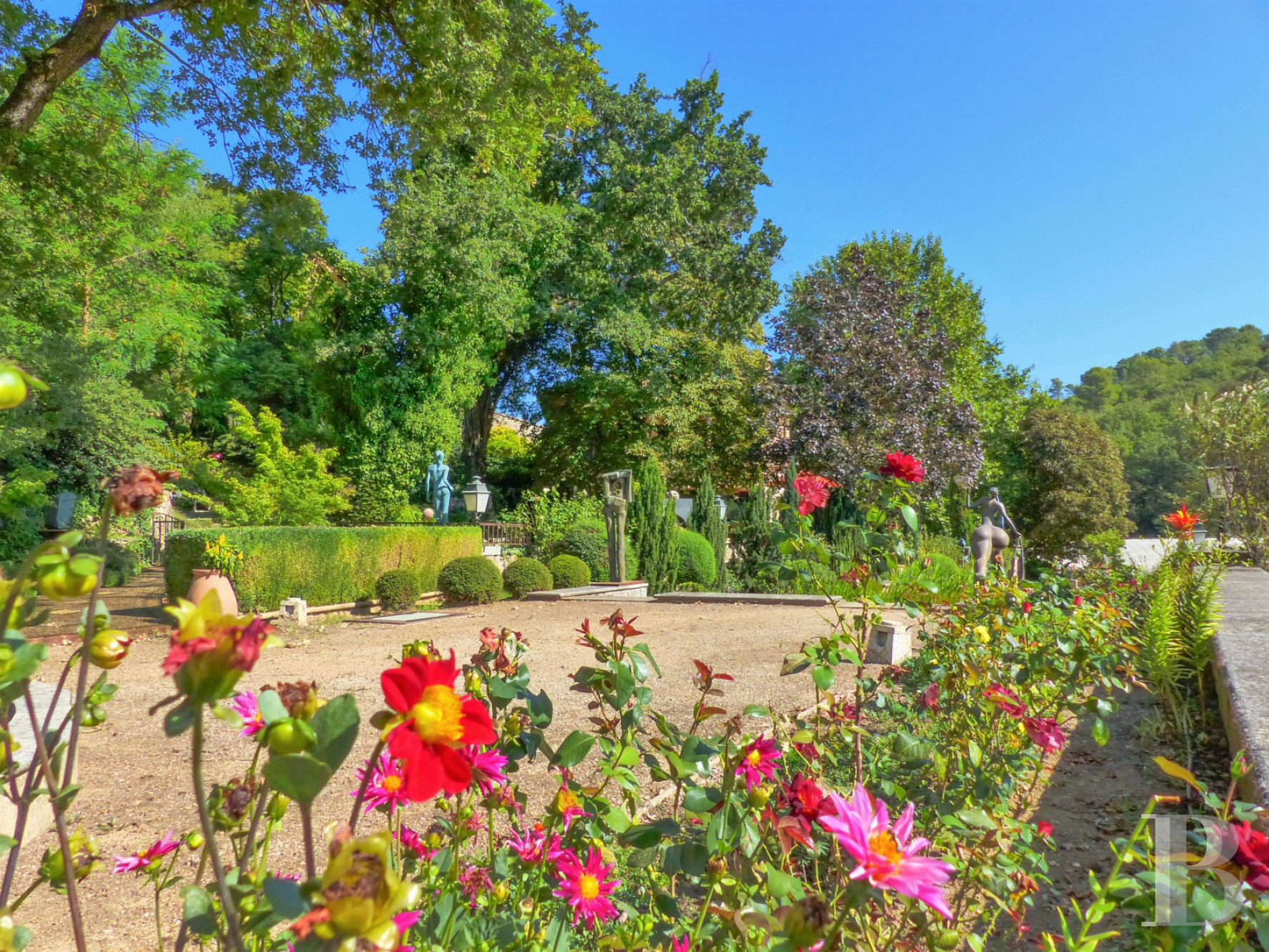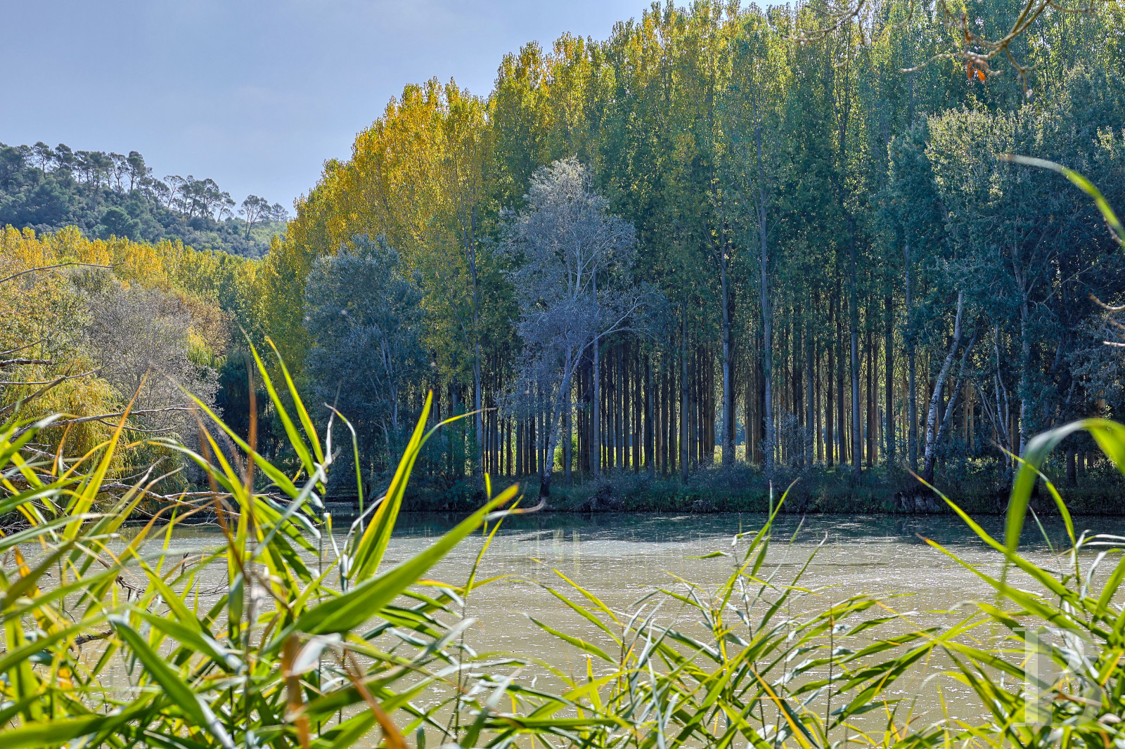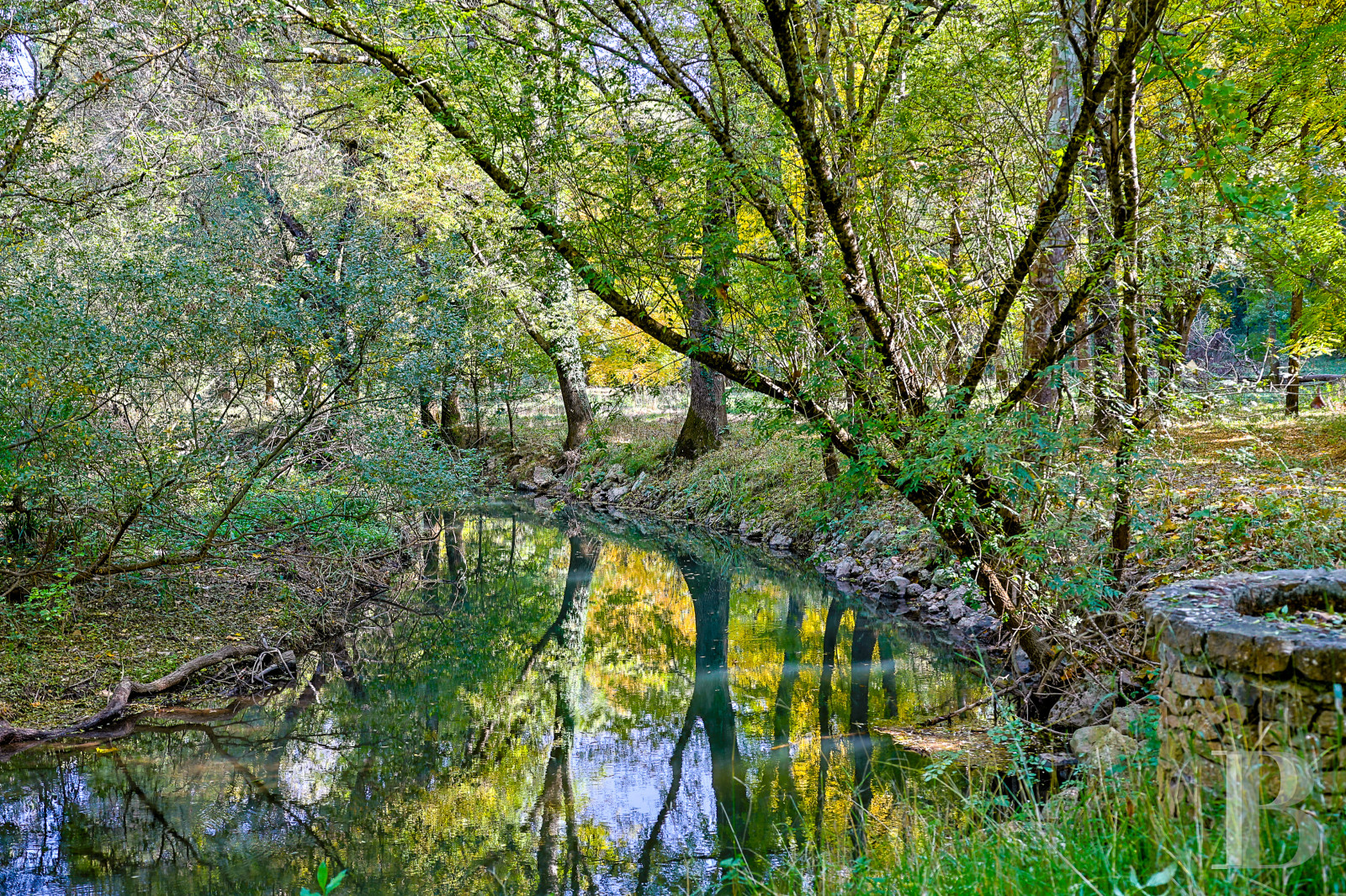 Au-delà du potager et du jardin d’agrément, la propriété s’étend sur plus de 250 ha. Les terres alternent entre parcelles de vignes en fermage – une vingtaine d’hectares avec accès à l’eau – bois, forêts de chênes et de chênes truffiers, peupleraies, cèdres et oliveraies en production. Entre monts et vallons, ce vaste ensemble, à la fois agricole et paysager, compose une mosaïque de vues changeantes où se répondent les lignes de crêtes et les étendues cultivées. À l’extrême nord du domaine, la rivière et son étang sont bordés de peupliers.