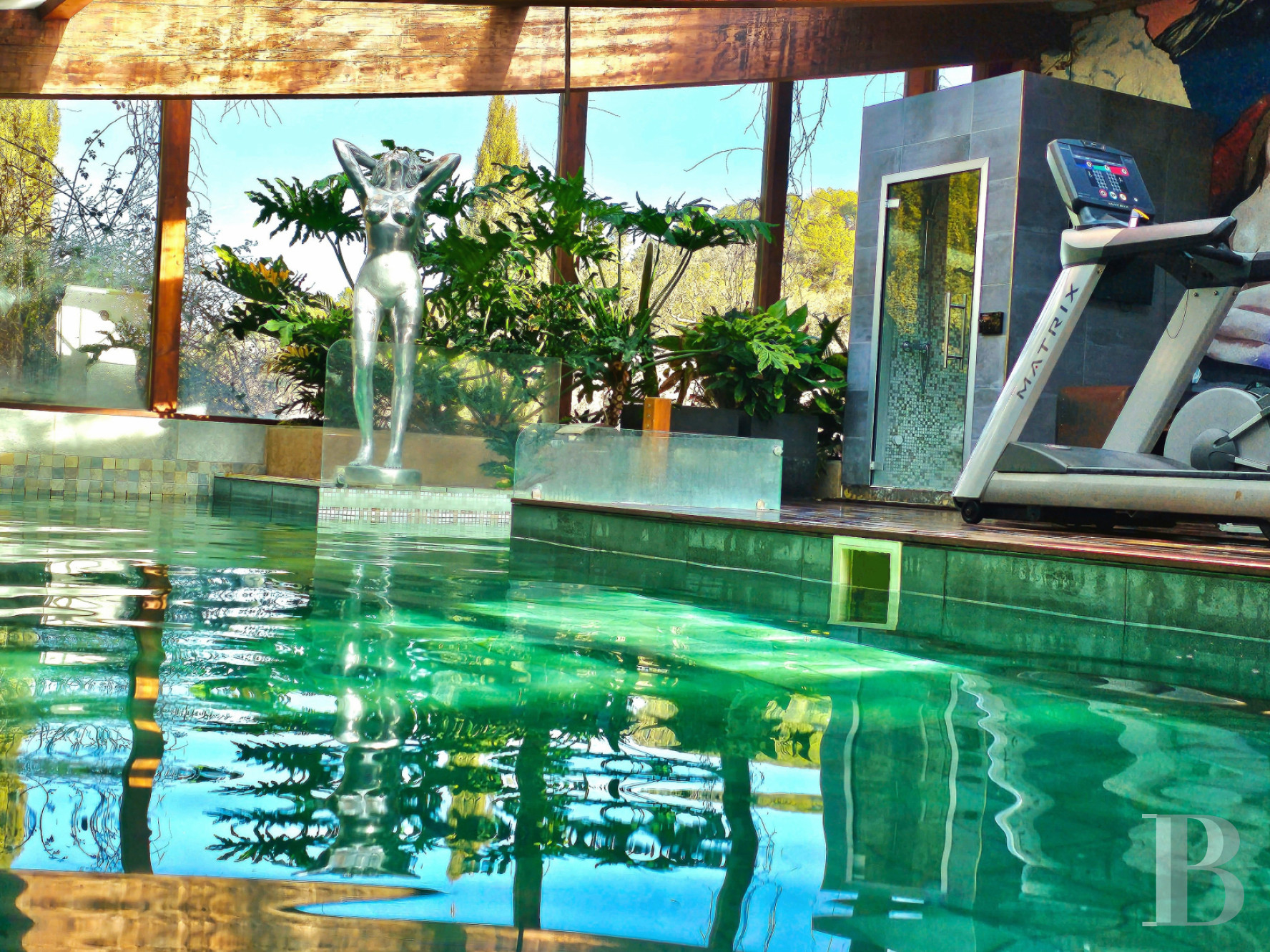 Desservi par l’escalier principal ou un escalier secondaire, le dernier niveau, parqueté, regroupe dans sa partie sud une vaste chambre principale adossée à une garde-robe, à une salle d’eau et à deux bureaux. La chambre et l’un des bureaux ouvrent sur un large balcon couvert, protégé de garde-corps en fer forgé. Plus loin, deux autres chambres comptent chacune une salle d’eau privative. Enfin, un espace largement vitré, très lumineux, dévoile une piscine intérieure de 10 m de long, un sauna et un hammam, sur un parquet en bois exotique.