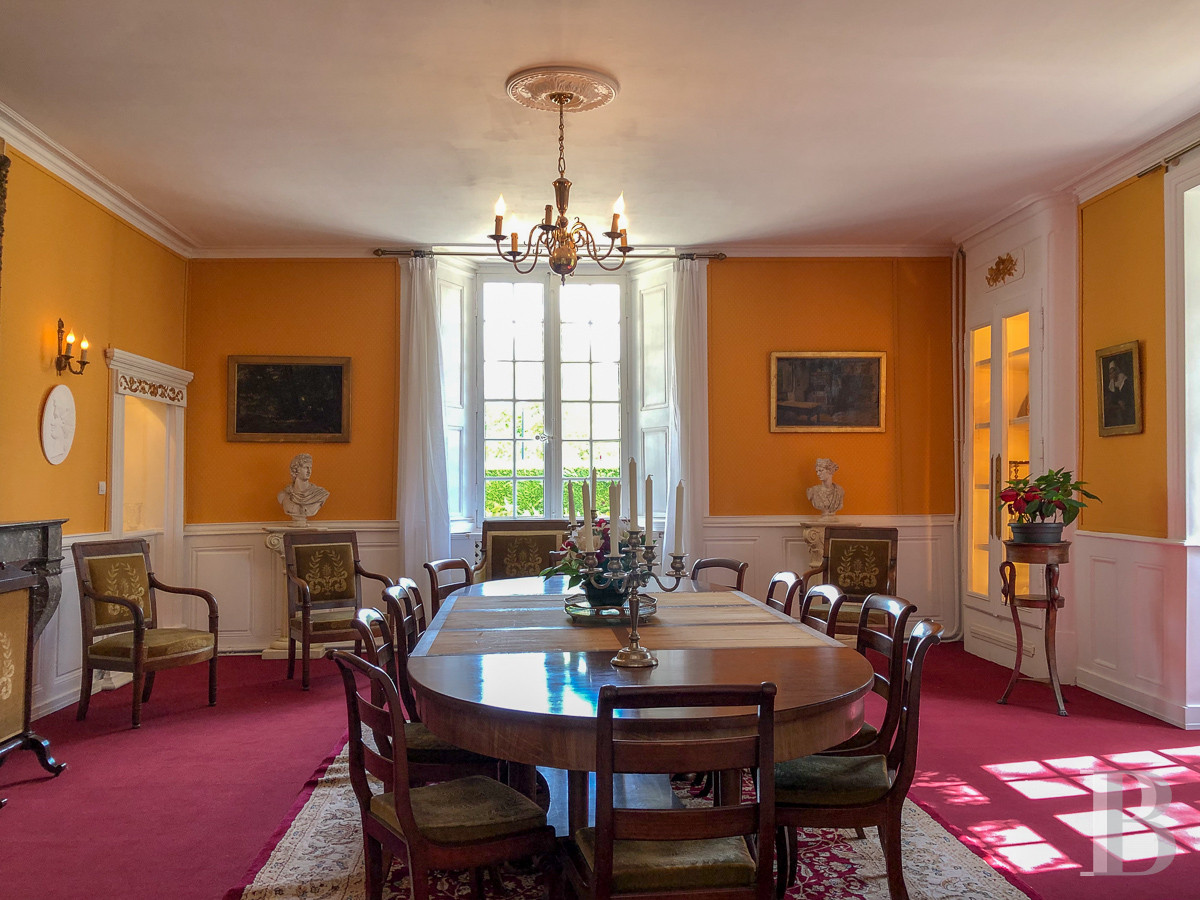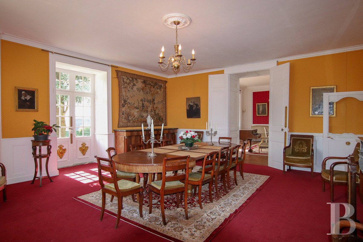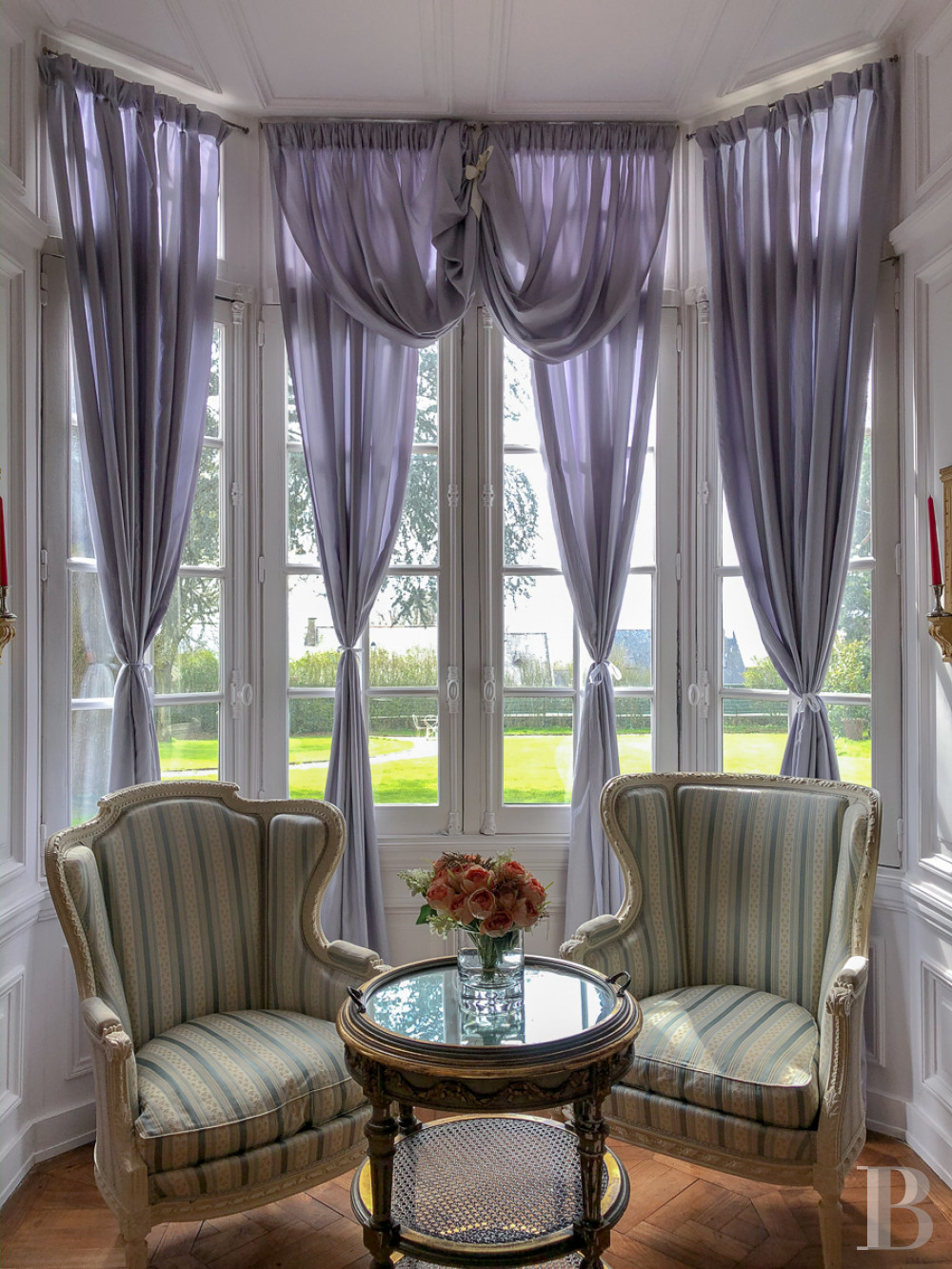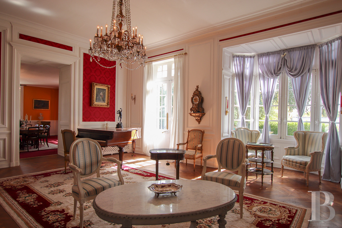 L’accueil se fait par une vaste entrée lumineuse, dont les murs sont couverts de panneaux Louis XV et de pilastres cannelés. Le vestibule dessert d’un côté deux salons en enfilade avec cheminées en marbre, boiseries et portes du 18e s. Ils sont éclairés par de grandes baies et un bow-window. Les hauteurs sous plafond sont conséquentes et le plafond est orné de rosaces et de lustres. L'un est parqueté à bâtons rompus. Le sol de l'autre salon est moquetté.