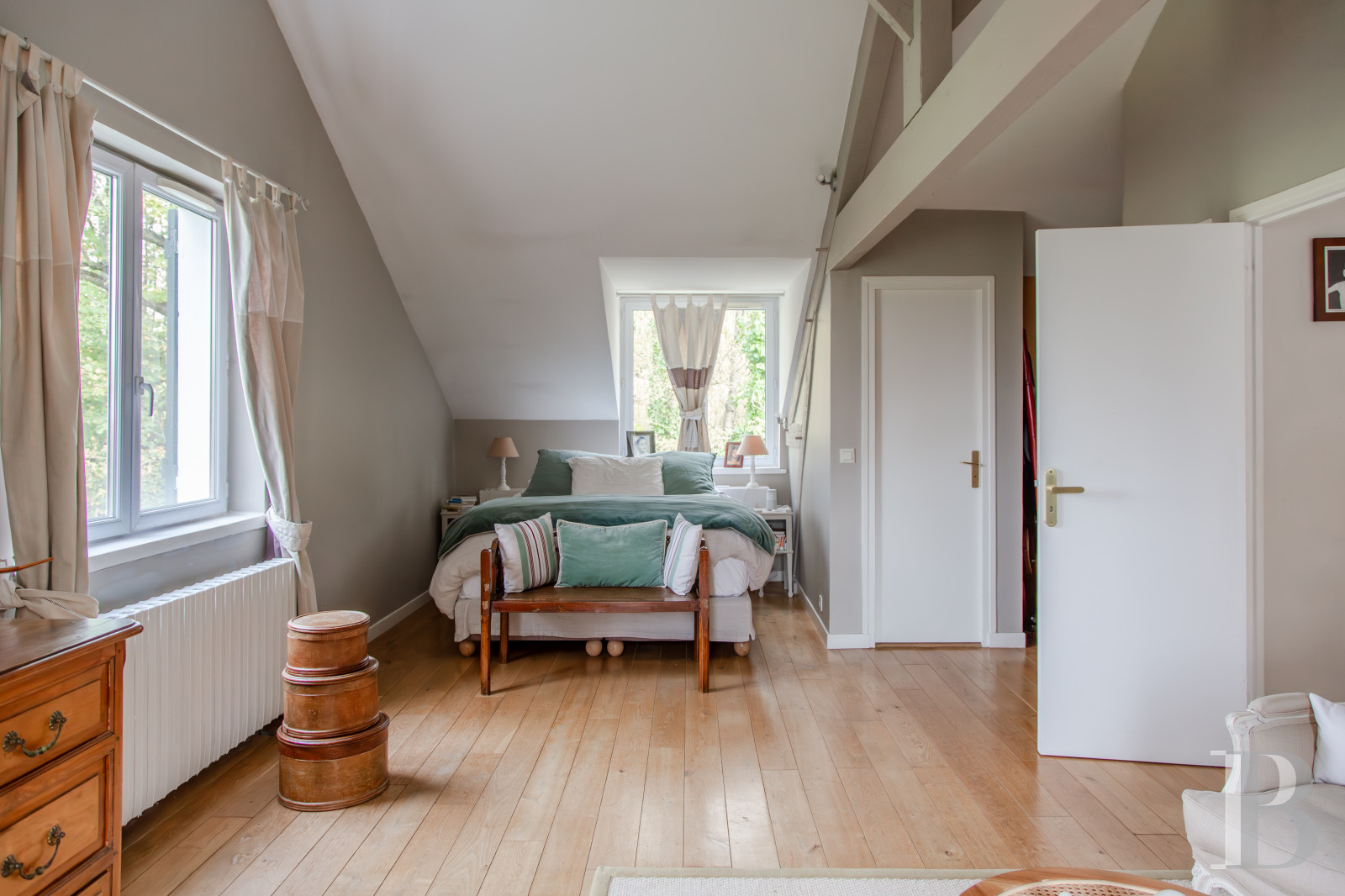 Accessible depuis l’entrée qu’il surplombe de six marches pour s'adapter à la pente du terrain, le vaste niveau est précédé d'un palier ouvert sur l’espace de réception. Le sol est en parquet clair. Il distribue cinq chambres – dont une petite de près de 7 m² – regroupées en deux ensembles et chacune dotée d’une salle de bains. Toutes les pièces ont un sol parqueté en harmonie avec celui du palier et bénéficient de grandes fenêtres donnant sur le jardin, qui inondent l’intérieur d’une abondante lumière. Un escalier mène l’étage.