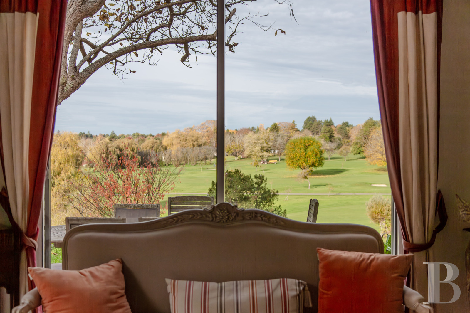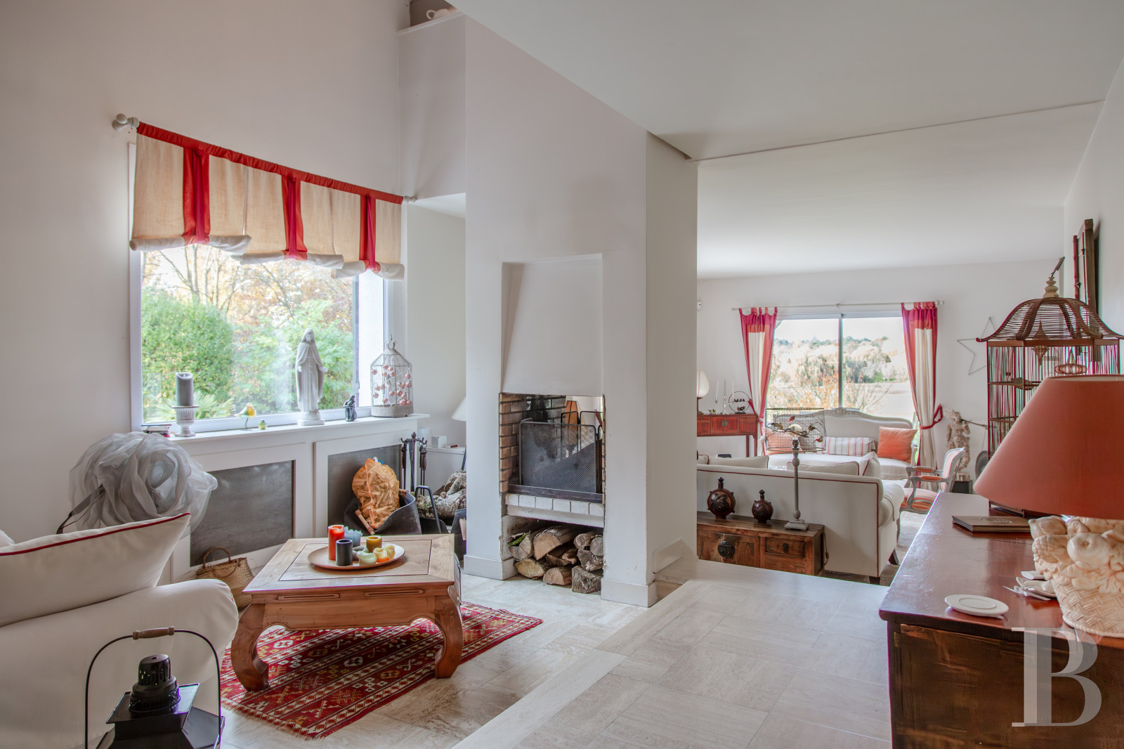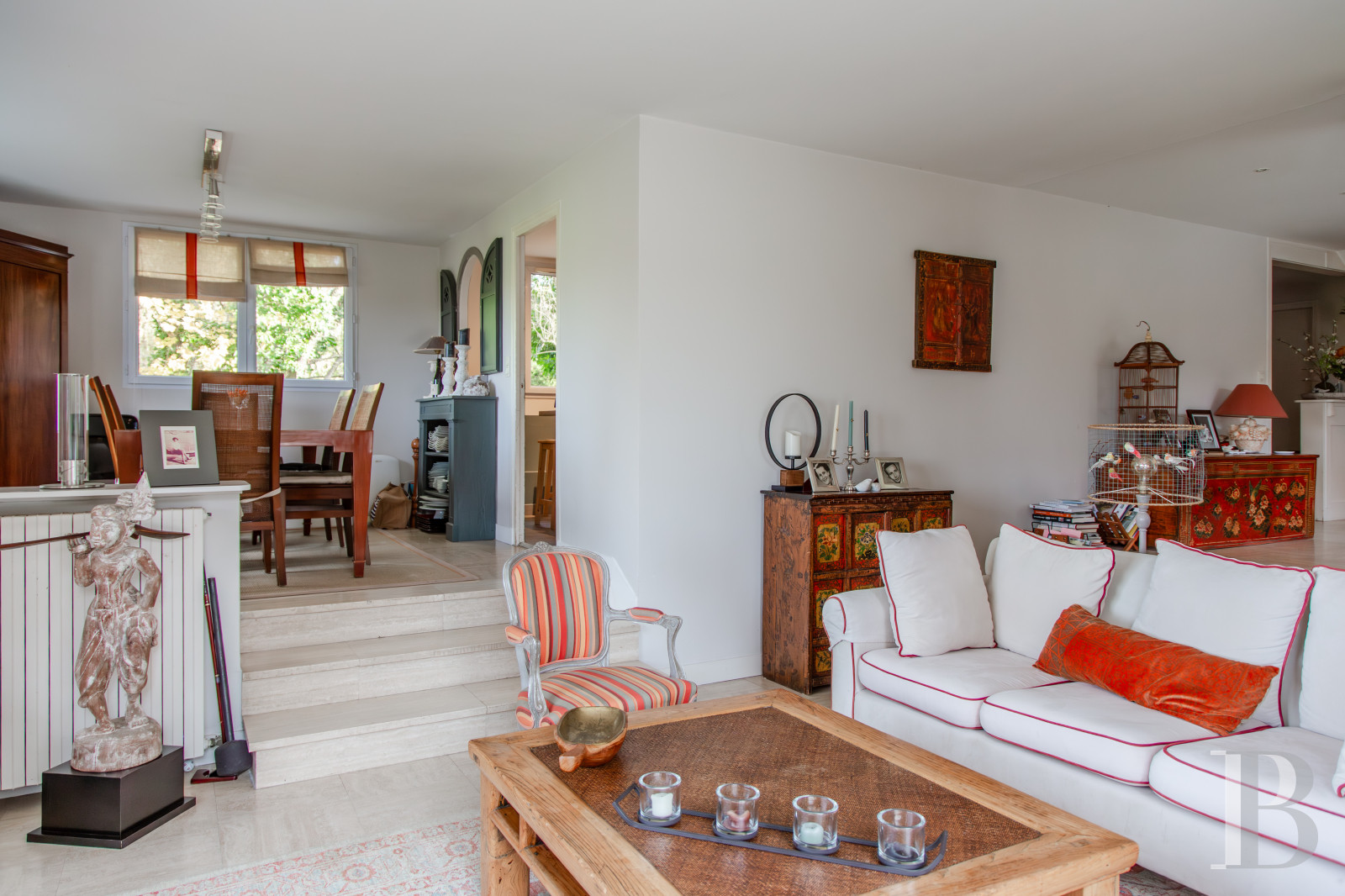 Trois marches distinguent subtilement le petit salon du grand, ce dernier étant ouvert sur la salle à manger. Une vaste baie vitrée donne sur la terrasse et le jardin, offrant en toute saison un tableau exceptionnel : parc boisé aux couleurs changeantes et pelouses soigneusement entretenues du golf, dont la beauté accompagne chaque moment vécu dans la maison.