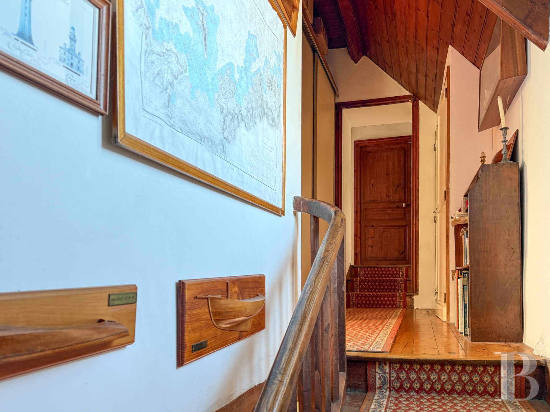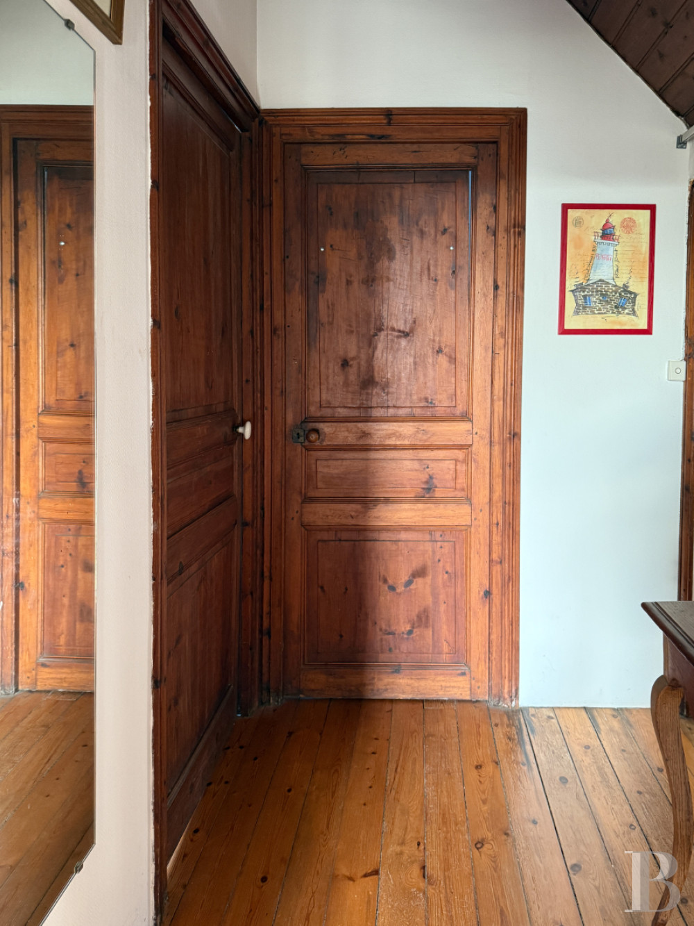 This level is accessible via a solid wooden staircase that leads to an initial landing with hardwood floors, which then communicates with a bedroom as well as a small artist’s studio. Featuring many cupboards, white walls and oak-colour, wood-panelled ceilings, a few steps lead to a second corridor, which provides access to two large bedrooms and a separate lavatory. With original straight-plank hardwood floors, visible ceiling beams, and primarily double-glazed or thick single-glazed windows, this level, where wood plays a prominent role, also provides many unobstructed views of the sea thanks to two hanging dormer windows on its gable end.