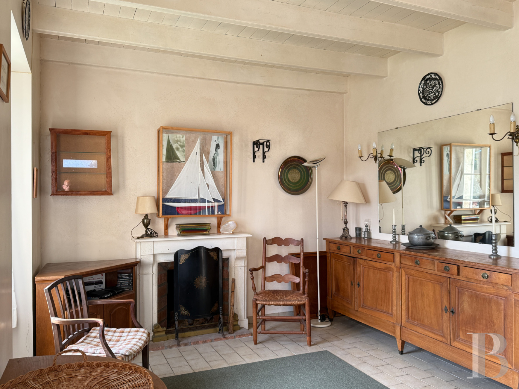 The dwelling’s main entrance is accessible via a couple of front steps that lead to a wooden door topped with a fanlight, which opens on to an immense living room with enchanting views of the sea. With cream-colour walls and floors, which contrast with its current occupants’ antique wood furniture, its granite fireplace was restored and a wood-burning stove has now replaced its original hearth.