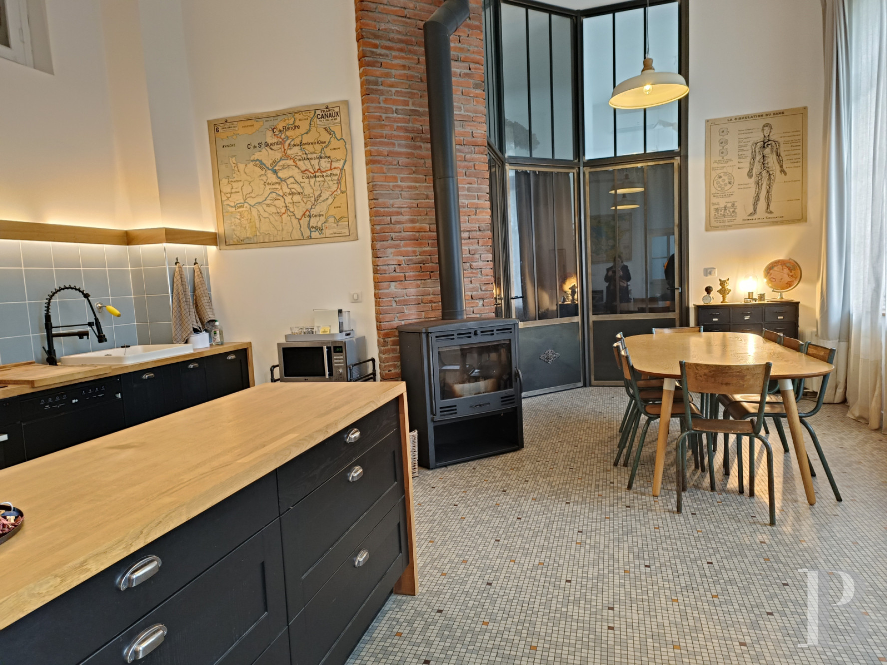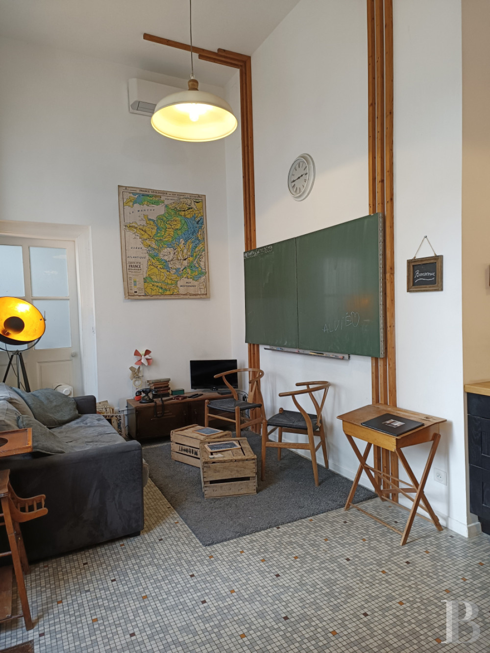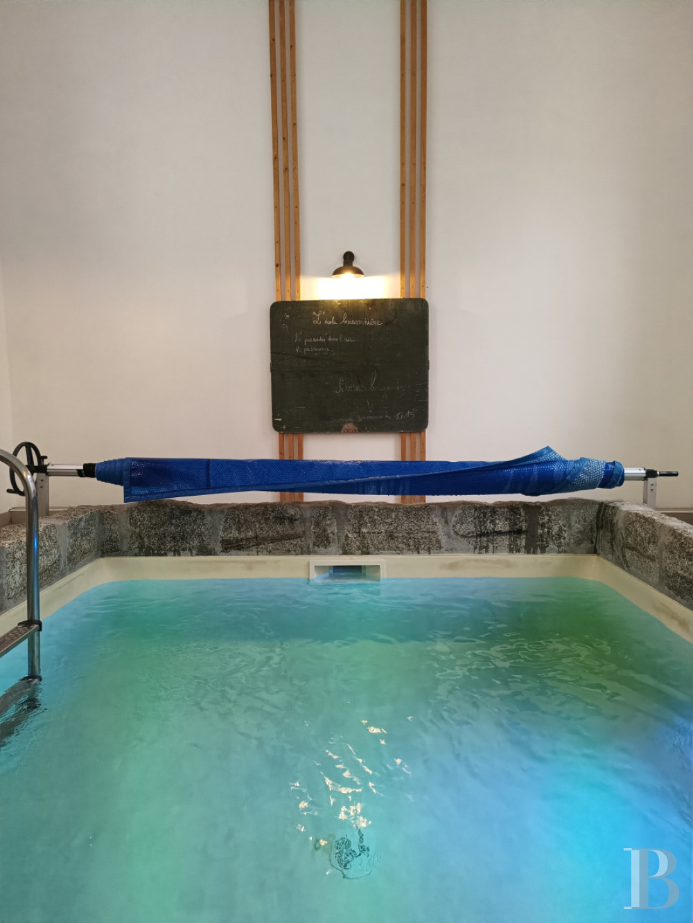 Depuis la cour, le réfectoire a été transformé en spa avec piscine intérieur de 3 x 3 m, pour 1,10 m de profondeur. Le bassin est chauffé et équipé d'un système de nage à contre-courant. Une autre classe, elle aussi accessible par la cour, a été aménagée en atelier.