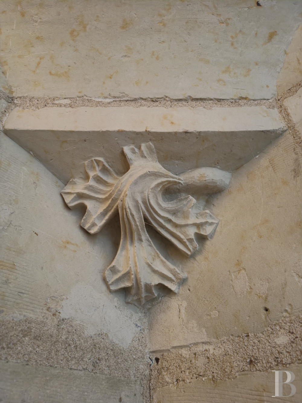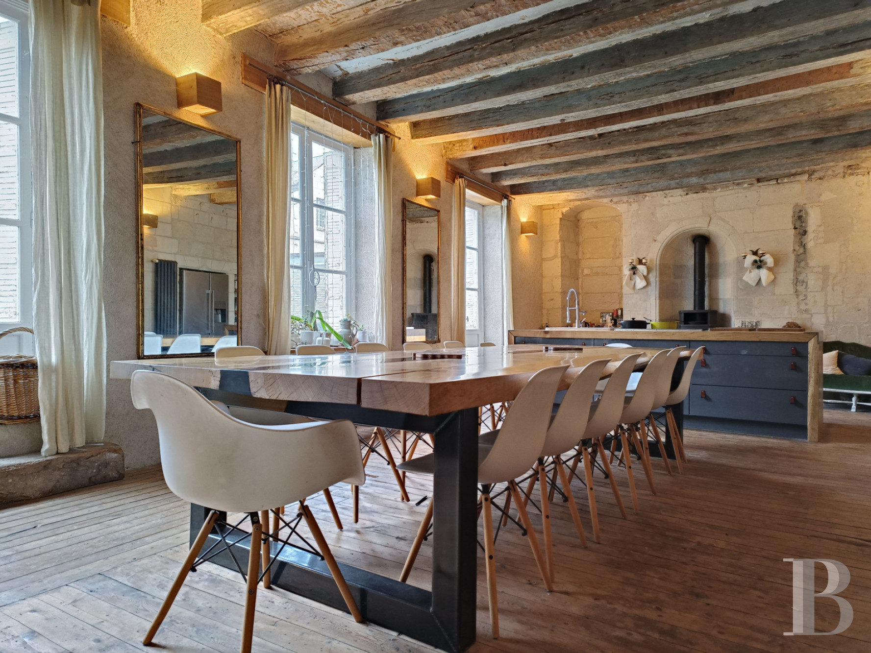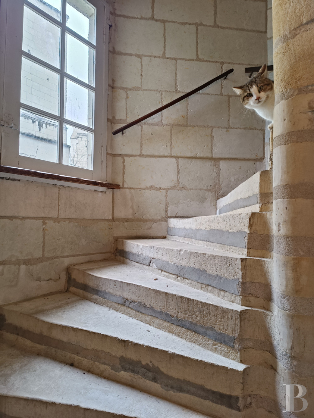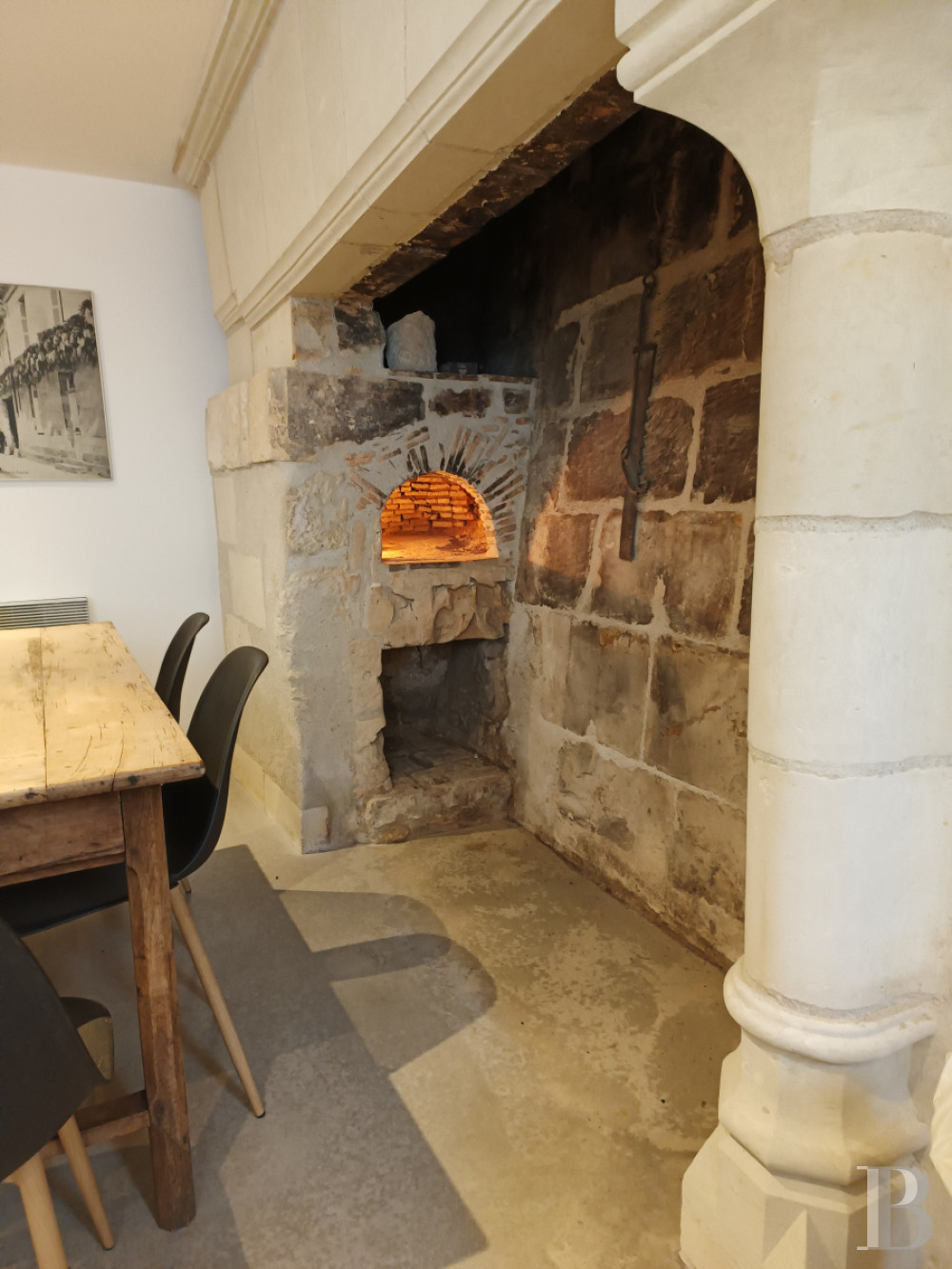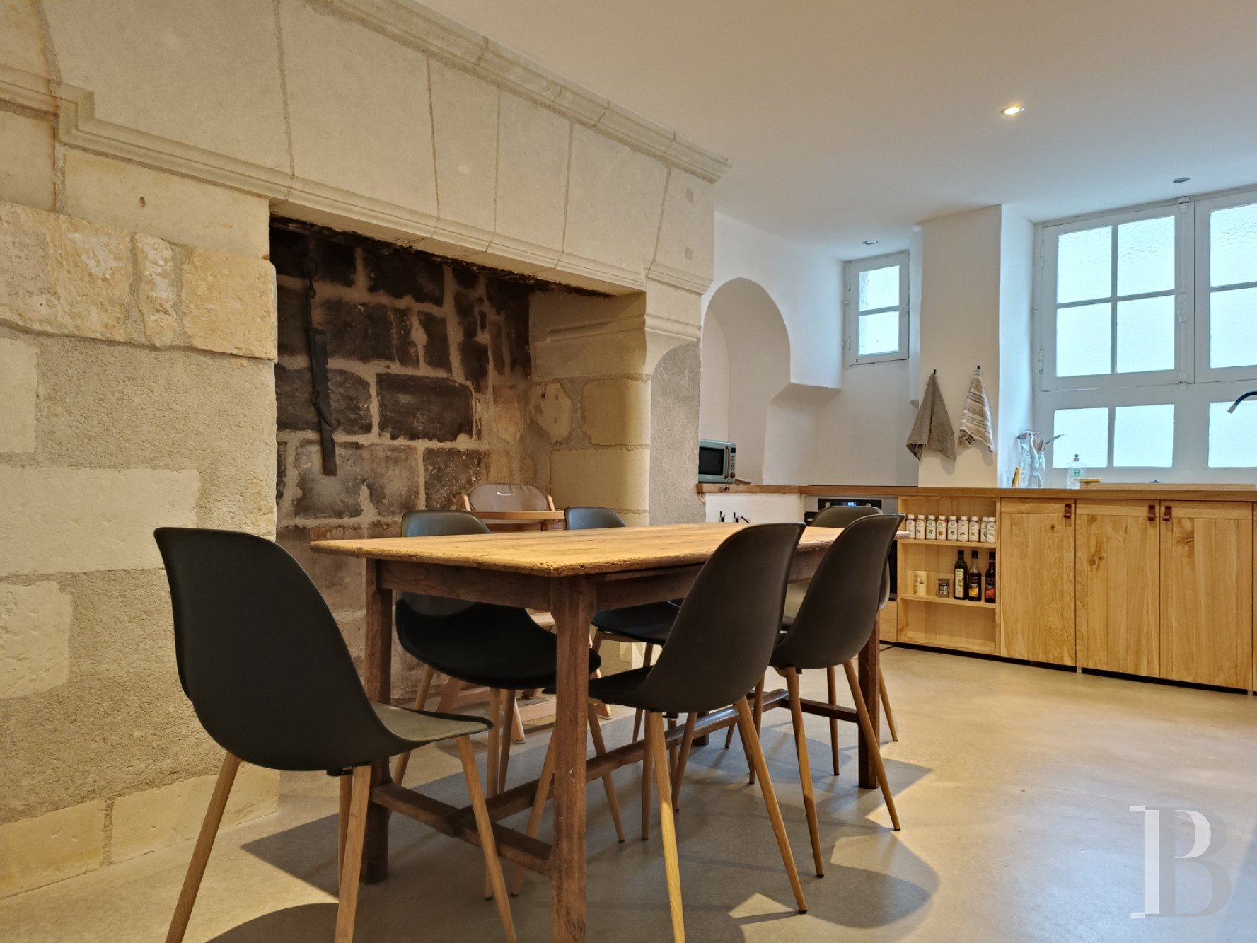 Il abrite des pièces à vivre, dont une vaste salle à manger avec cuisine, équipée d'un poêle à bois. Daté de 1890, le sol est parqueté à lames droites. Le plafond était autrefois peint en grisaille florentine, dont les vestiges sont encore visibles. Cette technique permet de créer un effet de profondeur. S'ensuit un salon, avec vue sur la rue. Une cheminée en tuffeau, aux bords arrondis, est adossée à l'un des murs. Le sol est carrelé en terre cuite. Remis au jour lors de la dernière restauration du bâtiment, en 2017, les plafonds sont remarquables, peints de motifs ocre, de rosaces et d'initiales sur fond bleu. Ils pourraient être classés, à la discrétion du futur occupant des lieux.